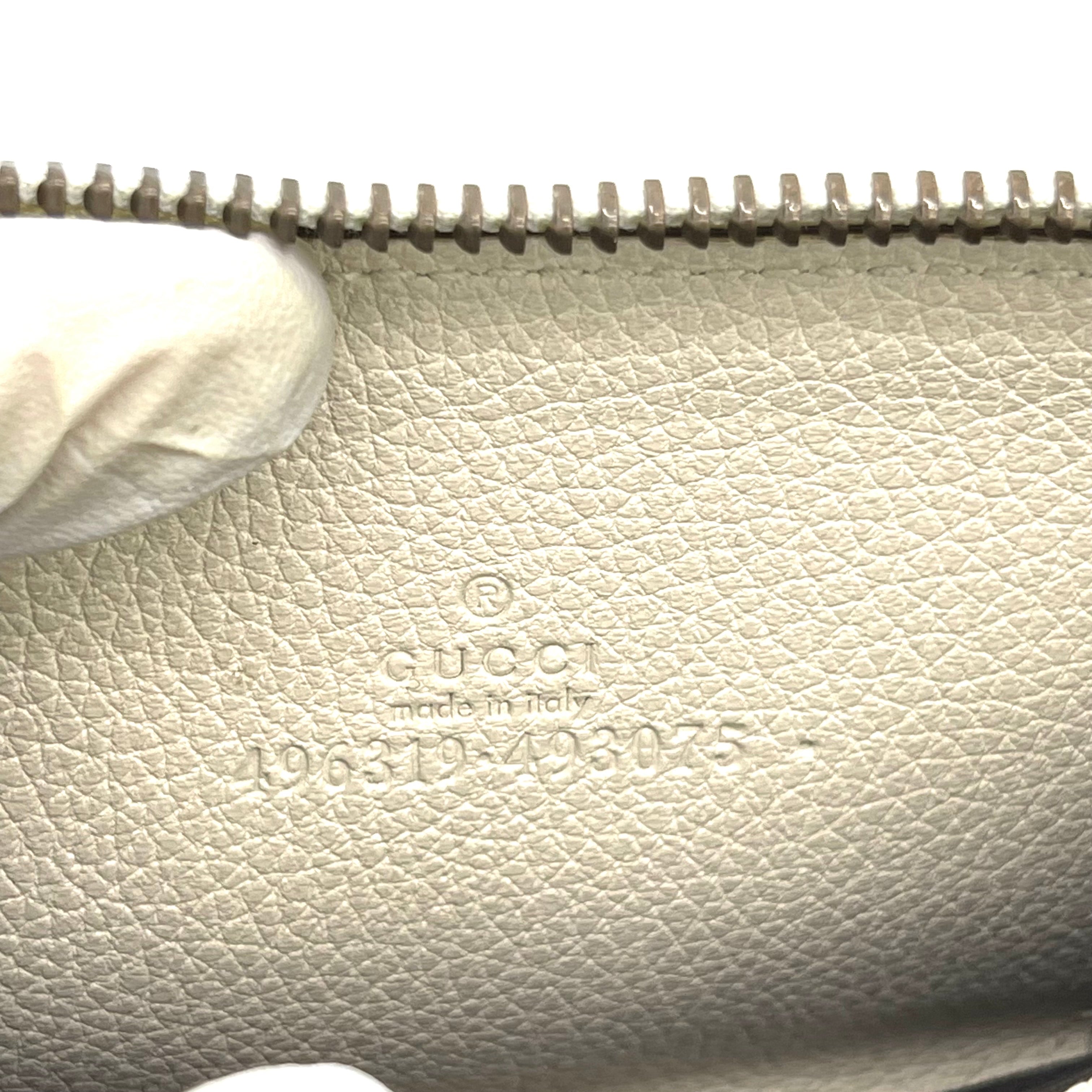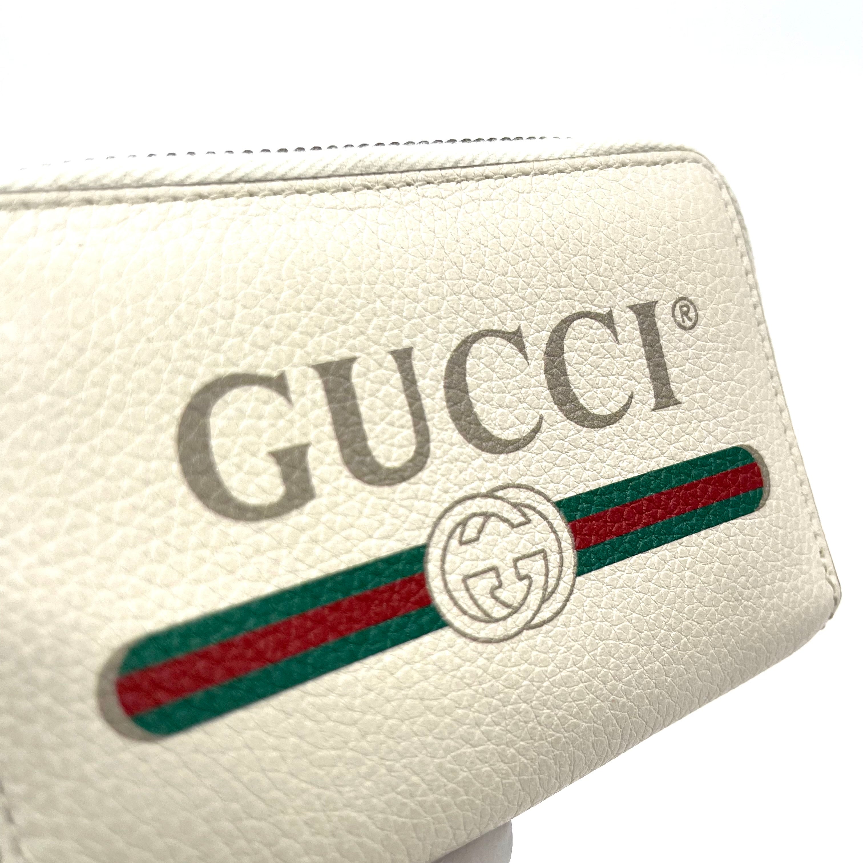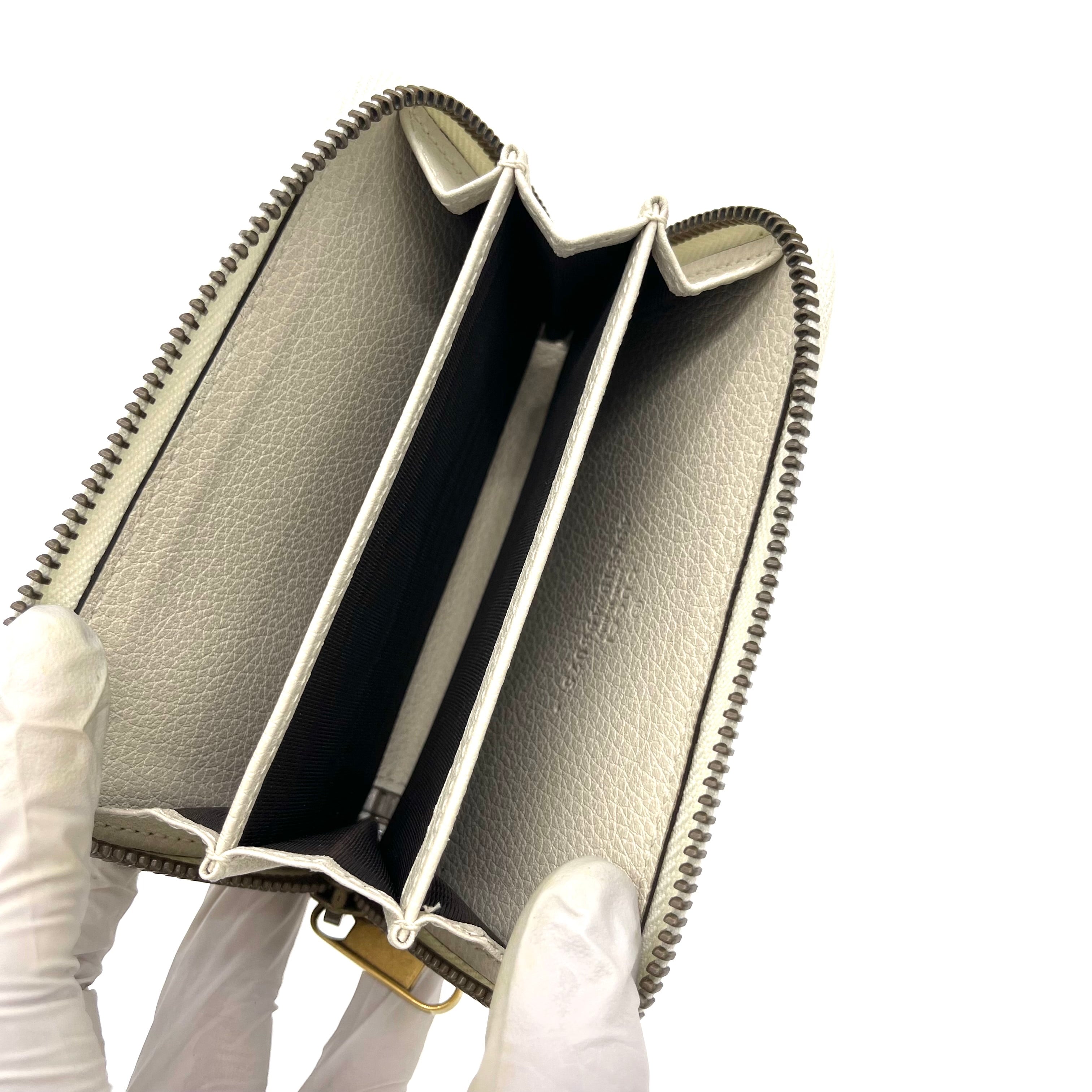 정품 GUCCI 송아지 가죽 로고 지퍼 어라운드 화이트 카드 케이스입니다. 이 스타일리시한 지갑은 화이트 색상의 아름다운 결을 지닌 송아지 가죽으로 제작되었으며 그린과 레드 색상의 구찌 빈티지 로고가 새겨져 있습니다. 브라스 랩 어라운드 지퍼를 열면 분리된 화이트 가죽과 브라운 패브릭 내부가 보입니다.