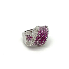 This is 18K White Gold with Pink Crystal Ring. Pink color glow like fushia color and it does shine like purple ruby. The design of this ring has big curve in the middle starts from left bottom to the top of right. It matches with classic achromatic color outfits. With this