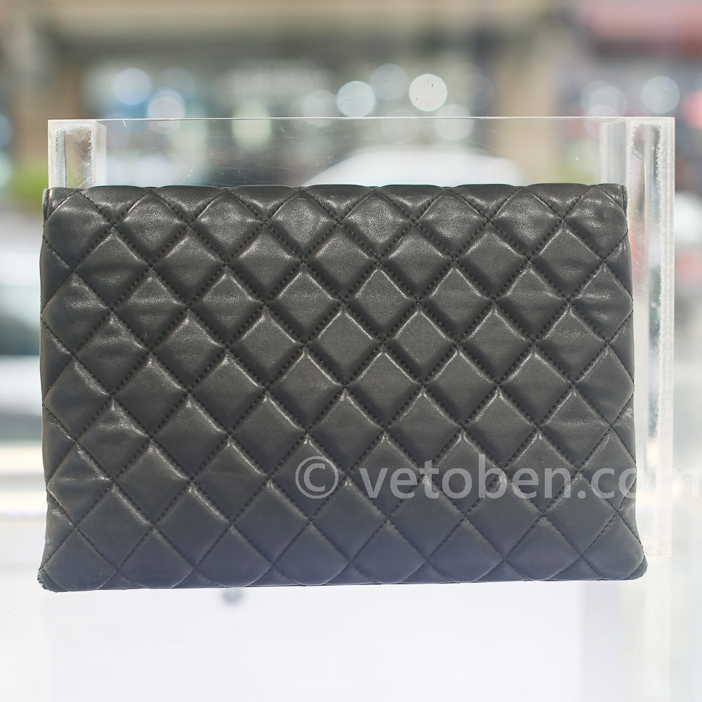 블랙 퀼팅 가죽으로 제작된 이 샤넬 클래식 플랩 클러치 퀼팅은 외부 뒷면 슬립 포켓과 실버 톤 하드웨어가 특징입니다. CC 턴락 잠금장치를 열면 가죽 내부가 보입니다.