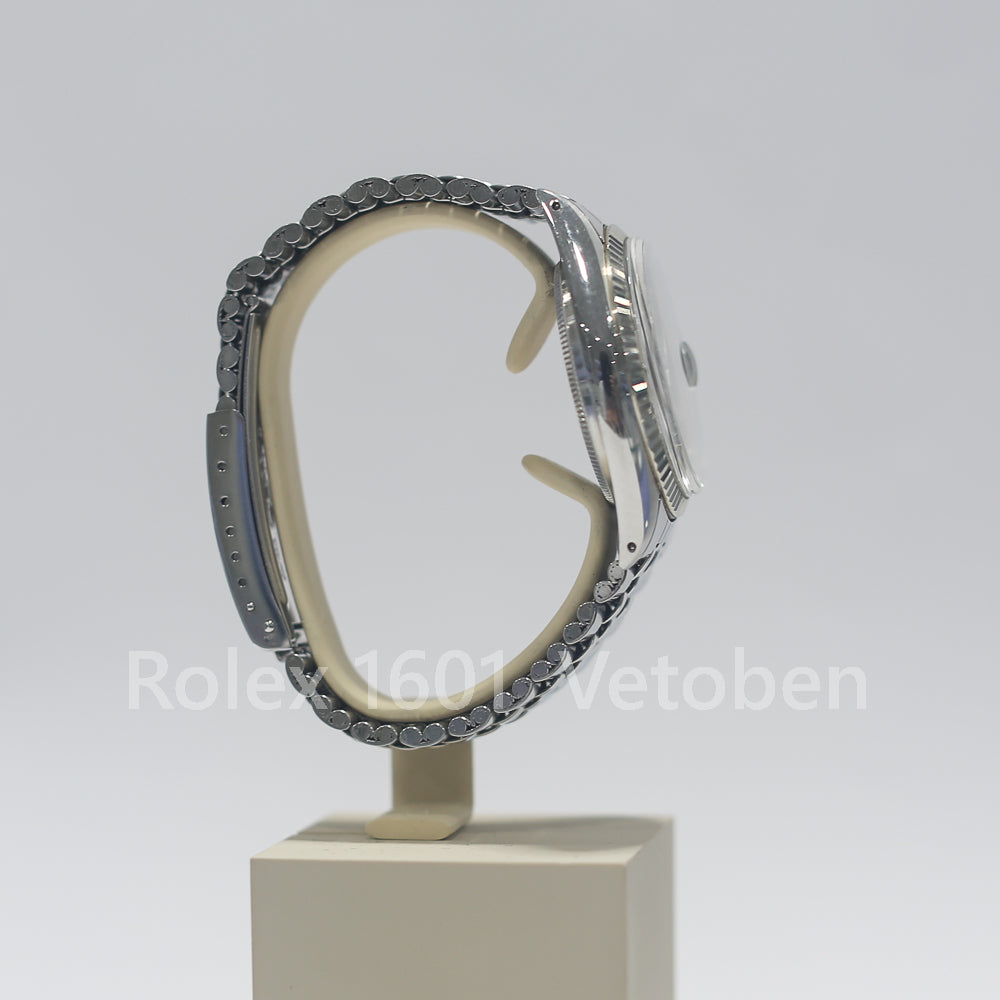 롤렉스 오이스터 퍼페츄얼 데이트저스트 1601 시계. 홈이 있는 베젤이 있는 스테인리스 스틸 케이스. 스틸 핸즈와 인덱스 아워 마커가 있는 실버 다이얼. 외부 다이얼 주변의 분 표시. 3시 위치에 날짜 표시. 접이식 걸쇠가 달린 스테인리스 스틸 쥬빌리 브레이슬릿. 손목 둘레 7인치까지 맞습니다. 아크릴 크리스탈. 칼리버 1575 오토매틱 셀프 와인딩 무브먼트, 44시간 파워리저브.