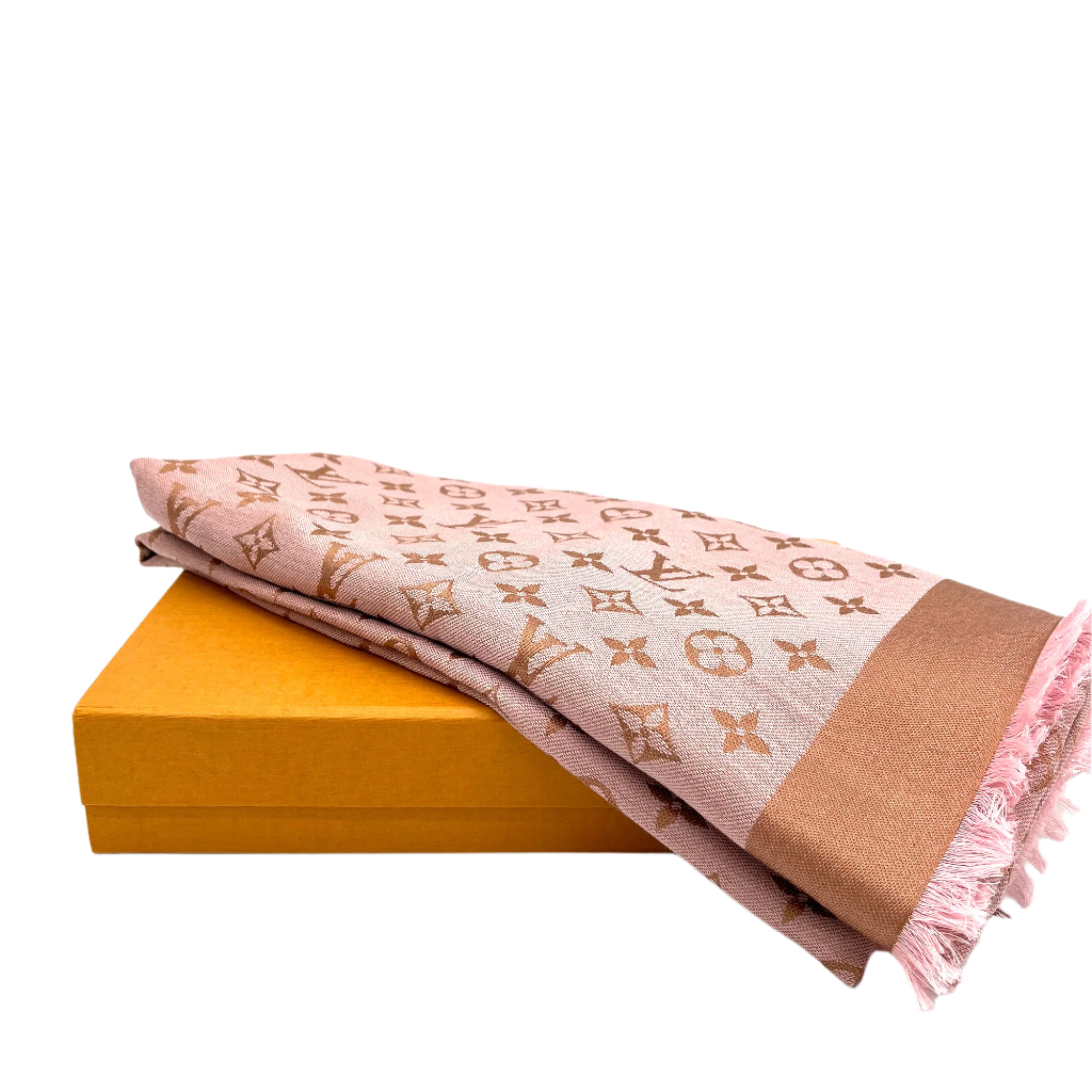 This is an authentic LOUIS VUITTON Silk Wool Monogram Denim Shawl in Beige Pink. This elegant shawl is crafted of 60% silk and 40% wool. This sizable shawl features a beige Louis Vuitton monogram on a pink background.