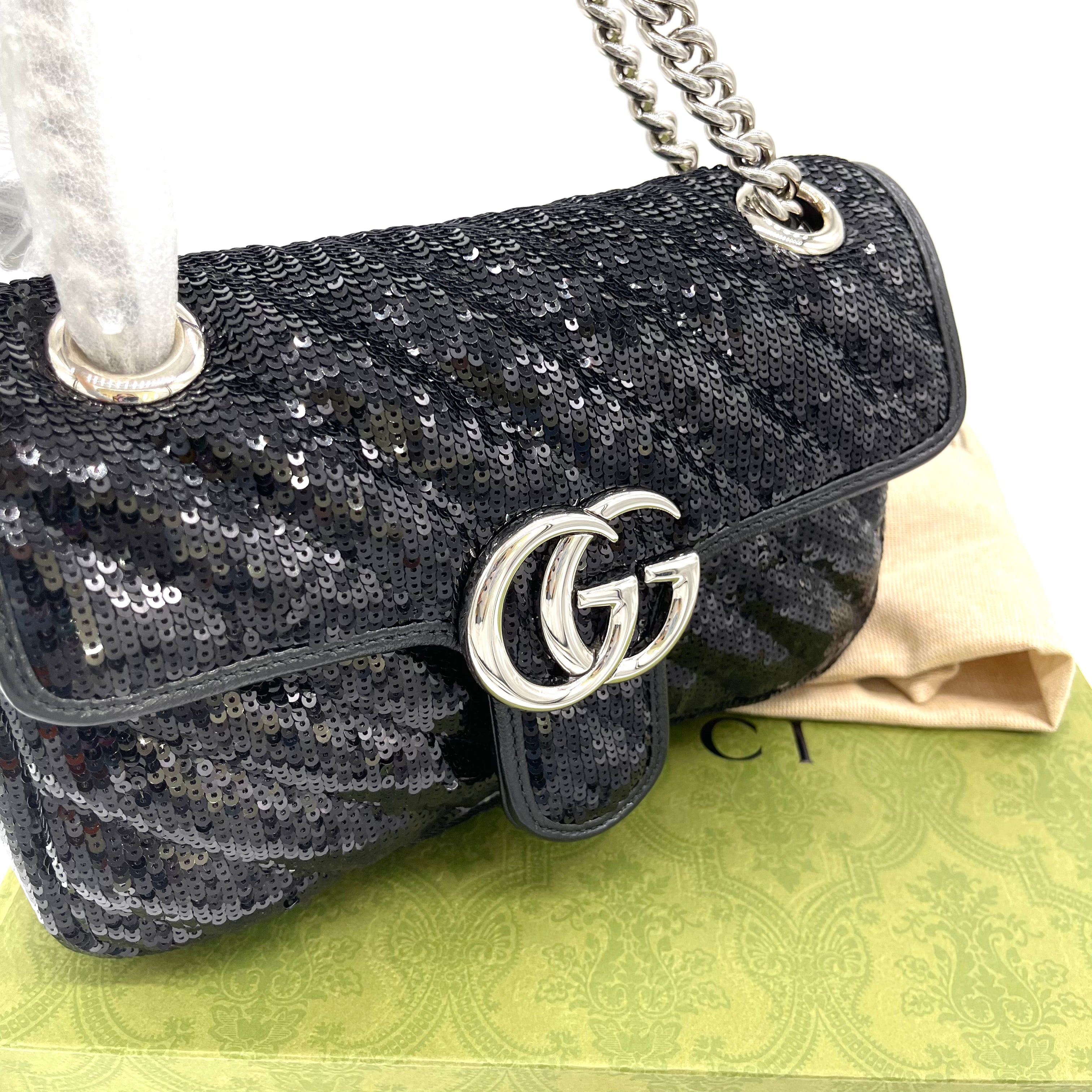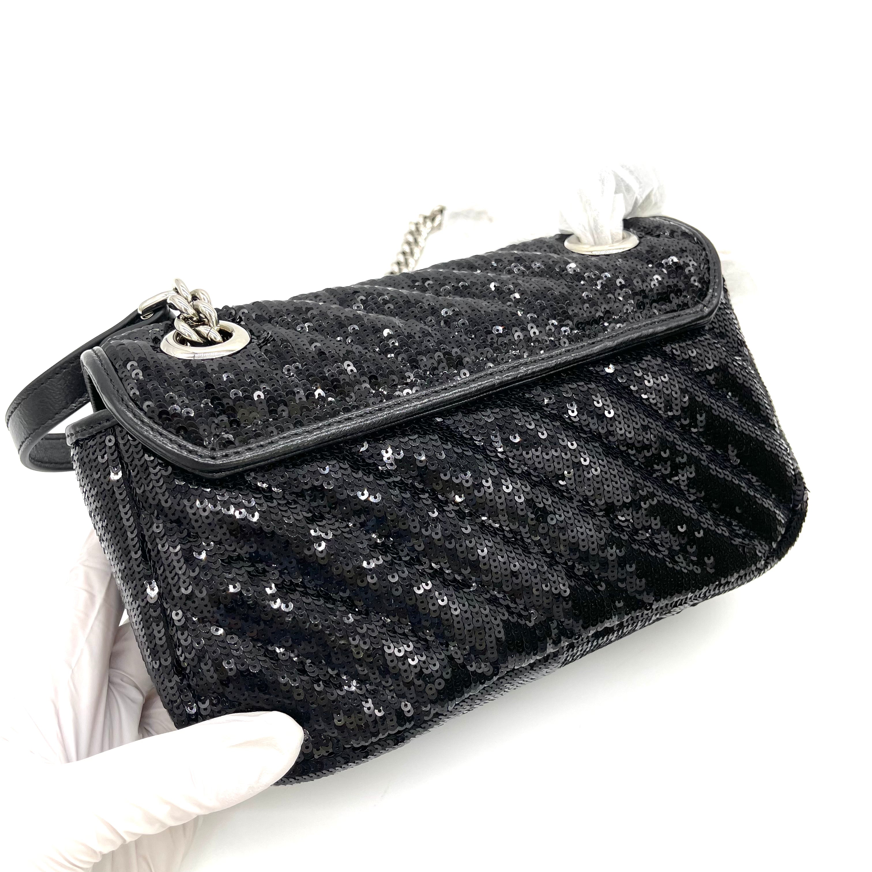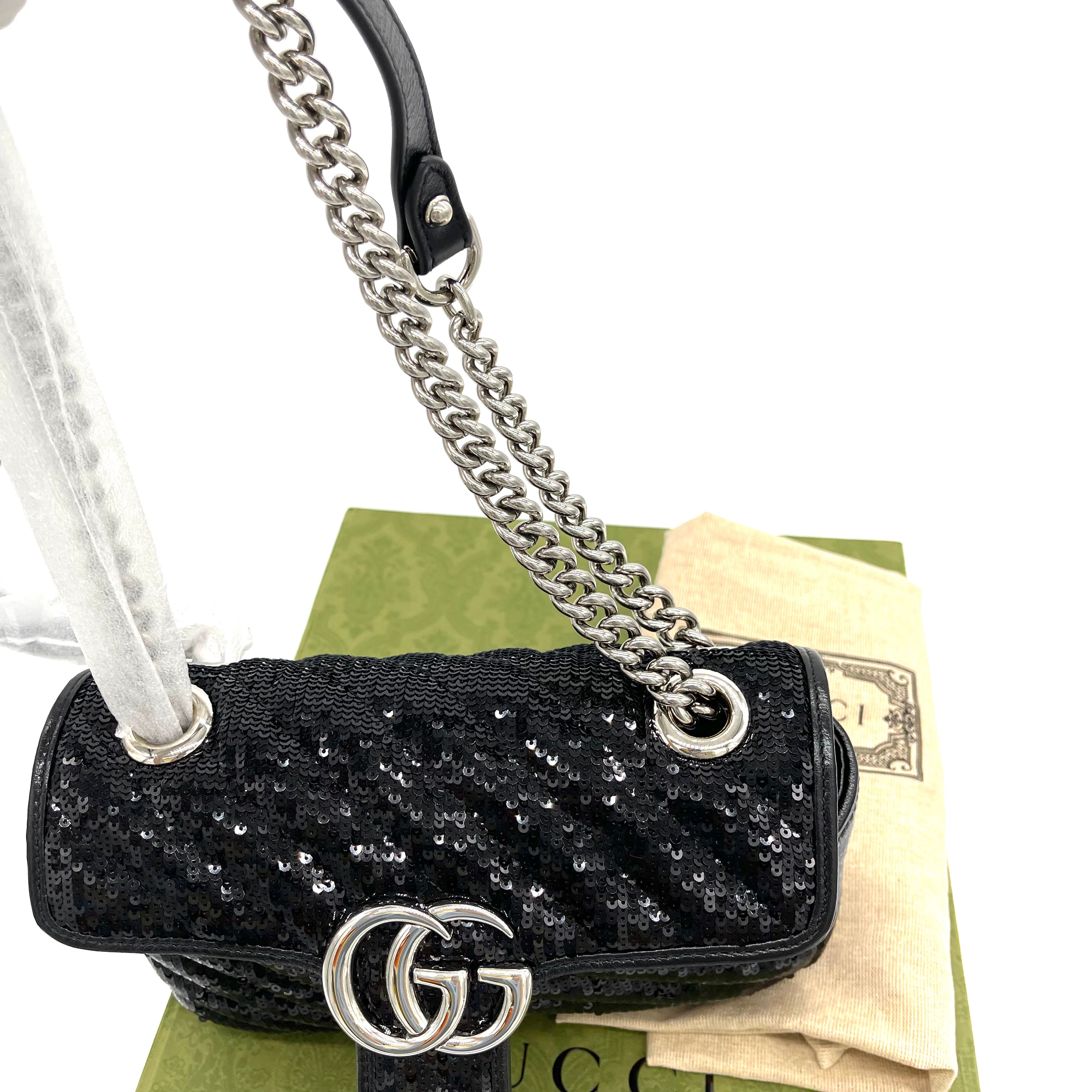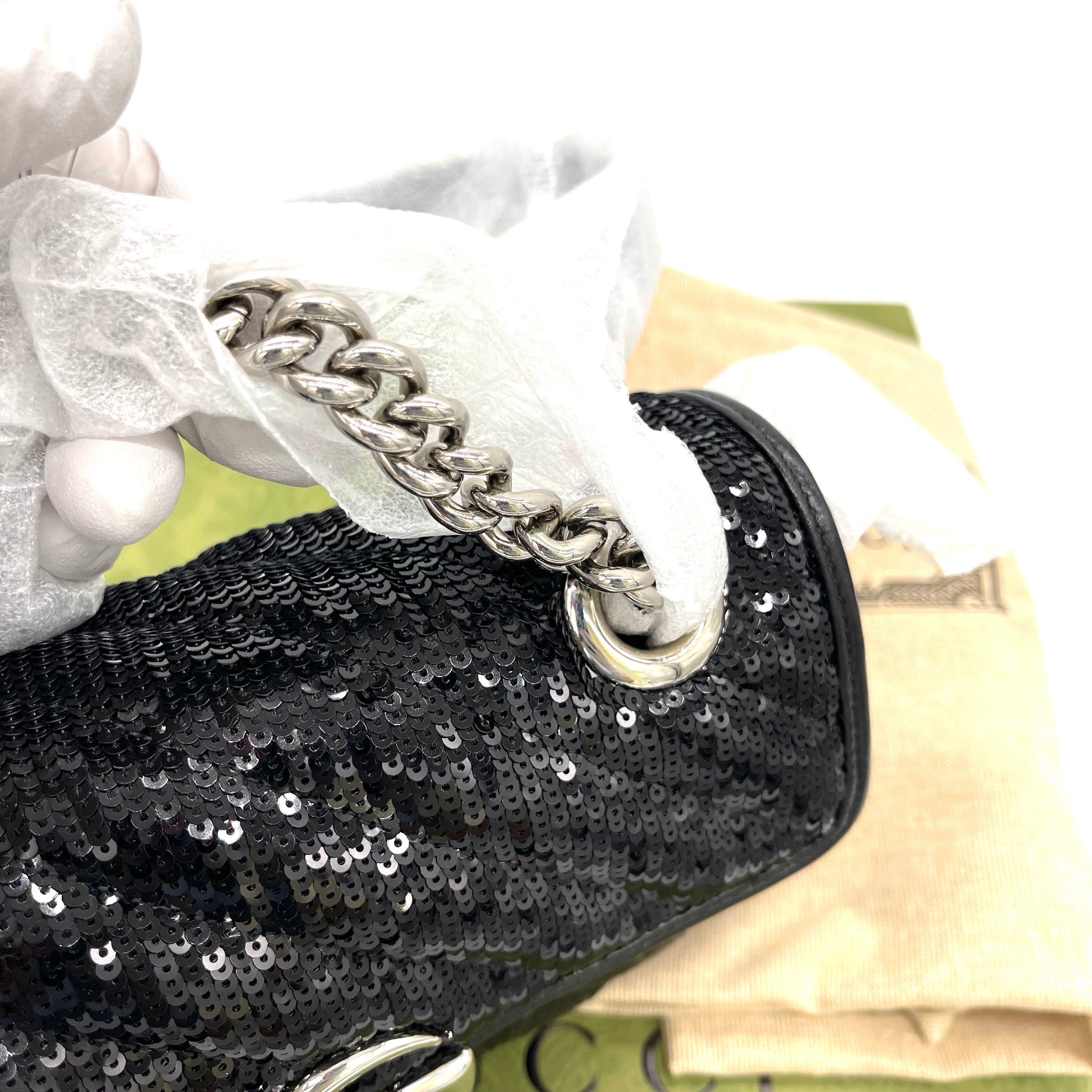 정품 GUCCI 스팽글 마텔라세 미니 GG 마몬트 숄더백(블랙 색상)입니다. 이 숄더백은 블랙 색상의 송아지 가죽으로 제작되었으며 블랙 스팽글로 덮여 있습니다. 이 백은 조절 가능한 광택 실버 체인과 블랙 가죽 숄더 스트랩이 특징입니다. 앞면에는 인터로킹 실버 GG 로고가 있습니다. 상단 지퍼를 열면 블랙 새틴 패브릭 내부에 패치 포켓이 있습니다.