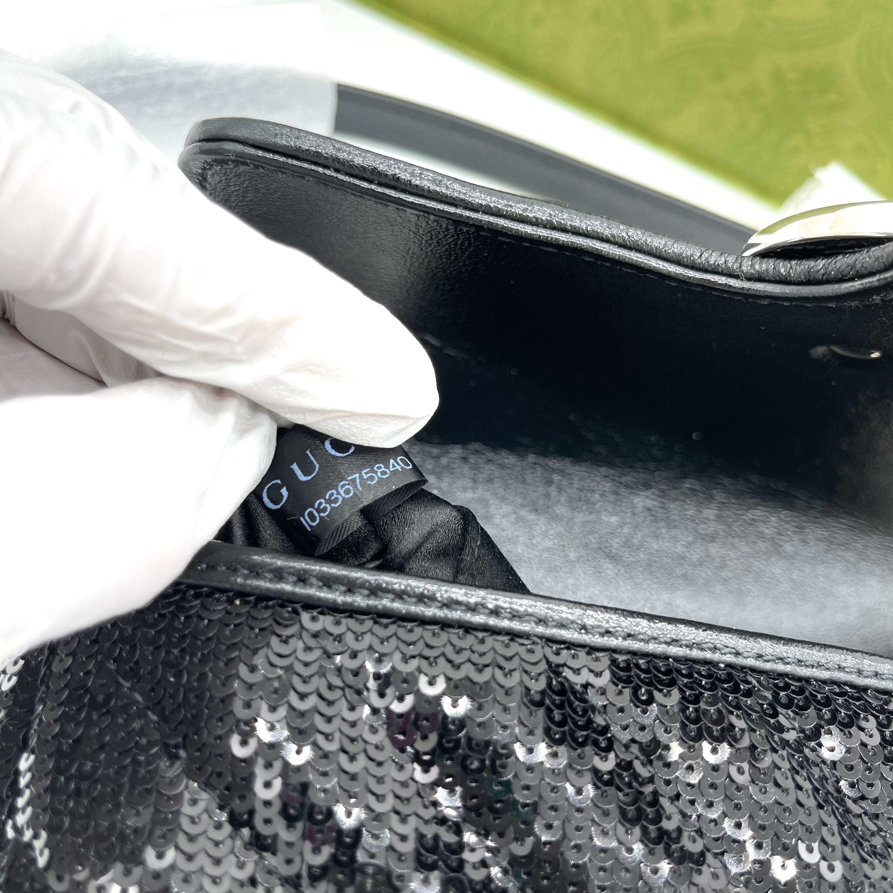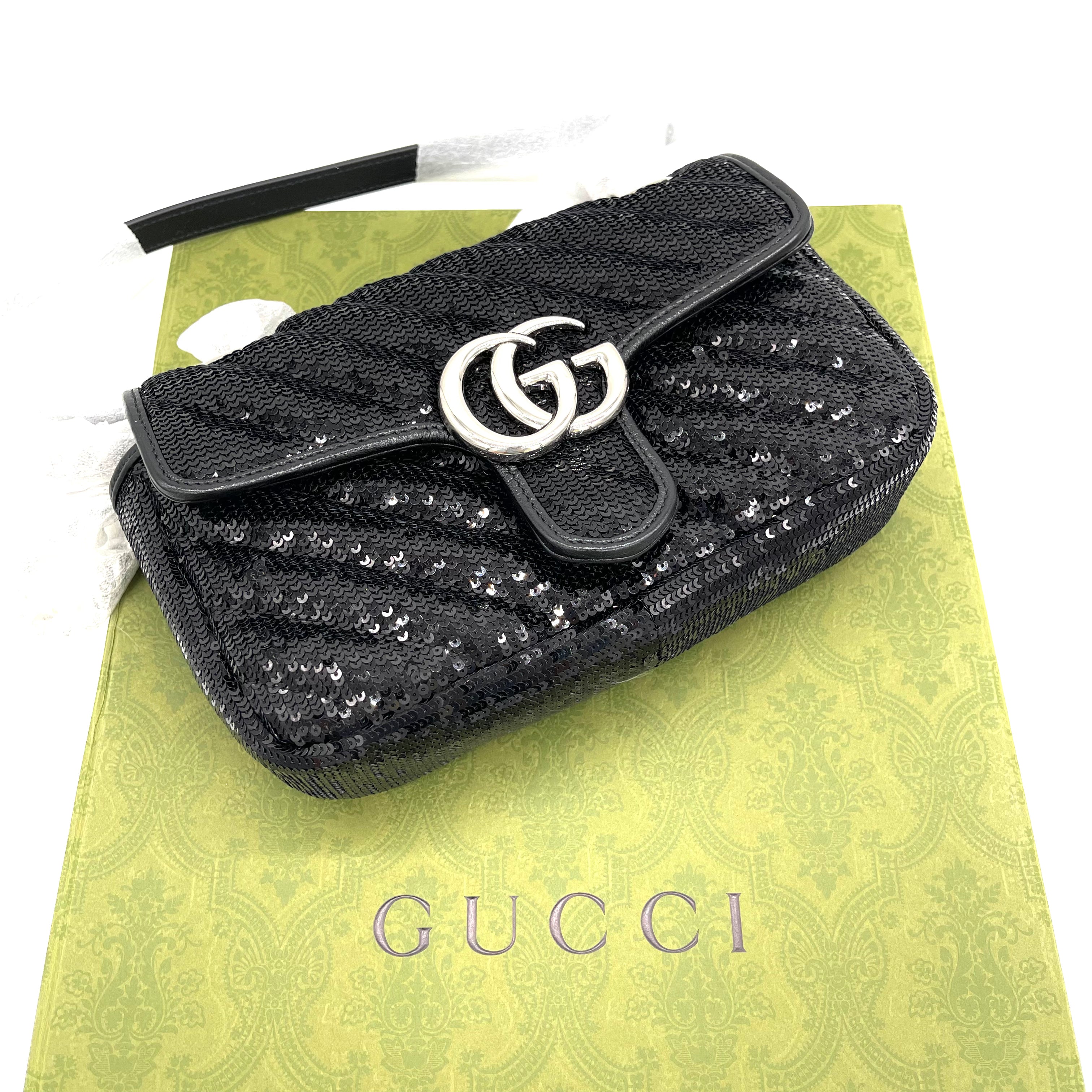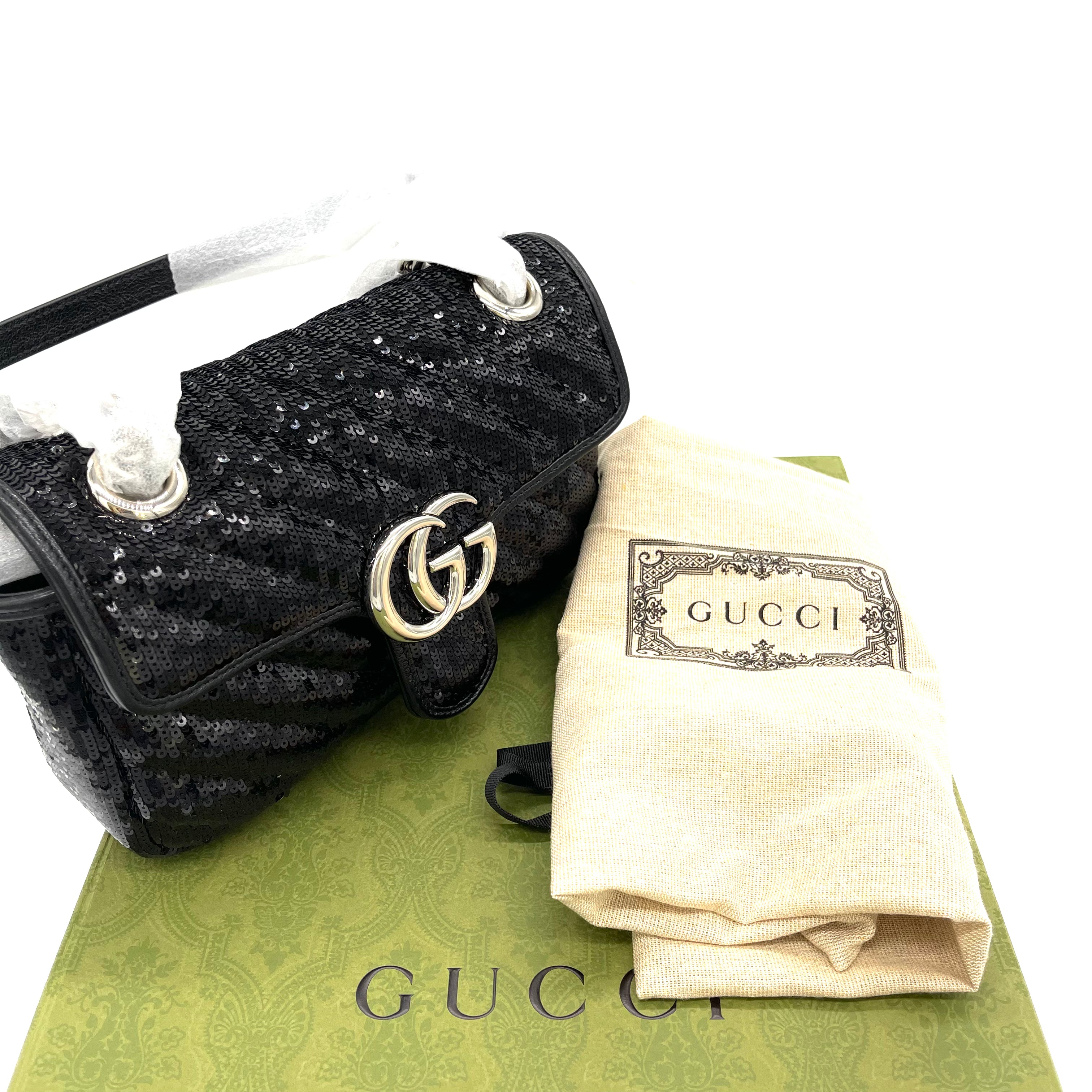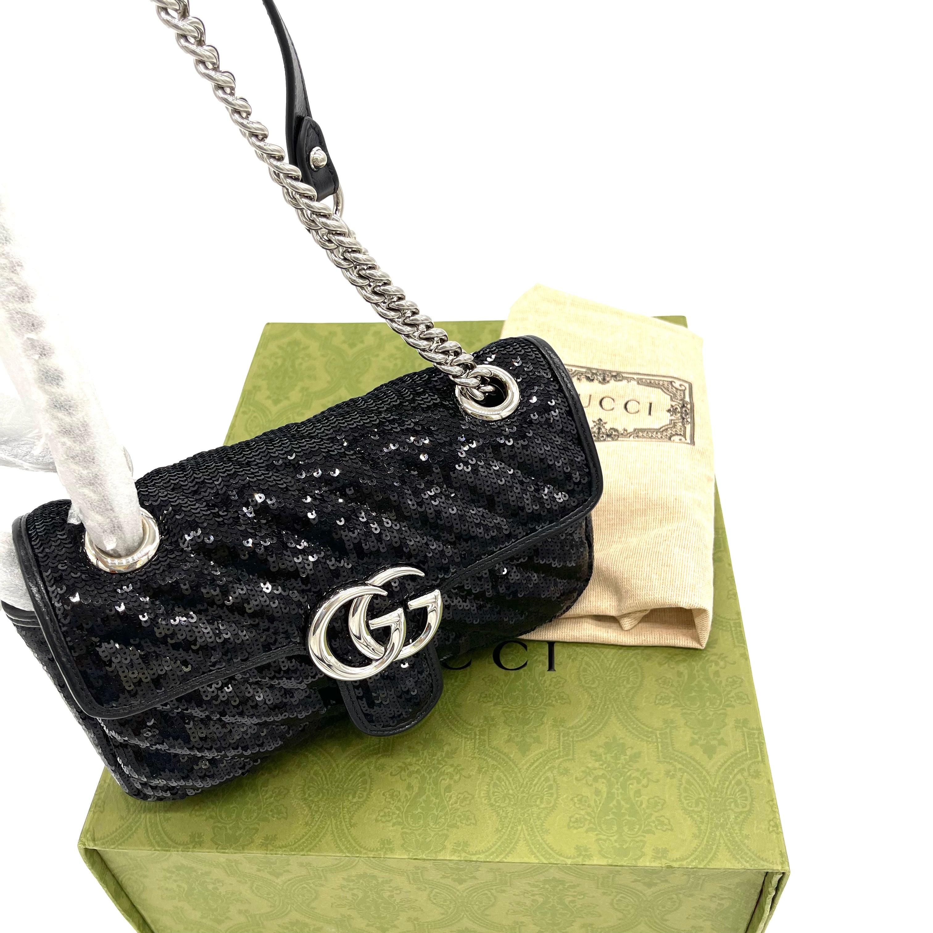 정품 GUCCI 스팽글 마텔라세 미니 GG 마몬트 숄더백(블랙 색상)입니다. 이 숄더백은 블랙 색상의 송아지 가죽으로 제작되었으며 블랙 스팽글로 덮여 있습니다. 이 백은 조절 가능한 광택 실버 체인과 블랙 가죽 숄더 스트랩이 특징입니다. 앞면에는 인터로킹 실버 GG 로고가 있습니다. 상단 지퍼를 열면 블랙 새틴 패브릭 내부에 패치 포켓이 있습니다.
