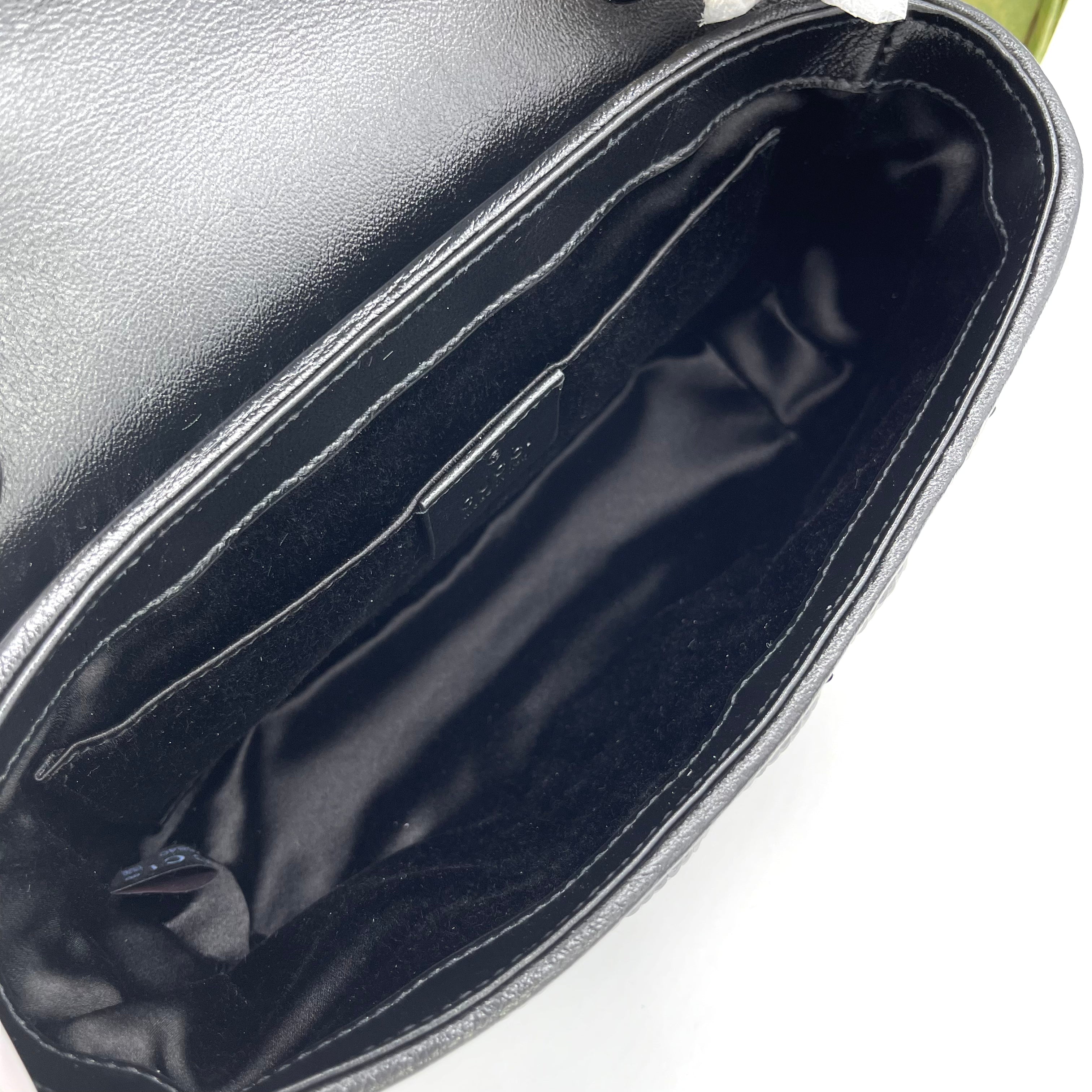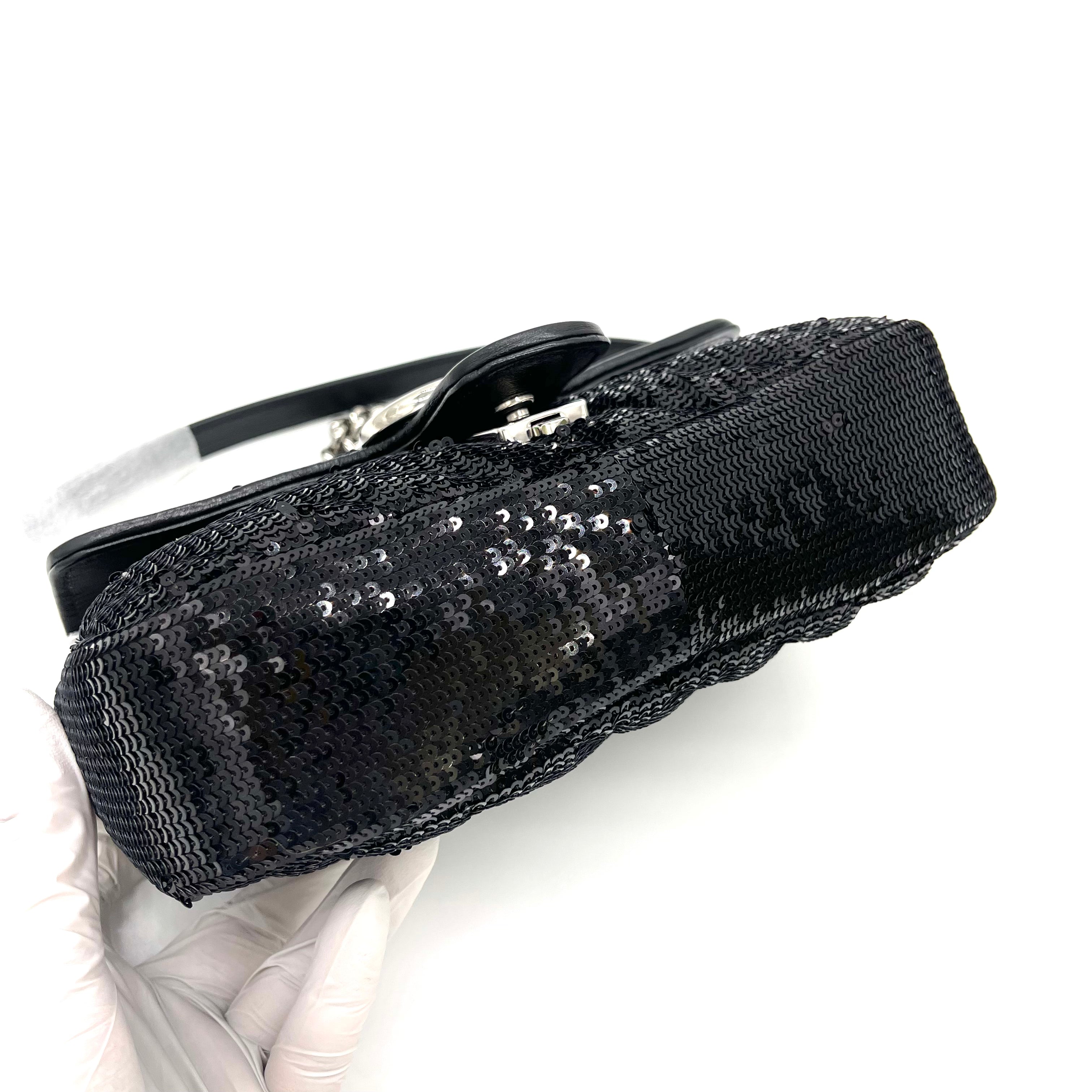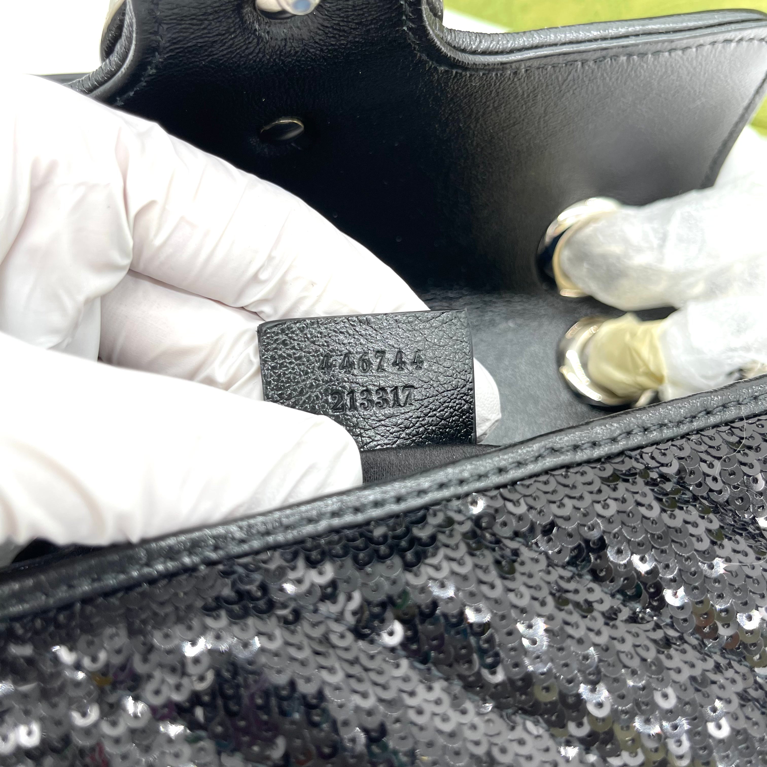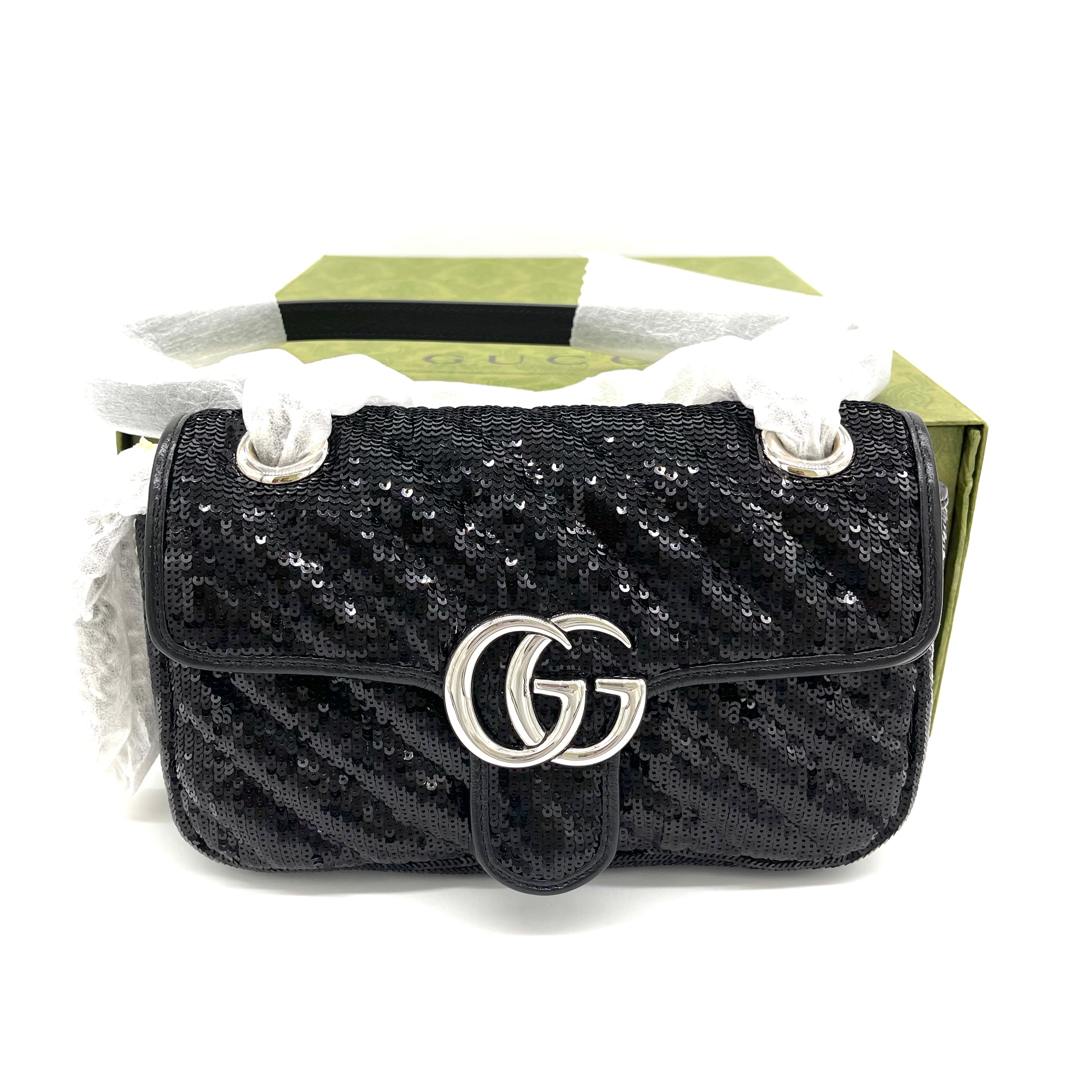 정품 GUCCI 스팽글 마텔라세 미니 GG 마몬트 숄더백(블랙 색상)입니다. 이 숄더백은 블랙 색상의 송아지 가죽으로 제작되었으며 블랙 스팽글로 덮여 있습니다. 이 백은 조절 가능한 광택 실버 체인과 블랙 가죽 숄더 스트랩이 특징입니다. 앞면에는 인터로킹 실버 GG 로고가 있습니다. 상단 지퍼를 열면 블랙 새틴 패브릭 내부에 패치 포켓이 있습니다.