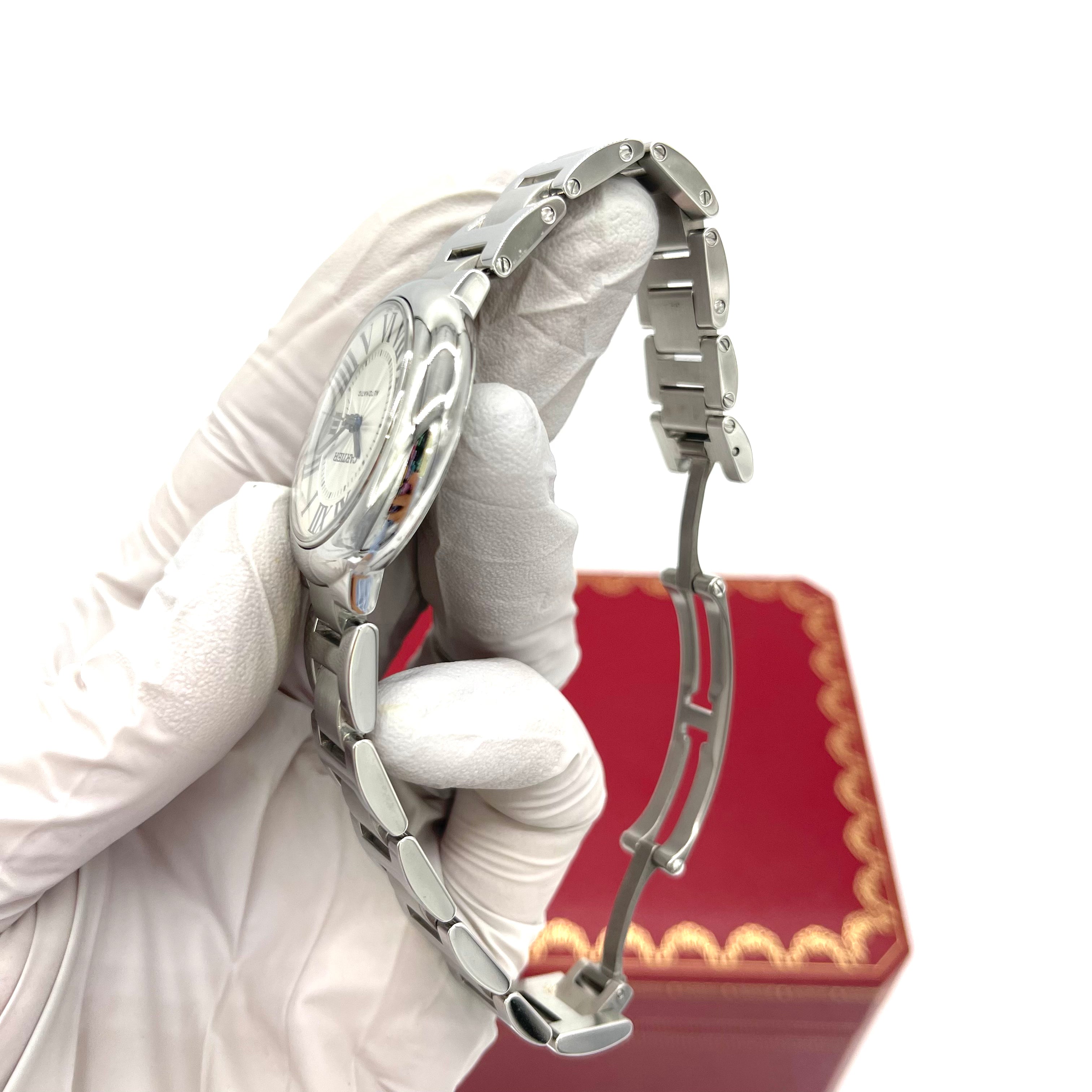 발롱 블루 드 까르띠에 시계, 33mm, 오토매틱 와인딩 기계식 무브먼트. 스틸 케이스, 카보숑 합성 스피넬이 세팅된 홈이 있는 크라운. 실버 기요셰 다이얼. 검 모양의 푸른 강철 손. 사파이어 크리스탈. 교체 가능한 스틸 팔찌. 두께: 10.16mm. 최대 3bar(약 30미터/100피트)의 방수 기능을 제공합니다.