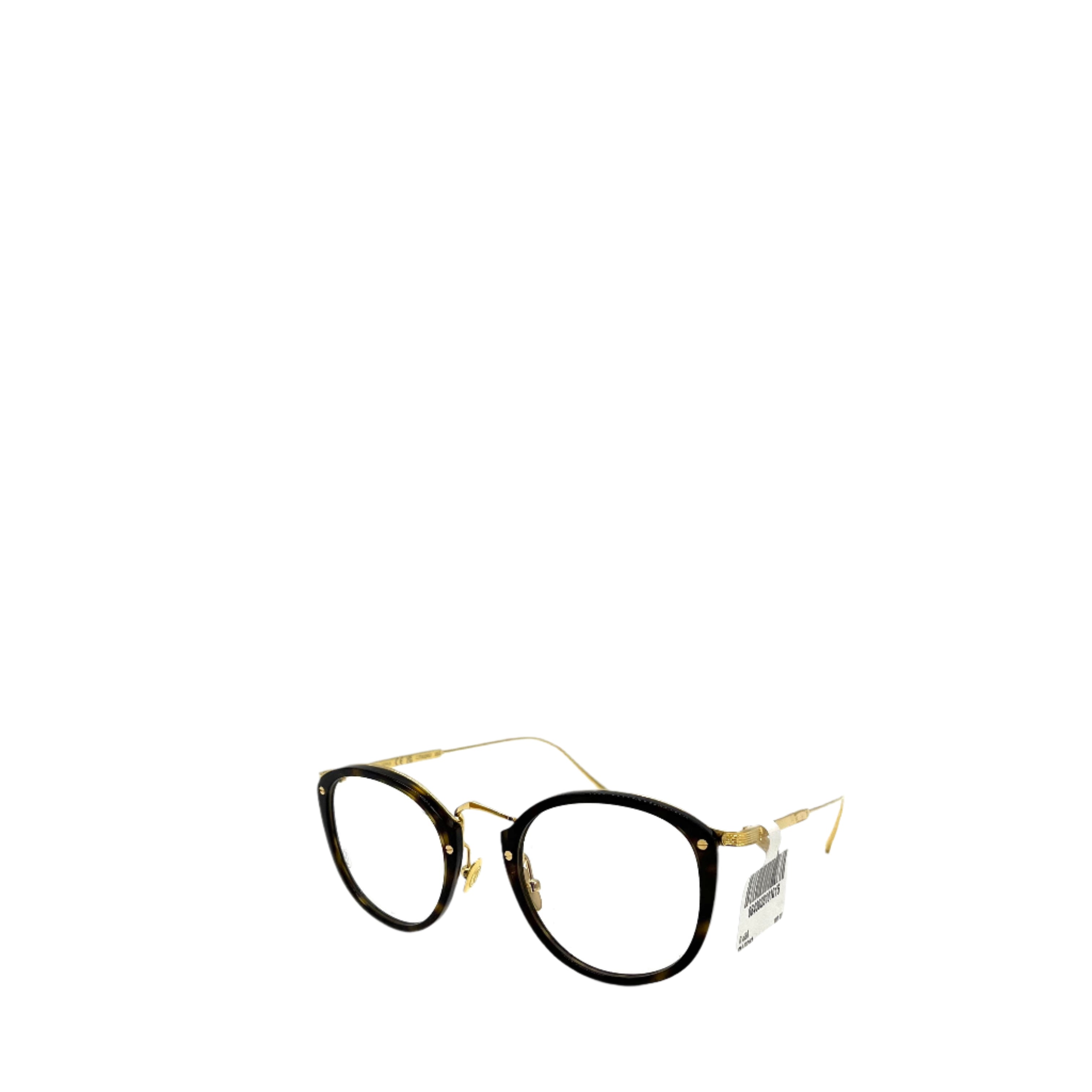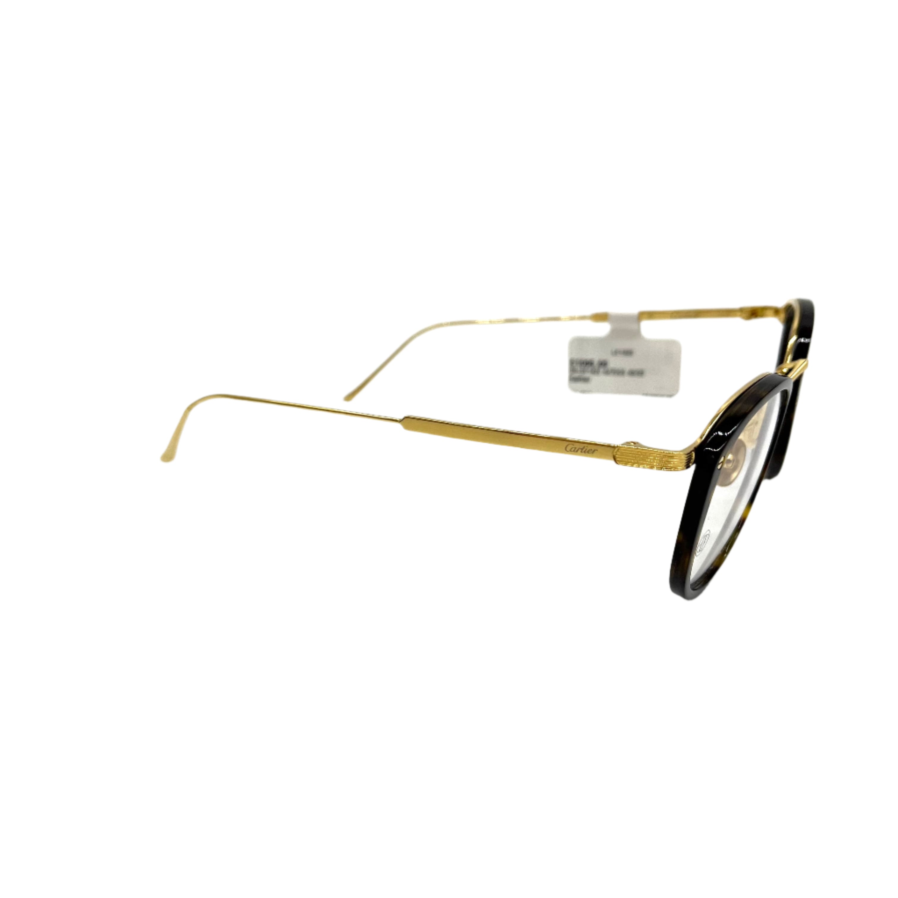 This is Authenticated CARTIER CT00200 (001) Gold Hardware Eyeglasses Frame. Lens shape is round and half inside of the rim is structured with gold hardware frame .Entire hardware finished with gold hardware to the temple tip. Face of the eyeglasses is black acetate material with temples are gold hardware metals with Cartier Signatures.