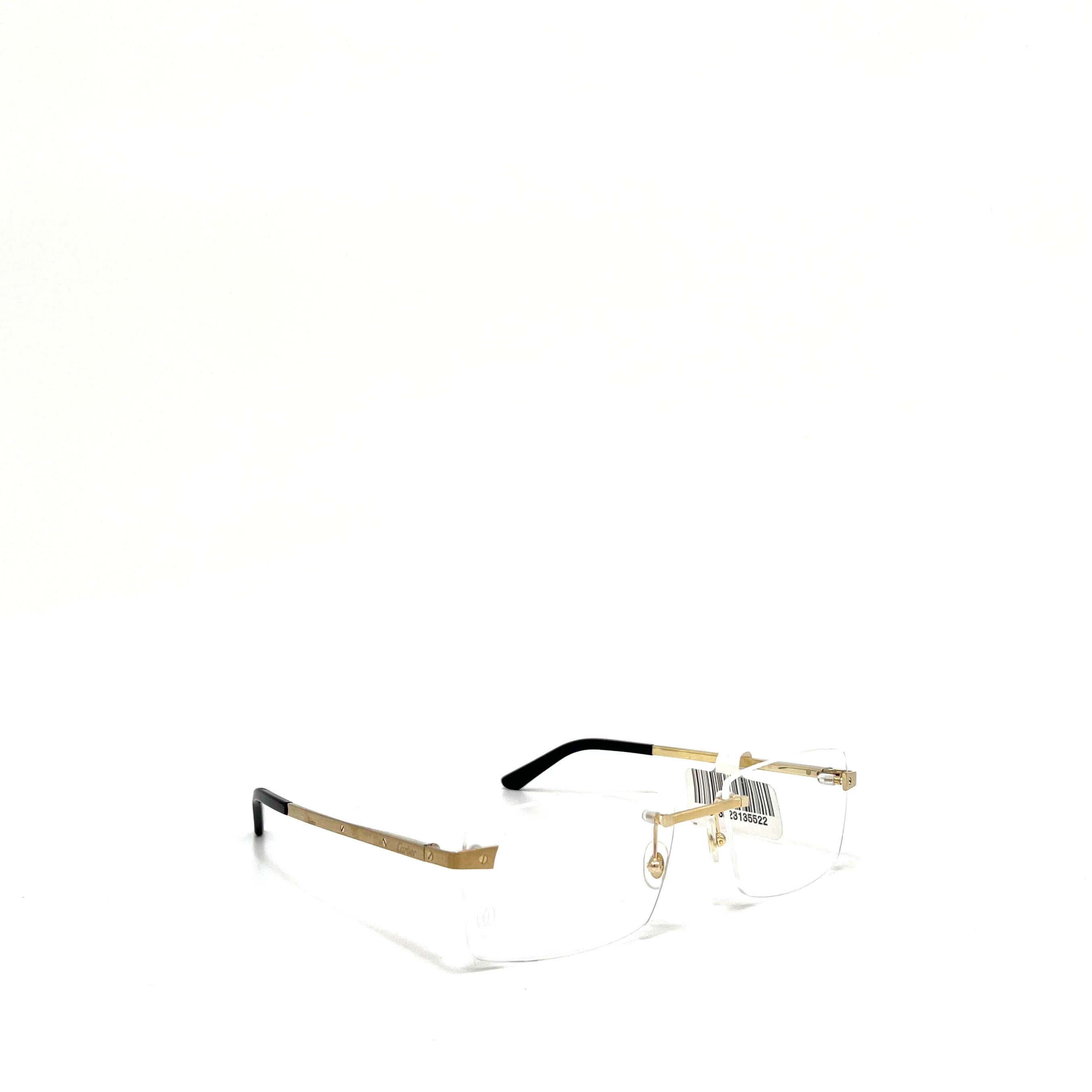 This is Authenticated CARTIER CT0167O Eyeglasses. Lens shape is rectangle and no frame rim. Shiny and sturdy gold metal temples and black plastic temple tip with Cartier signature.