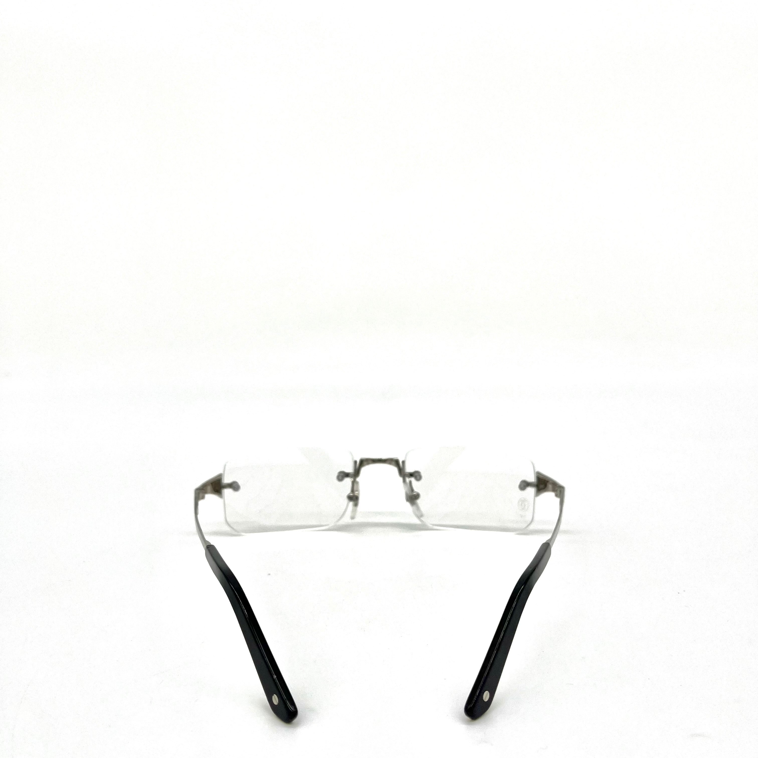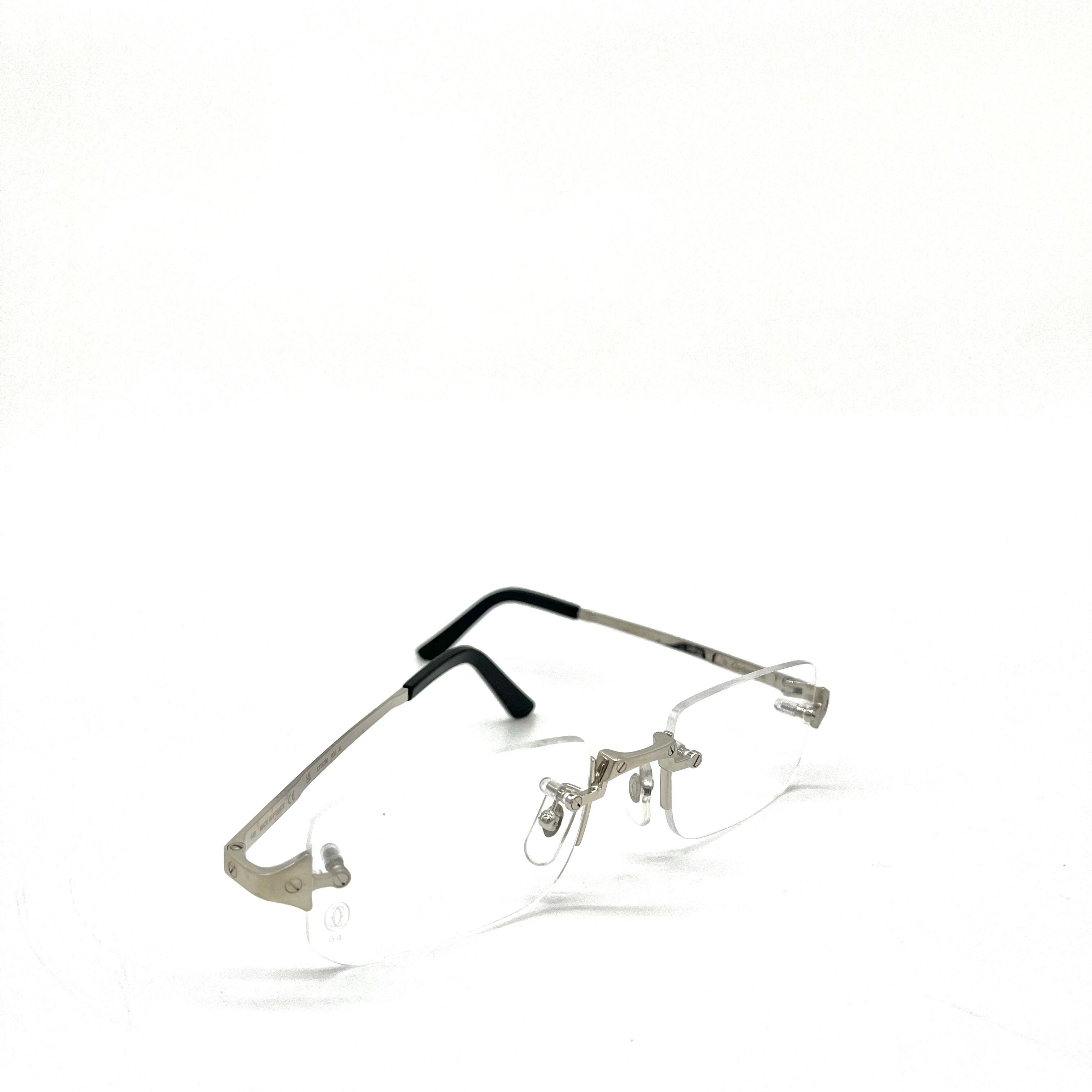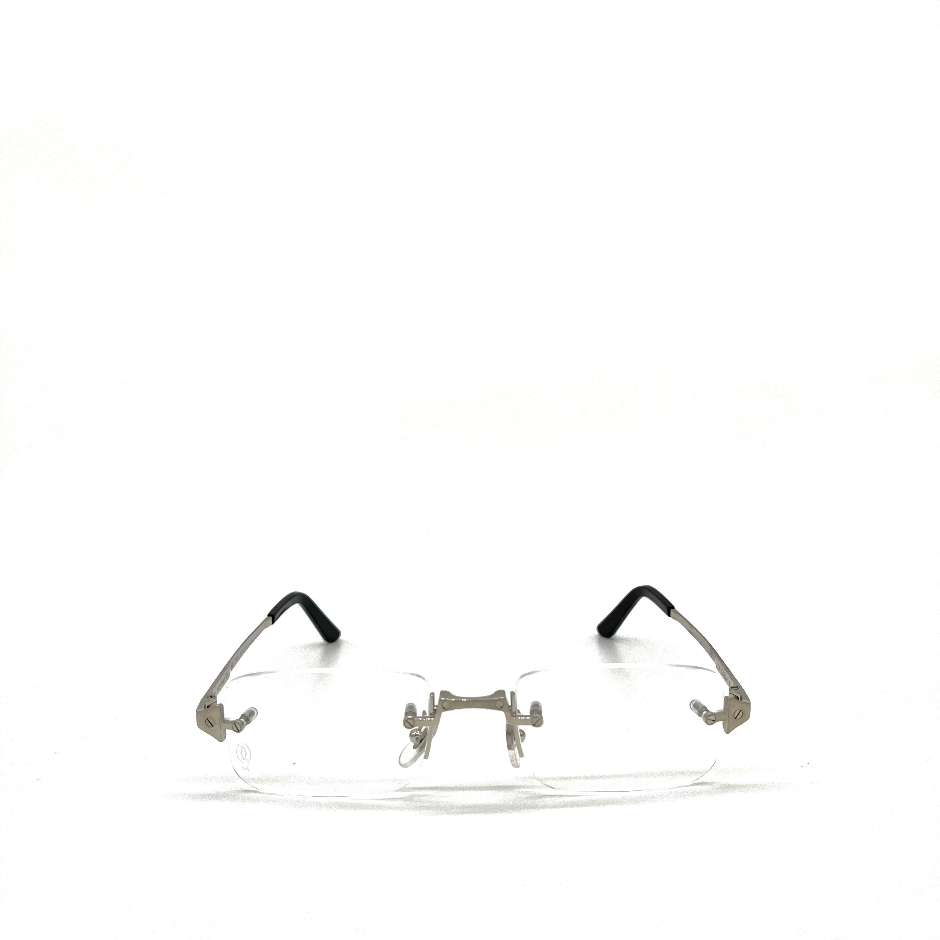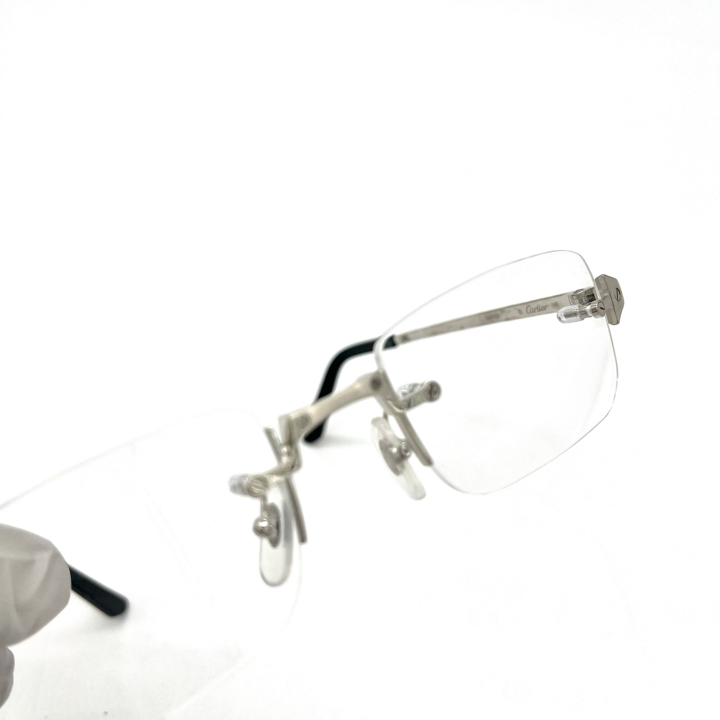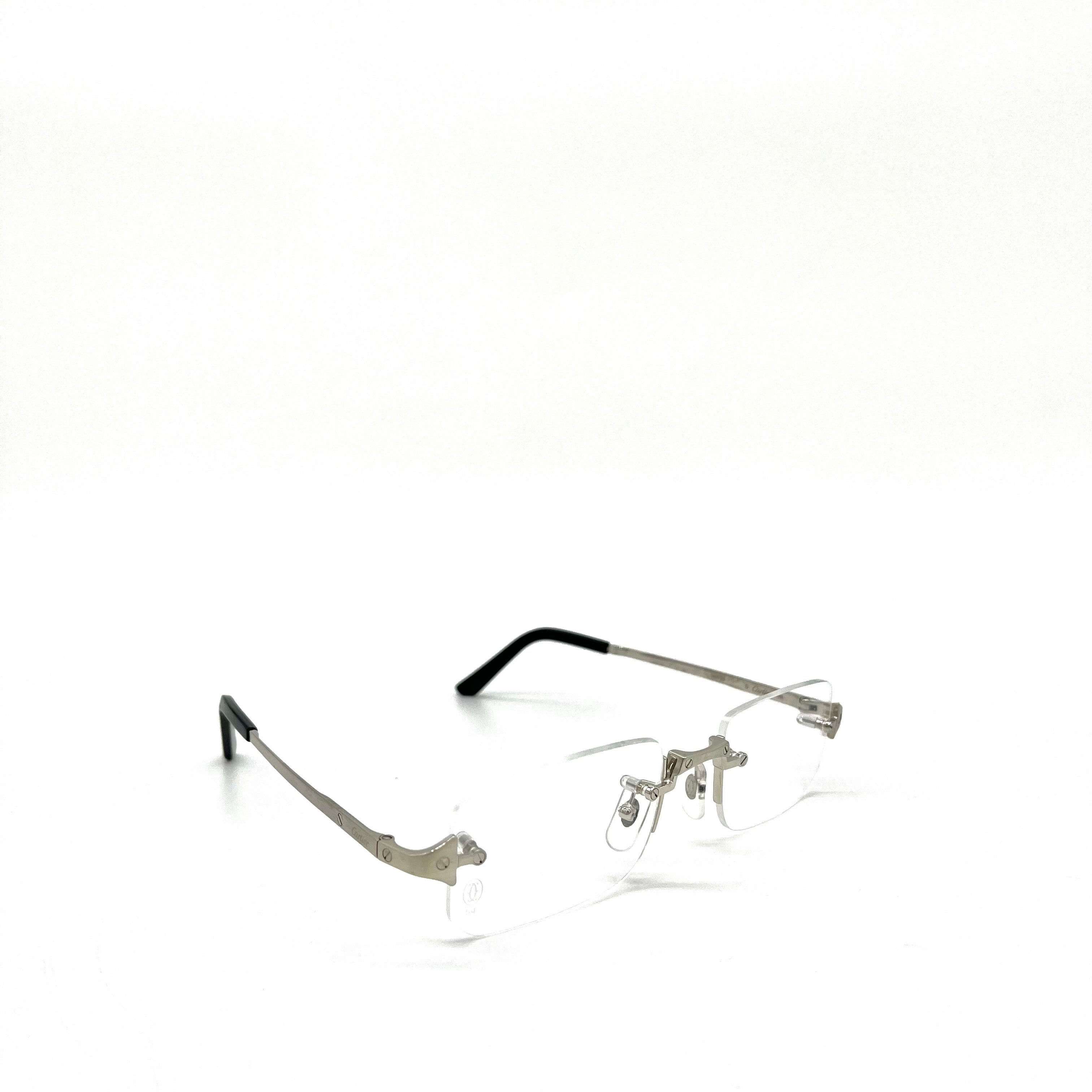 This is authenticated CARTIER CT04790 002 54/21 Frame. Lens shape is rectangle and no rim. Shiny and sturdy silver metal temples and black plastic temple tip.