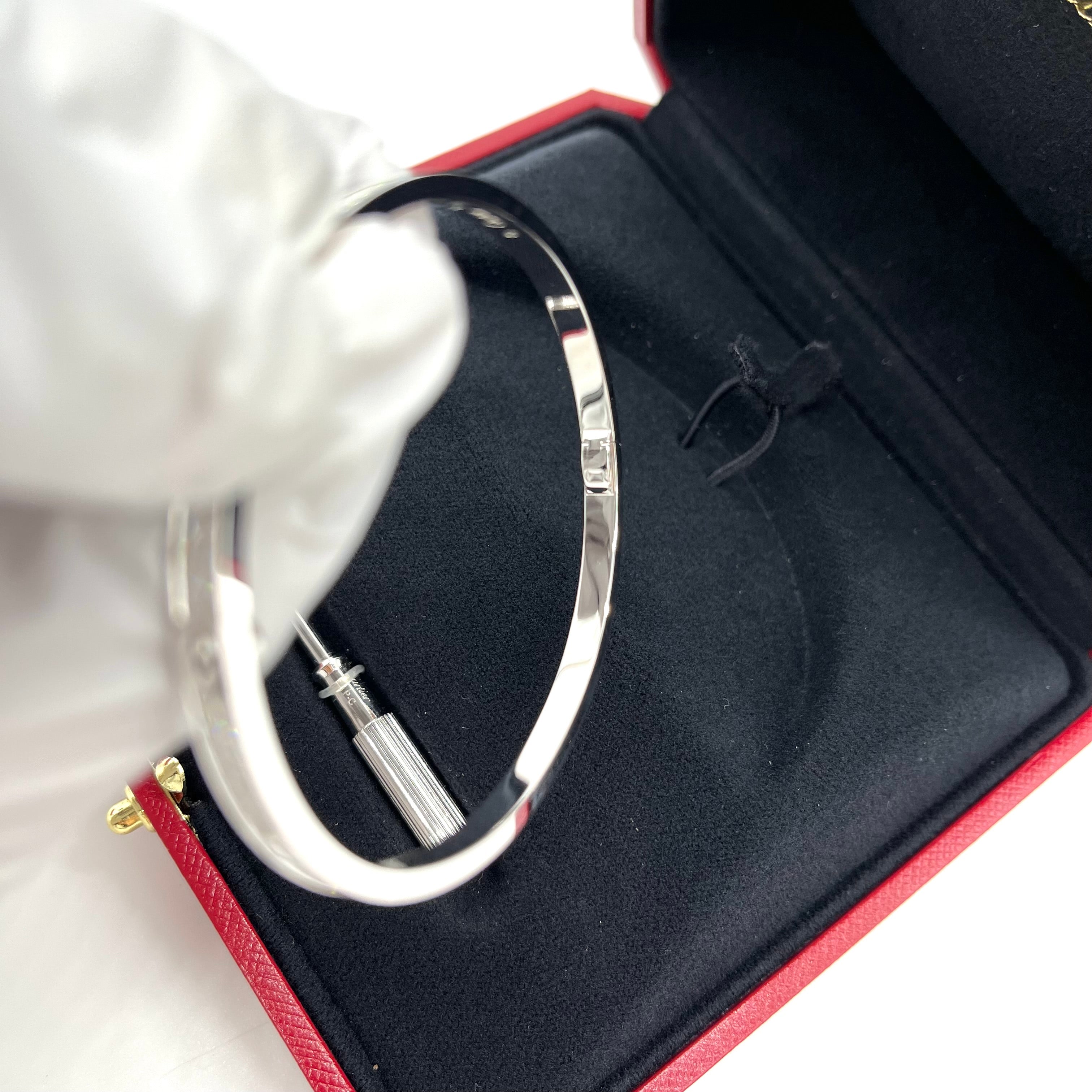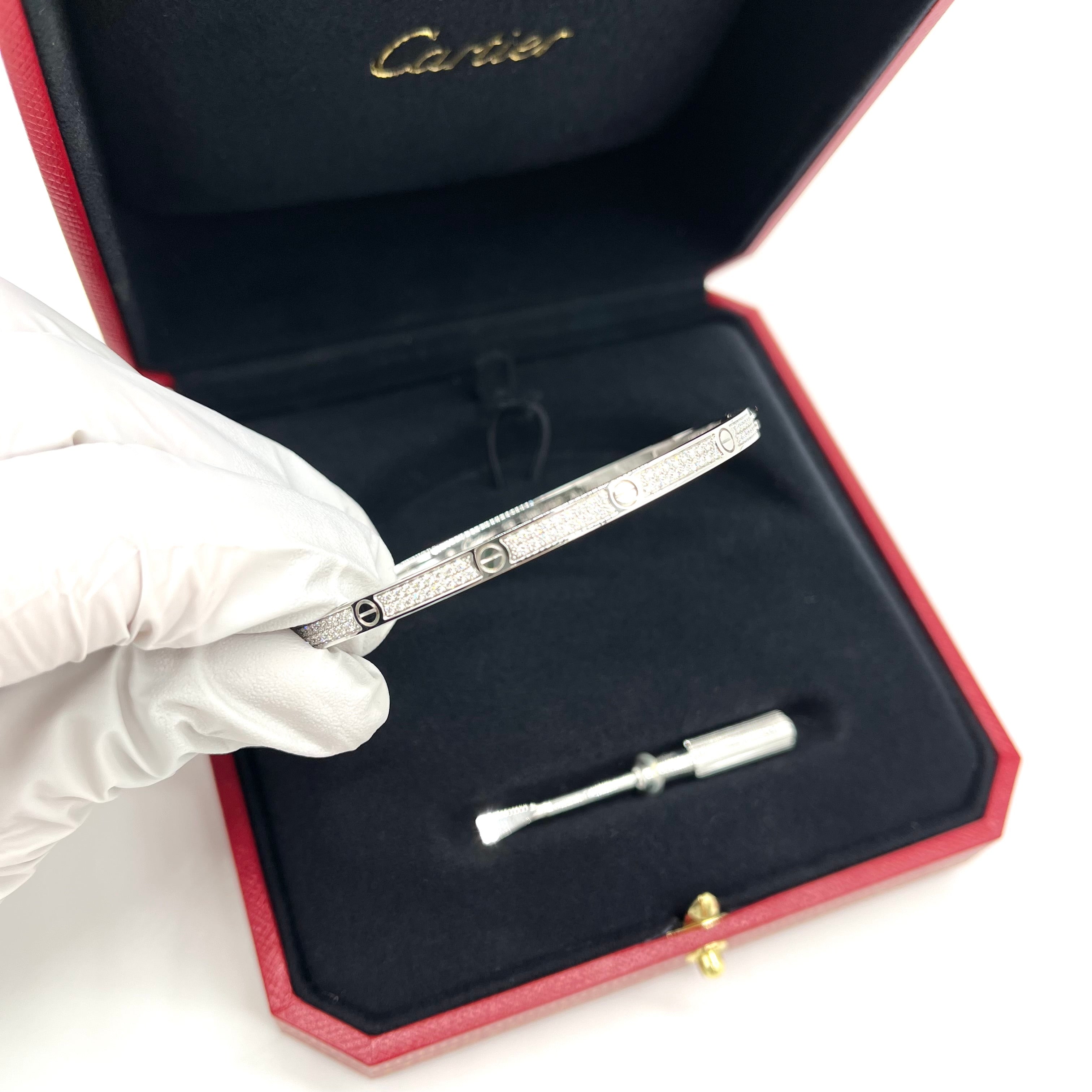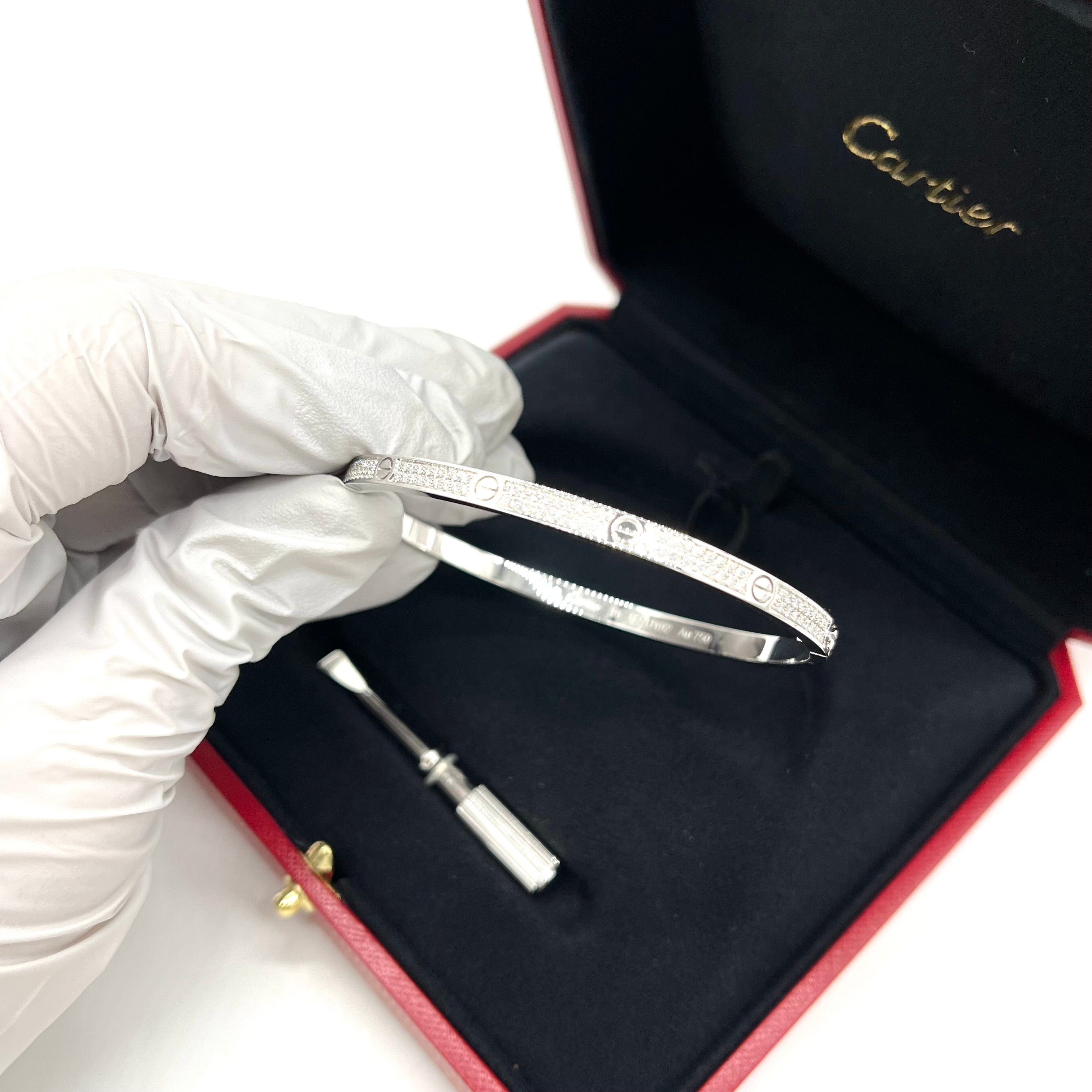 This is an authentic Cartier LOVE bracelet, small model, paved Size 18. The bracelet is crafted of 18 karat white gold and features the signature engraved LOVE screw motifs throughout the bangles surrounded with diamonds. The bracelet also features two functional screws on one side to open and close.