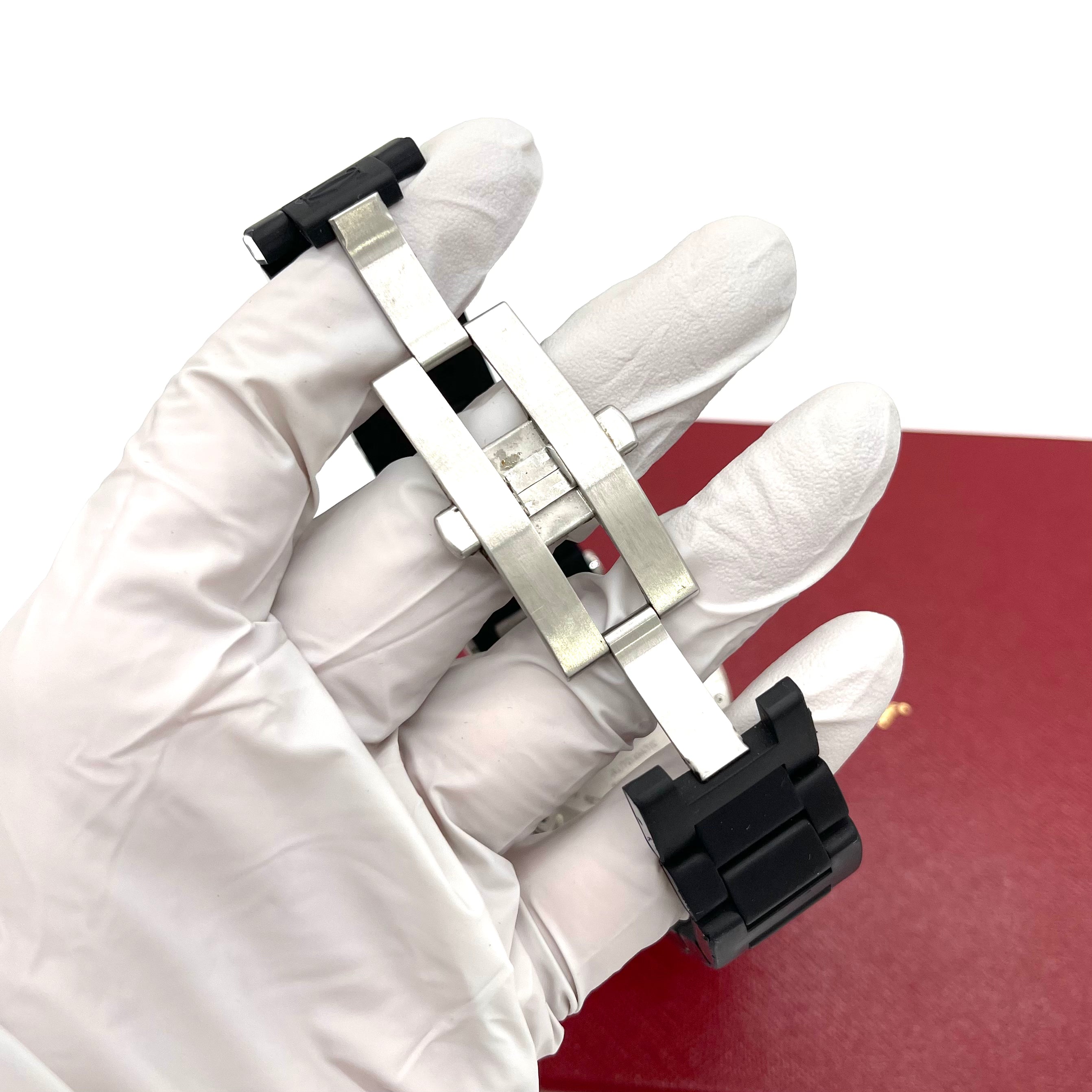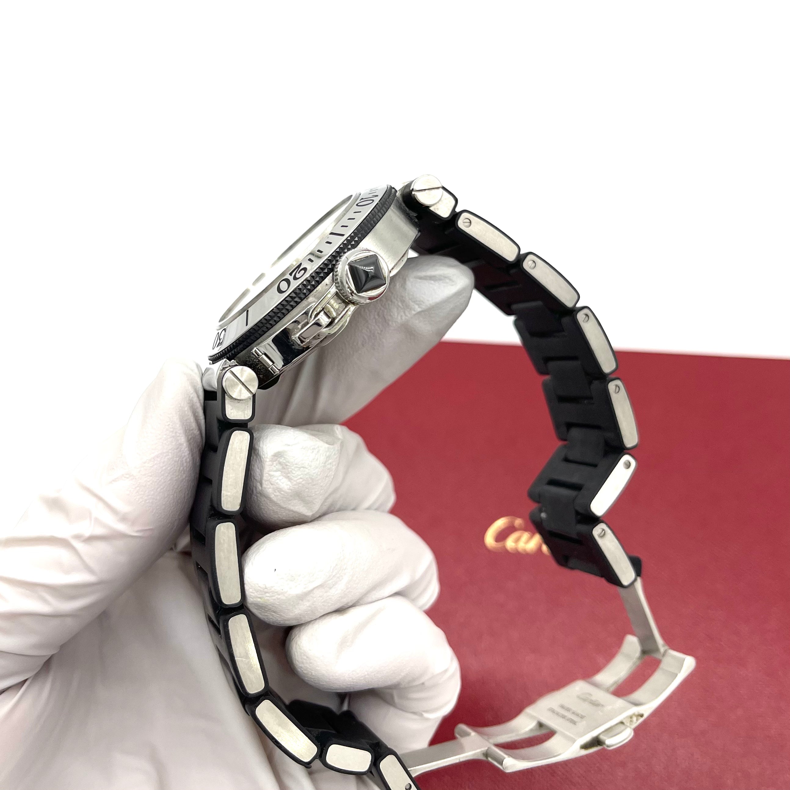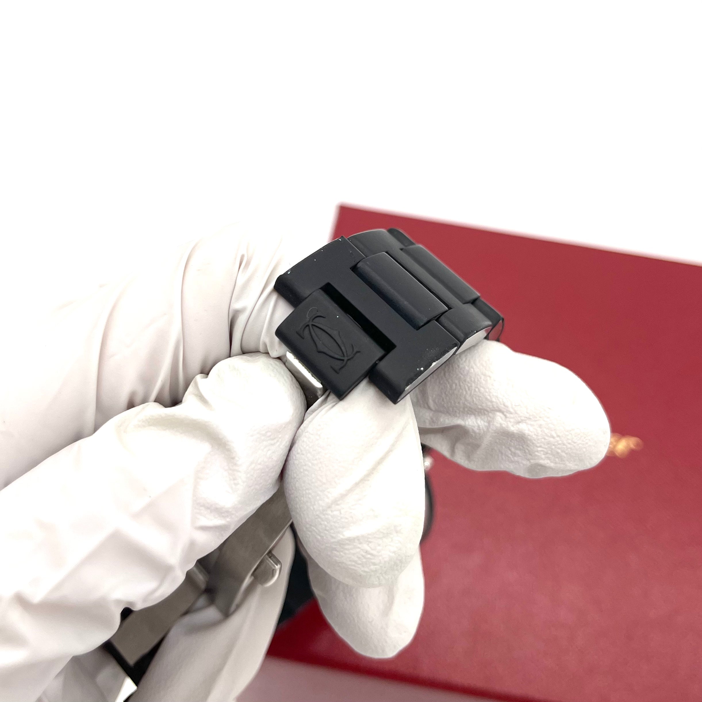 검정색 고무로 덮인 스테인리스 스틸 스트랩이 있는 스테인리스 스틸 케이스입니다. 단방향 회전 스테인리스 스틸 베젤. 다이아몬드 모양의 핸즈와 방사형 스틱 아워 마커가 있는 블랙 다이얼. 3시, 6시, 9시, 12시 위치에 아라비아 숫자. 내부 링 주변의 분 표시. 다이얼 유형: 아날로그. 날짜는 4시와 5시 사이에 표시됩니다. 약 42시간의 파워리저브를 갖춘 까르띠에 칼리버 049 오토매틱 무브먼트. 긁힘 방지 사파이어 크리스탈. 블랙 세라믹 카보숑이 세팅된 스크류 다운 크라운. 견고한 케이스백. 케이스 크기: 40.5mm. 케이스 두께: 13.0mm. 둥근 케이스 모양. 배포 걸쇠. 100미터/330피트 방수. 기능: 시, 분, 초침, 날짜. 럭셔리 시계 스타일. 시계 라벨: 스위스 메이드. 품목 변형: W31077U2, Cartier-W31077U2. 까르띠에 파샤 시타이머 스틸 러버