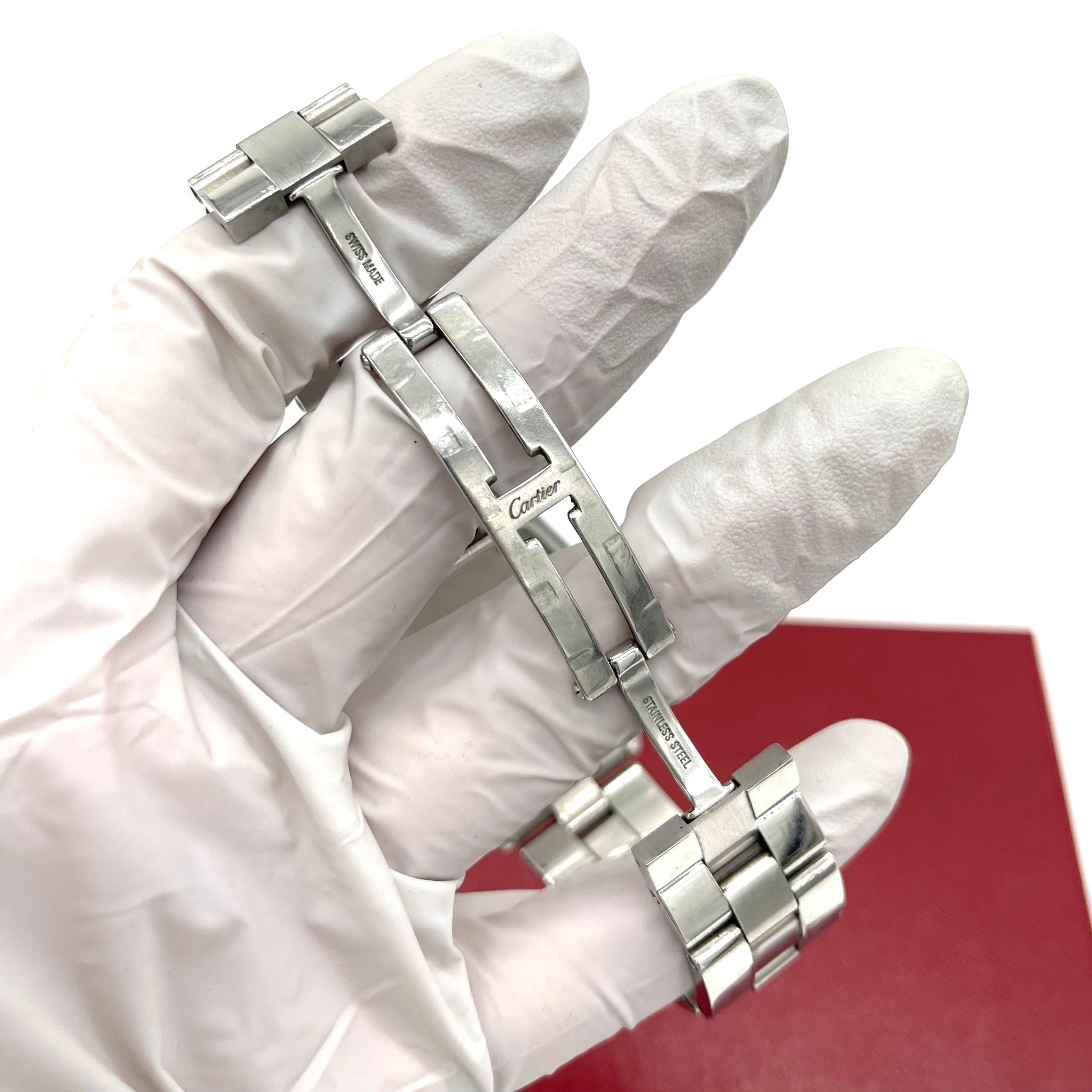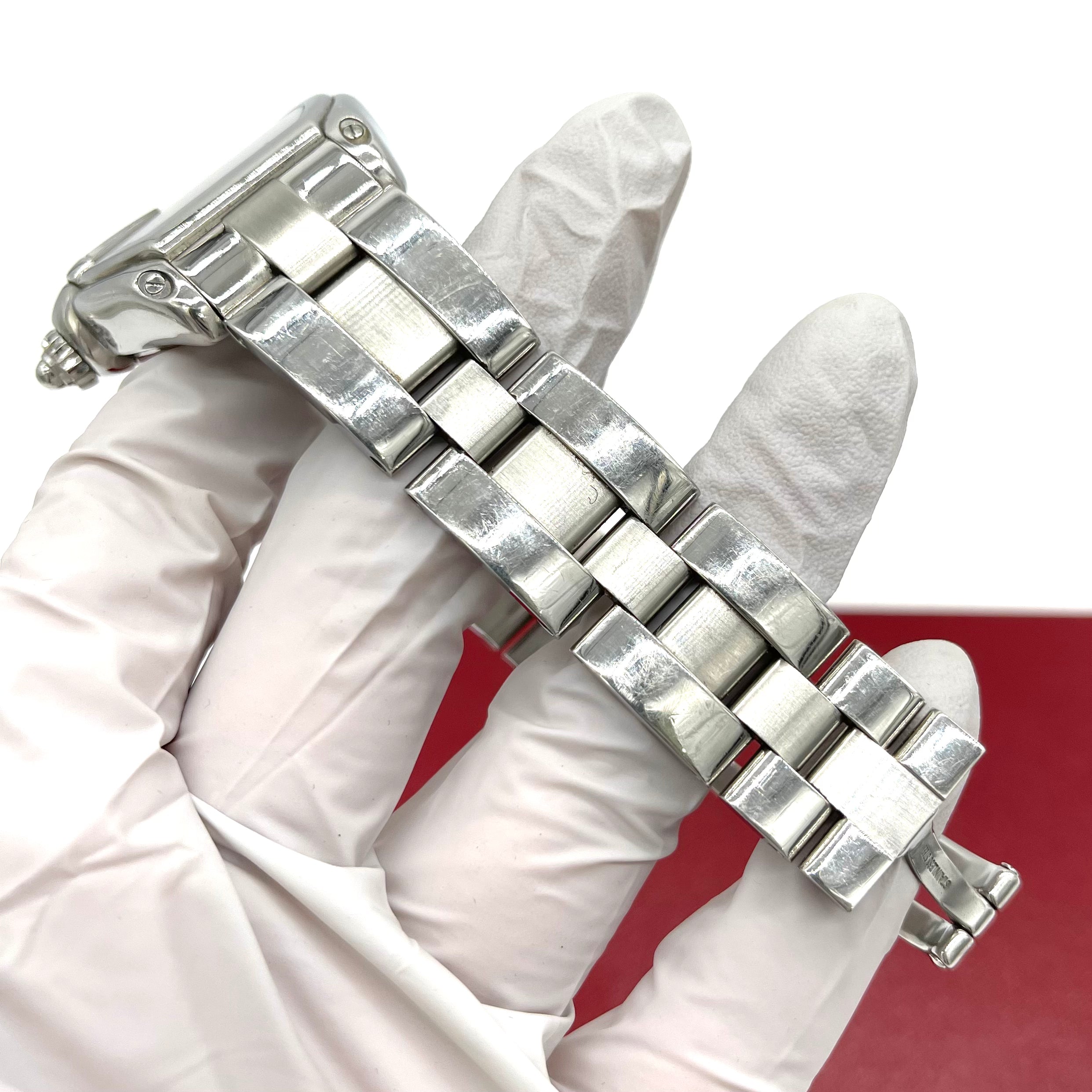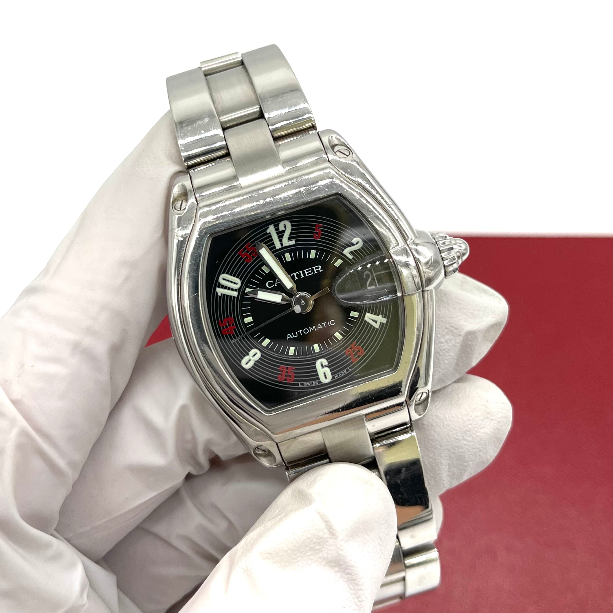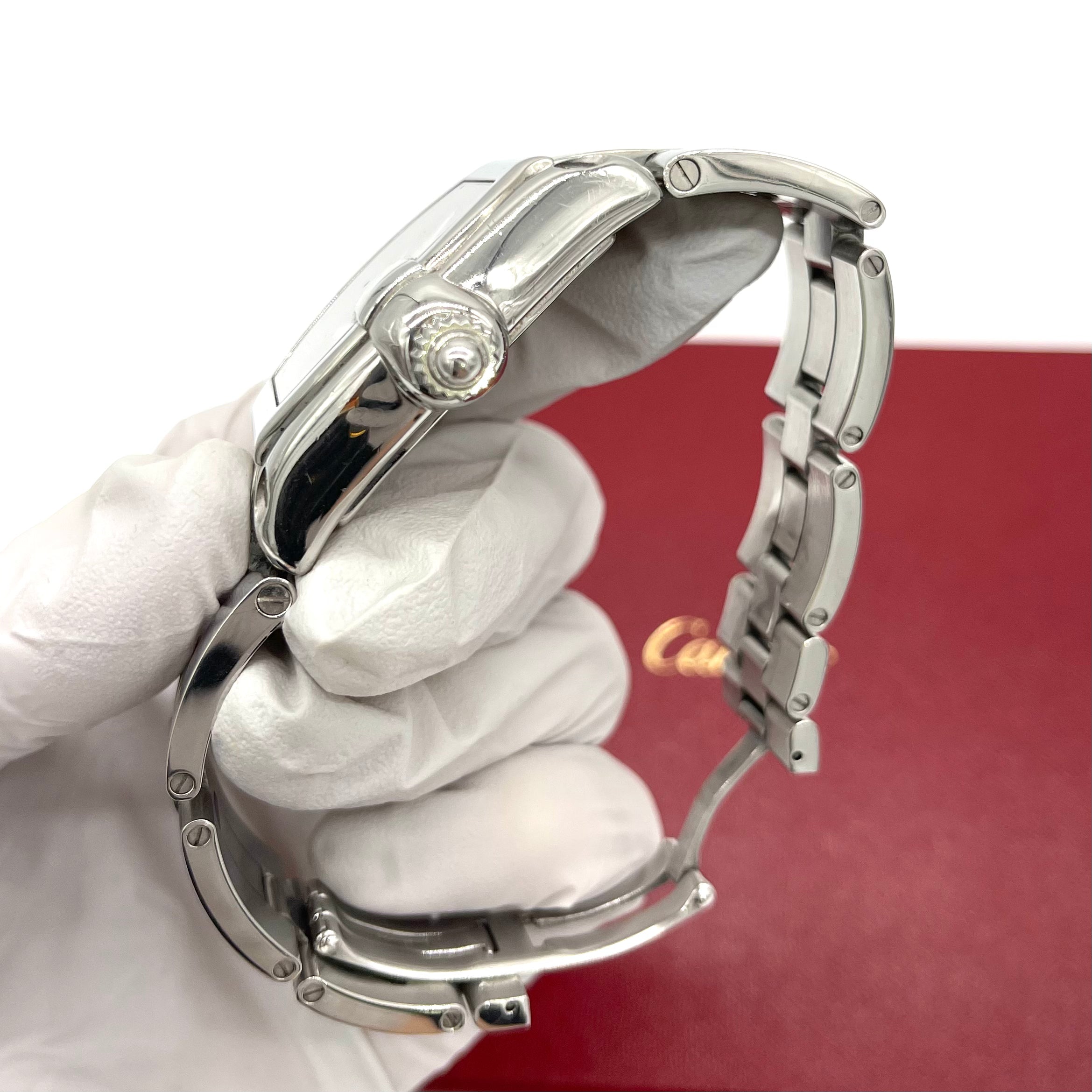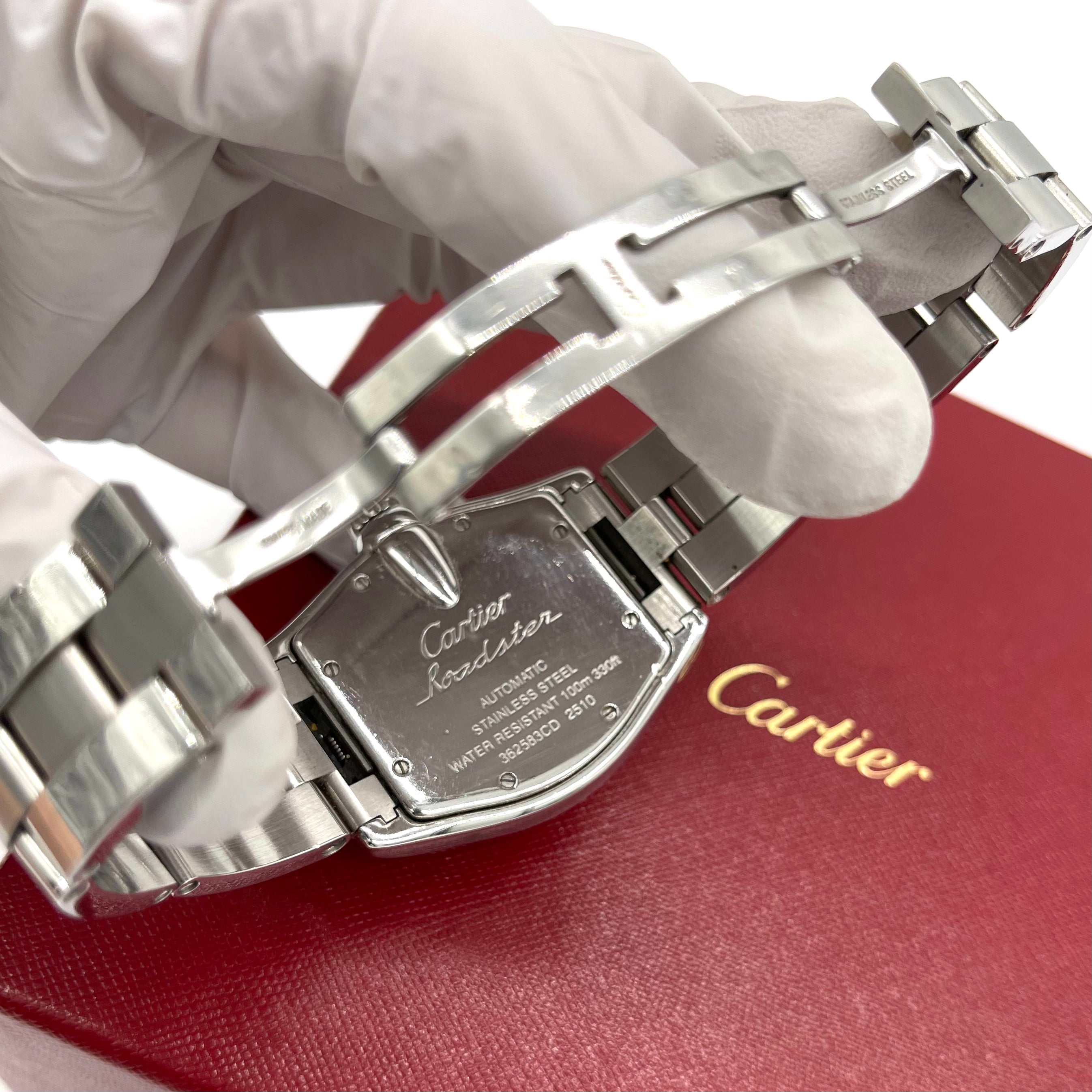 까르띠에 로드스터 W62025V3 / 2510 남성용 시계. 38mm 스테인리스 스틸 케이스, 스테인리스 스틸 매끄러운 베젤. 야광 시계 바늘과 아라비아 숫자 시간 표시가 있는 블랙 다이얼. 3시 위치에 날짜 표시. 내부 다이얼의 분 표시. 숨겨진 나비형 클래스프가 있는 스테인리스 스틸 밴드. 손목 둘레 7인치까지 맞습니다. 사파이어 크리스탈. 오토매틱 와인딩 무브먼트.