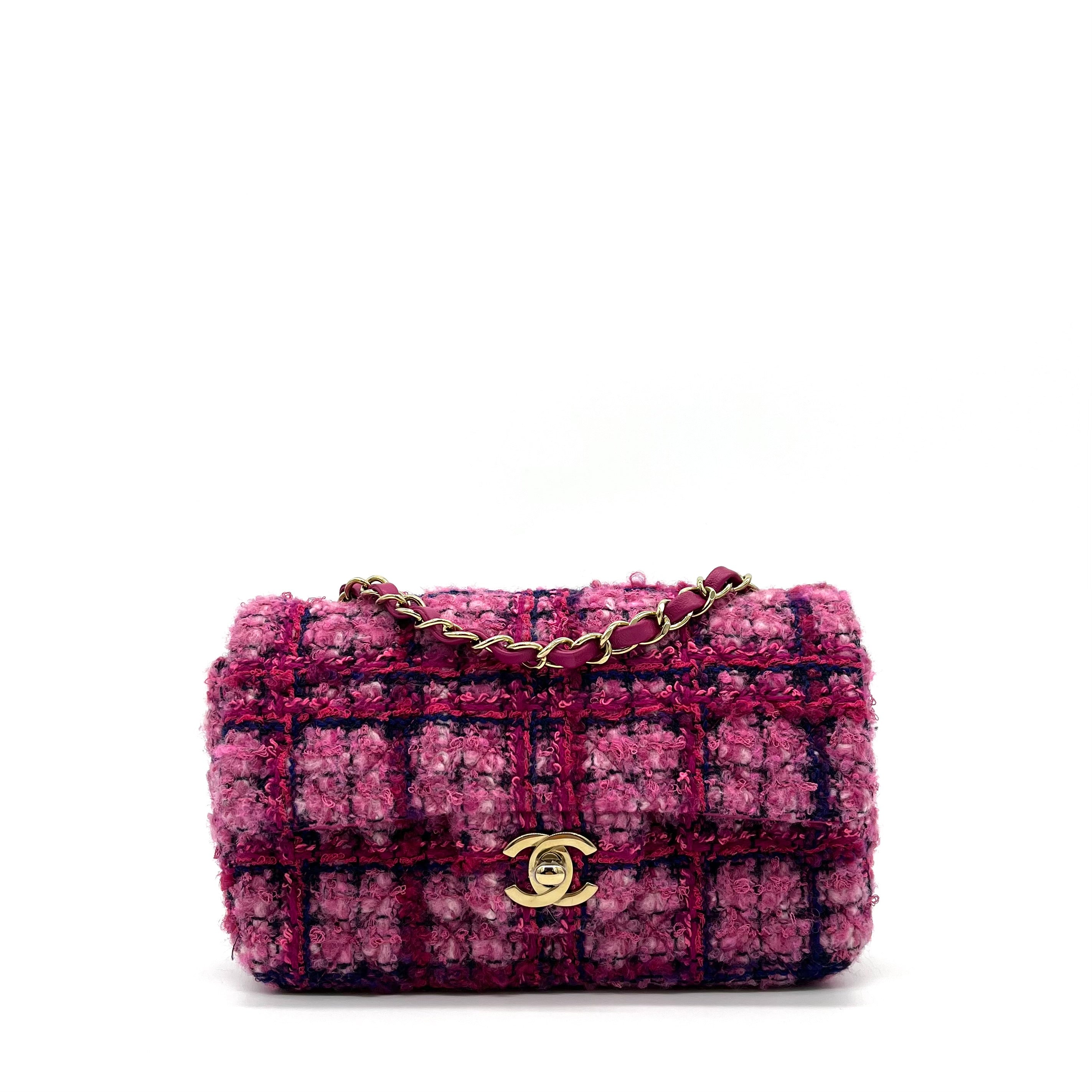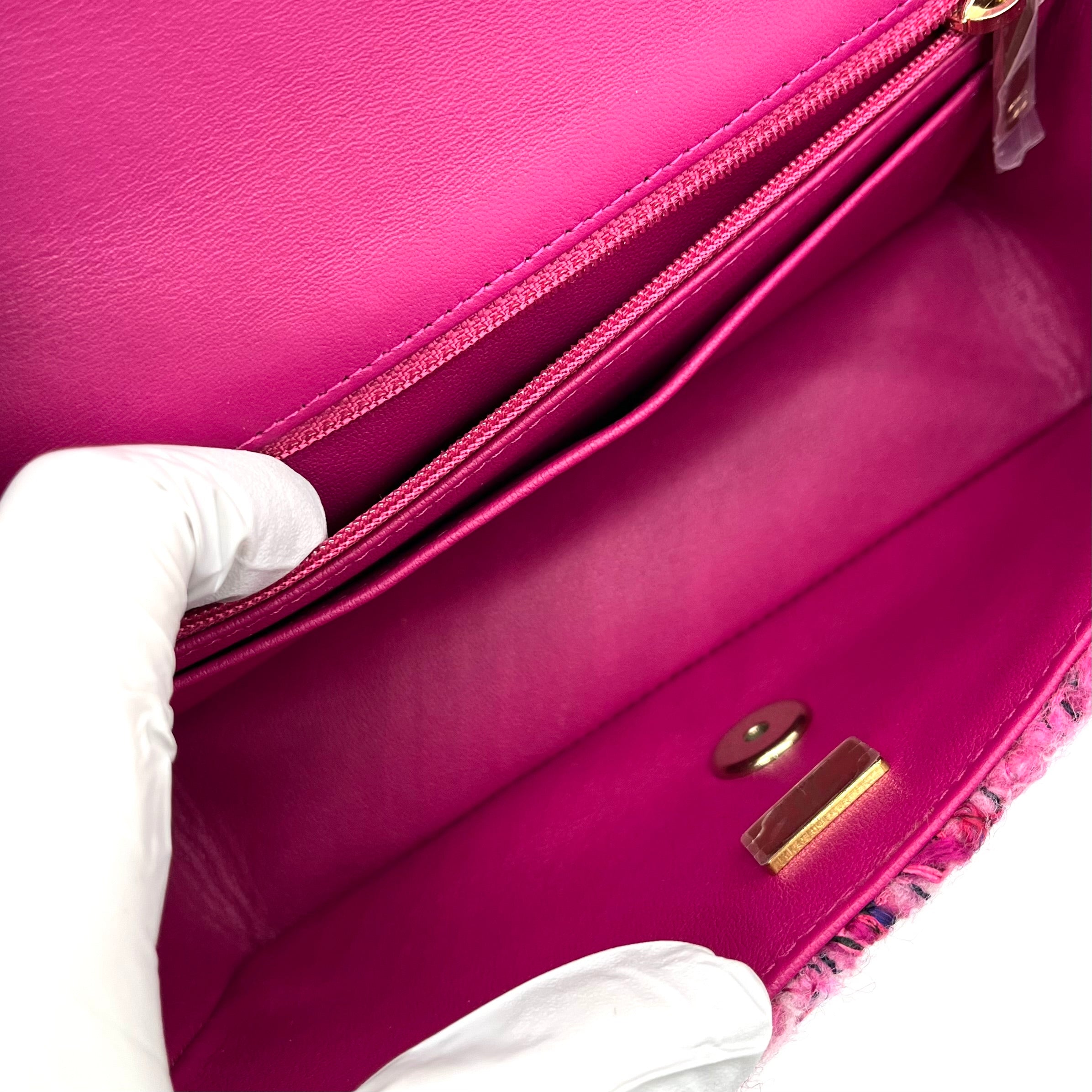 This is an authentic CHANEL 23/24 Metiers d'Art Pink Wool mini bag in Fuchsia and Purple. This stunning wallet on chain is crafted of luxurious tweed fabric in fuchsia and purple with Chanel ribbon accents. The bag features a light gold leather threaded chain-link shoulder strap. This opens to a fuchsia leather and fabric interior with card slots, patch pockets, and zipper compartments.