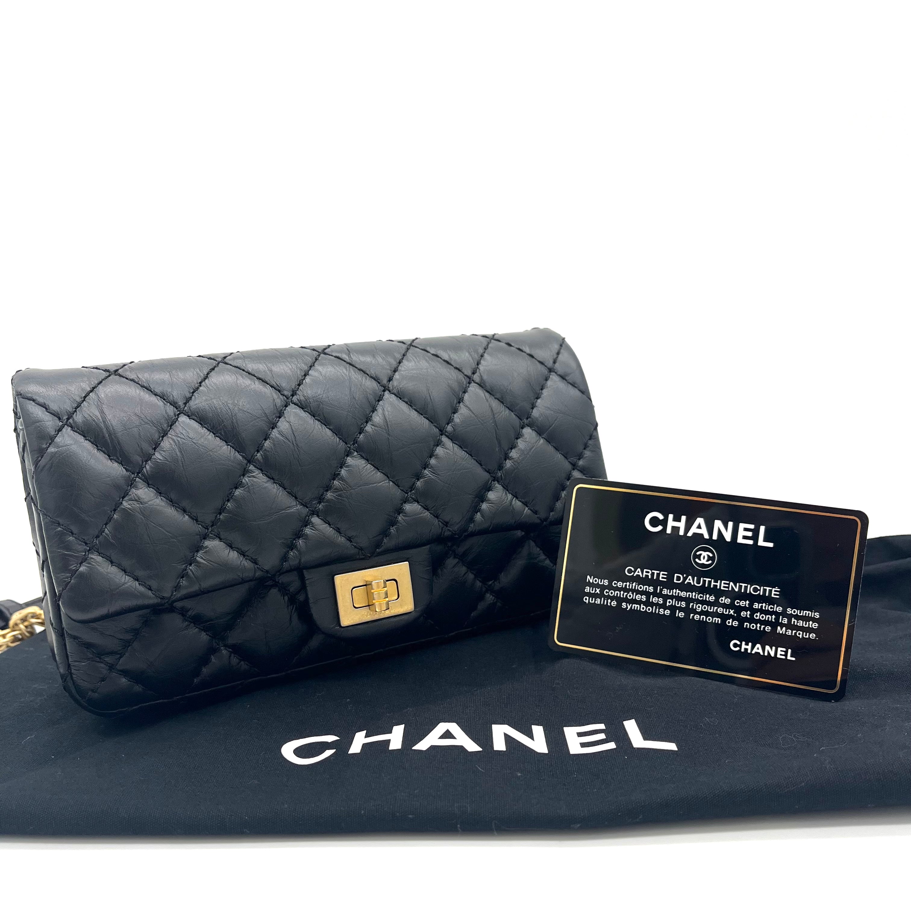 This is an authentic CHANEL Aged Calfskin Quilted 2.55 Reissue Flap Belt Bag Clutch in Black. This stylish waist bag is finely crafted of diamond quilted black calfskin. The bag features a leather belt strap waist strap with adjustment holes. This opens to a black calfskin interior with a patch pocket.