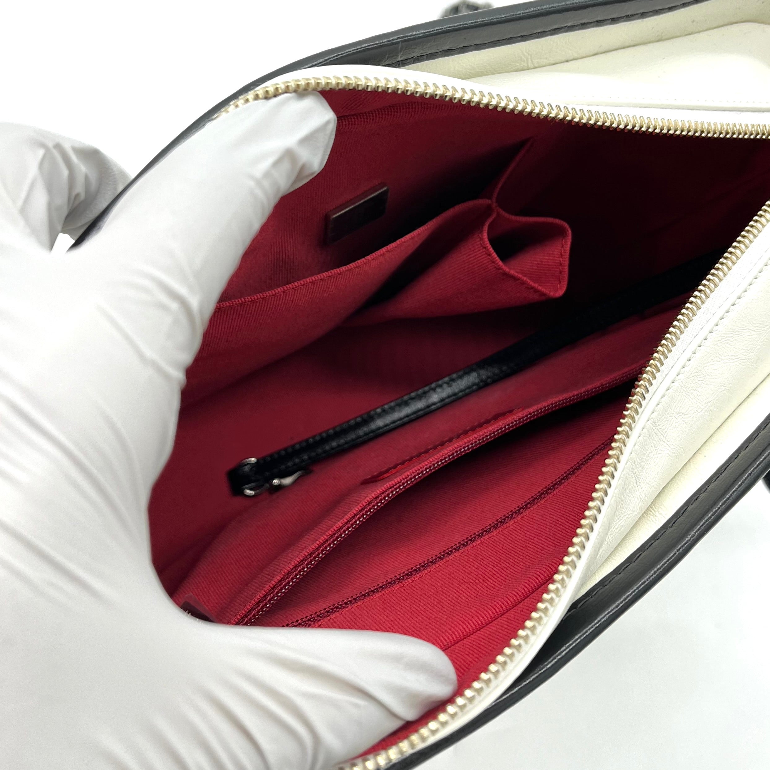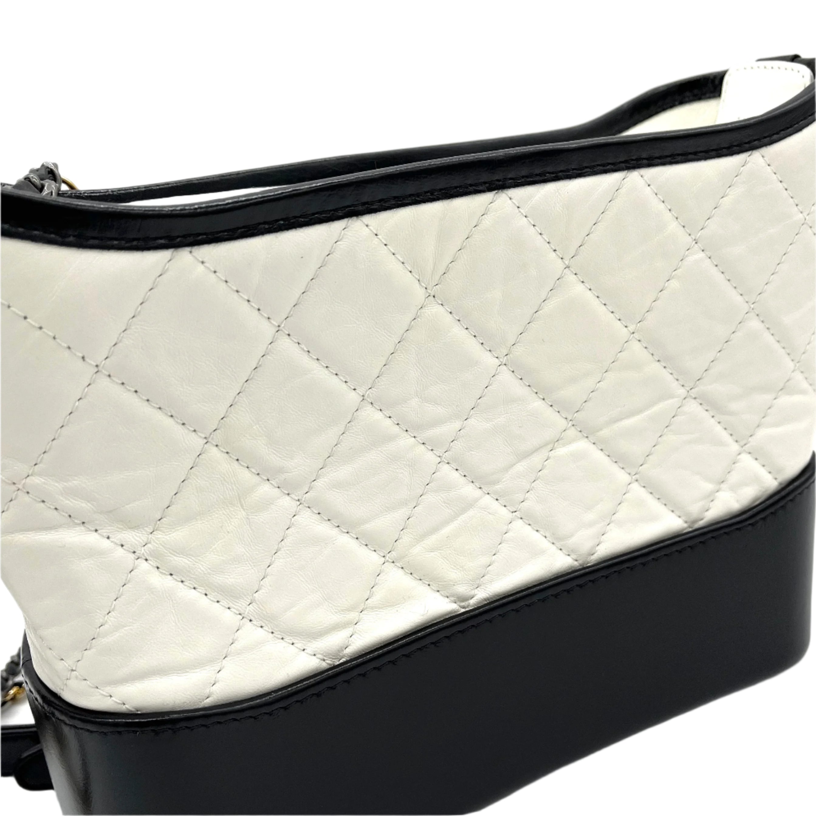This is an authentic CHANEL Aged Calfskin Quilted New Medium Gabrielle Hobo in White. This chic shoulder bag is crafted of aged, diamond-stitched calfskin leather in white with a sturdy smooth black leather base. The bag features a dual leather-threaded gradient aged ruthenium to polished gold chain-link shoulder strap with a shoulder pad. The top zipper opens to a red fabric interior with zipper and patch pockets.