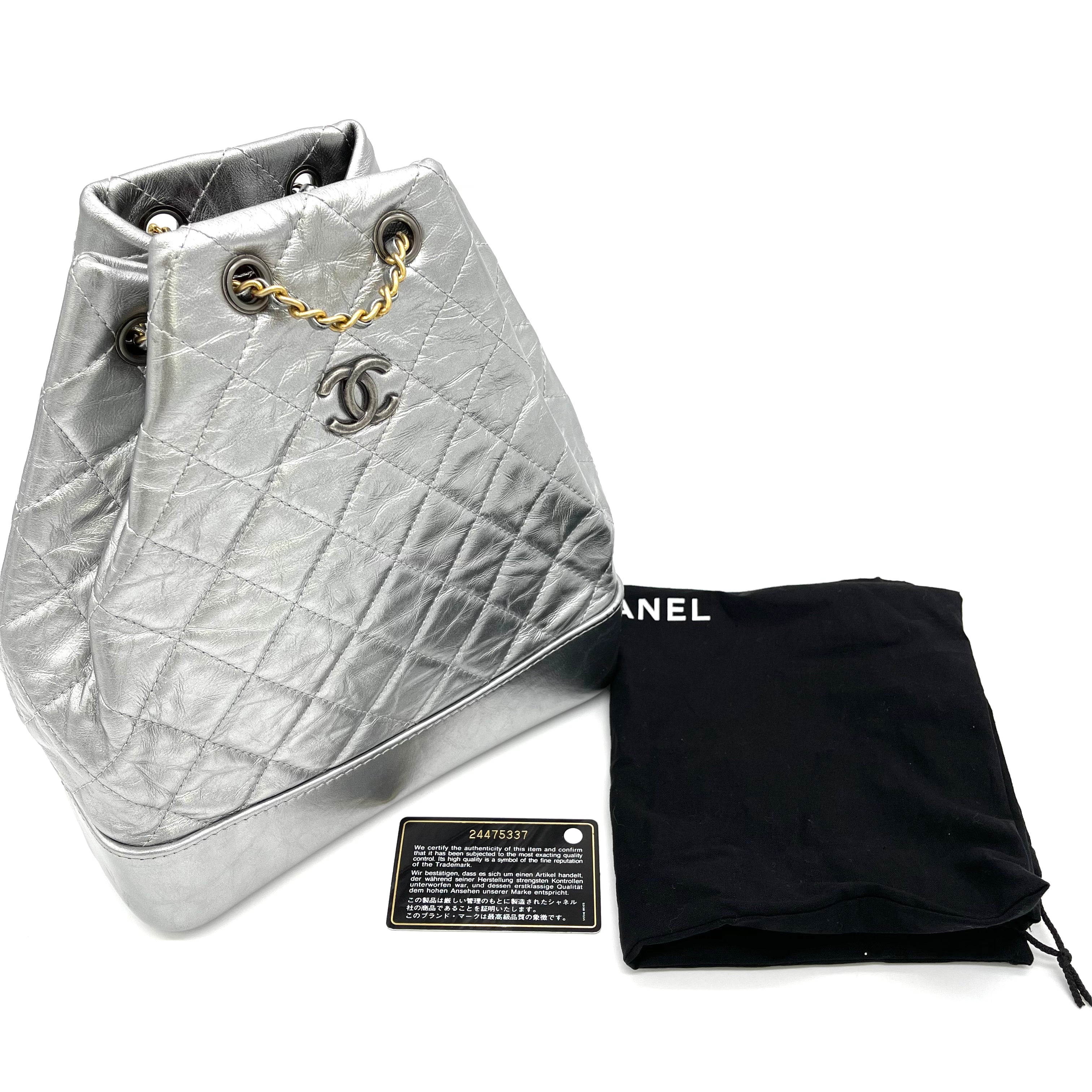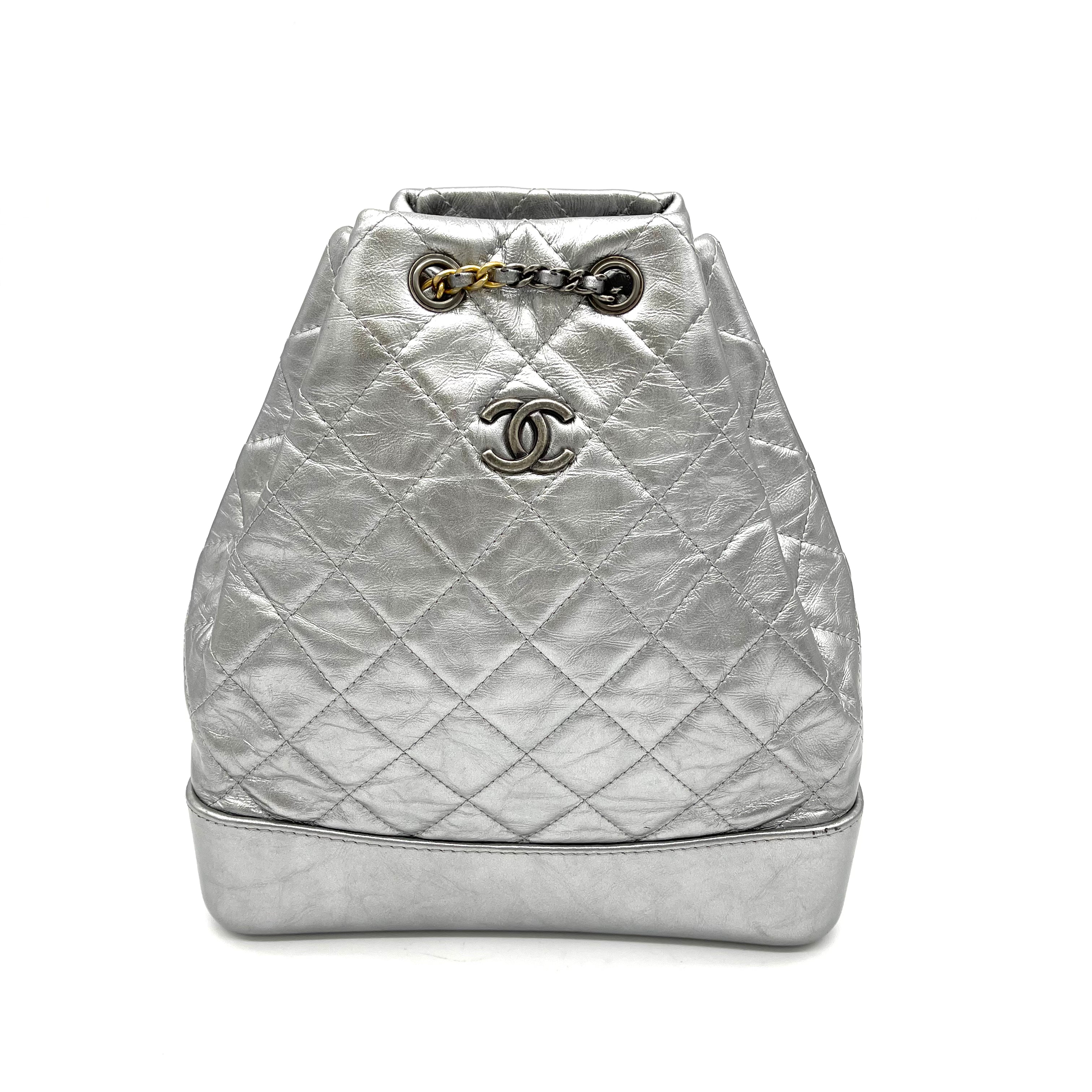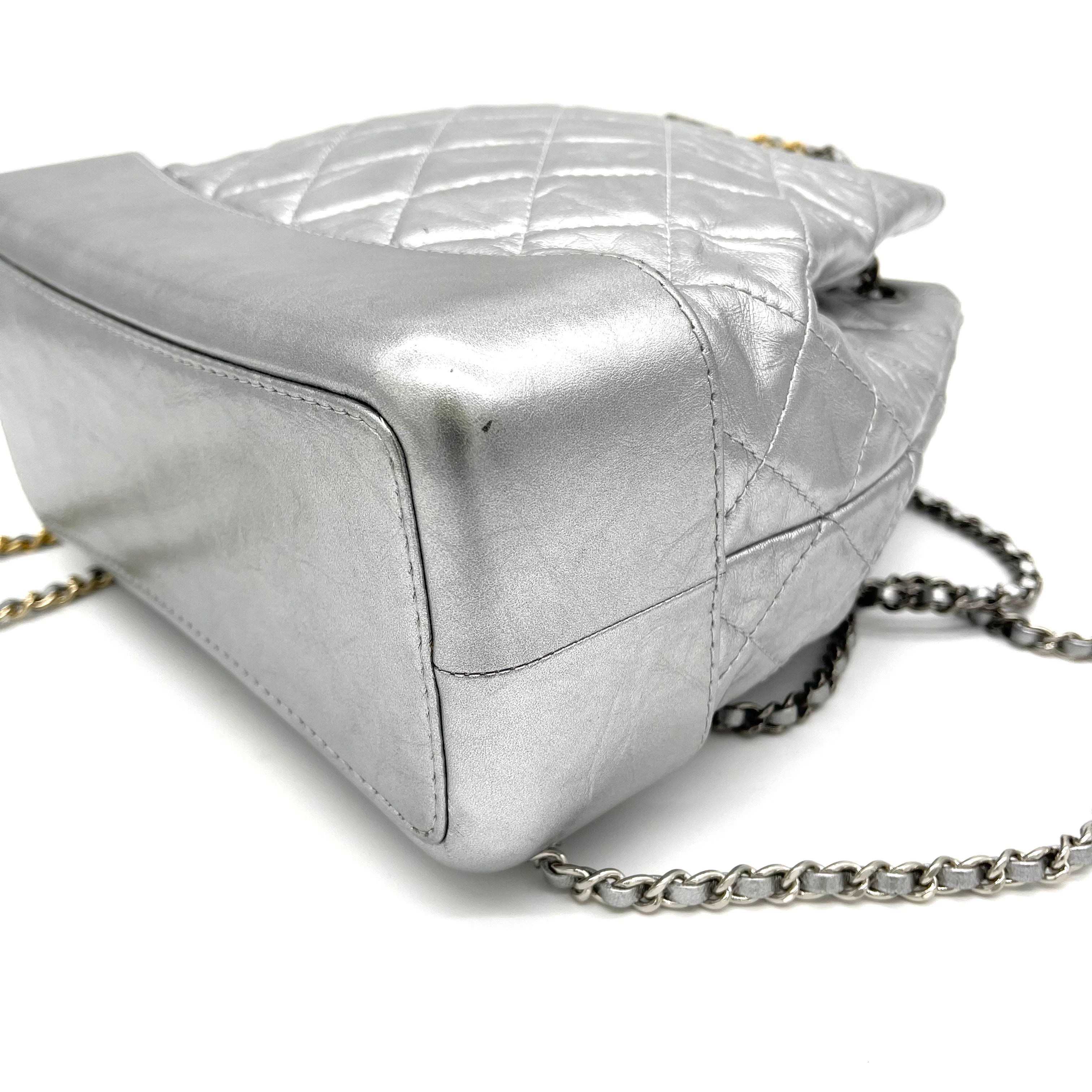 샤넬 정품 송아지 가죽 퀼팅 스몰 가브리엘 실버 백팩입니다. 이 시크한 백팩은 다이아몬드 퀼팅 처리된 실버 컬러의 송아지 가죽으로 제작되었습니다. 숄더백은 부드러운 실버 가죽 베이스, 루테늄 CC 로고, 루테늄, 오래된 광택 처리된 골드 및 실버 체인 스레드 가죽 숄더 스트랩과 오픈형 상단이 특징입니다. 열면 패치 포켓이 있는 넓은 딥 레드 패브릭 내부가 보입니다.