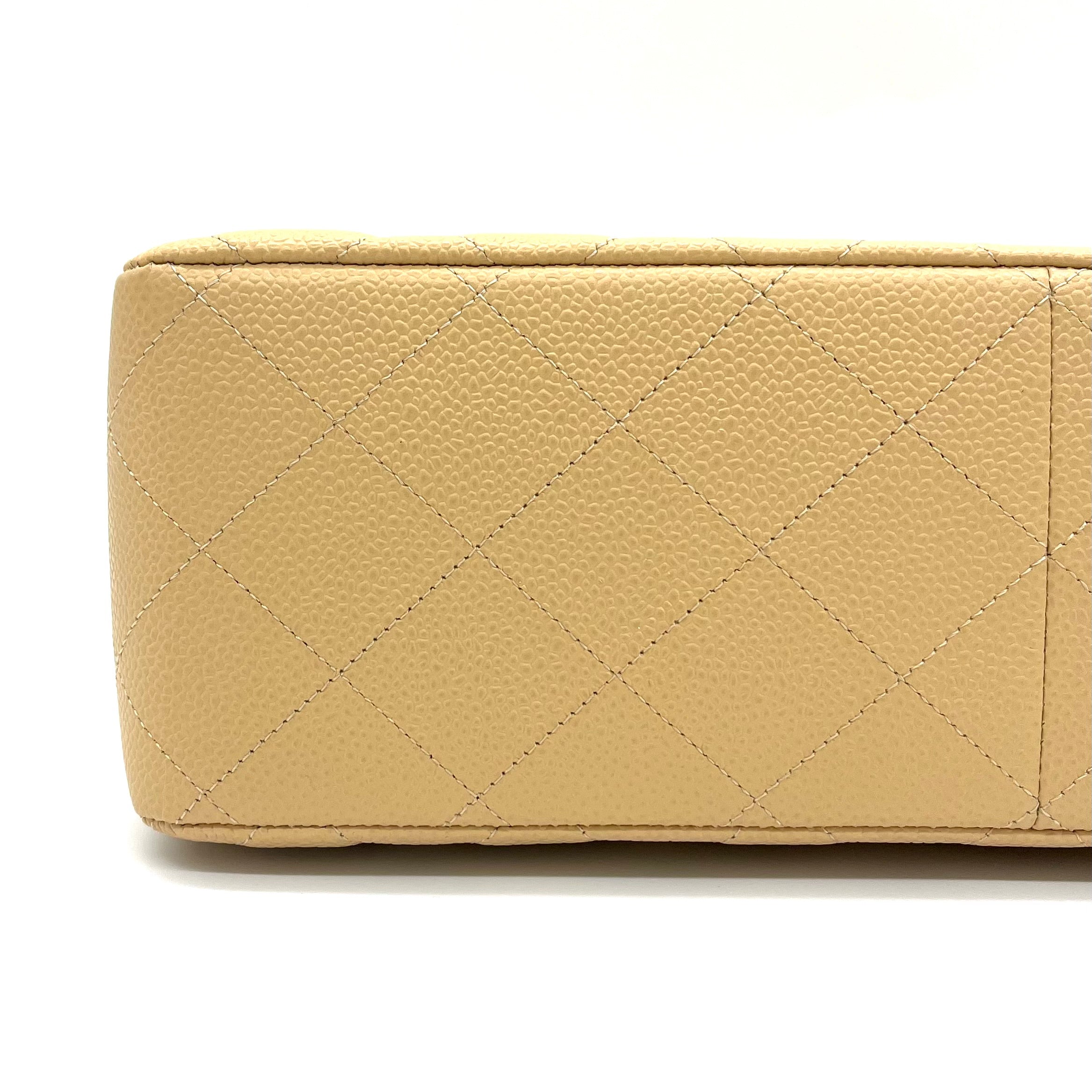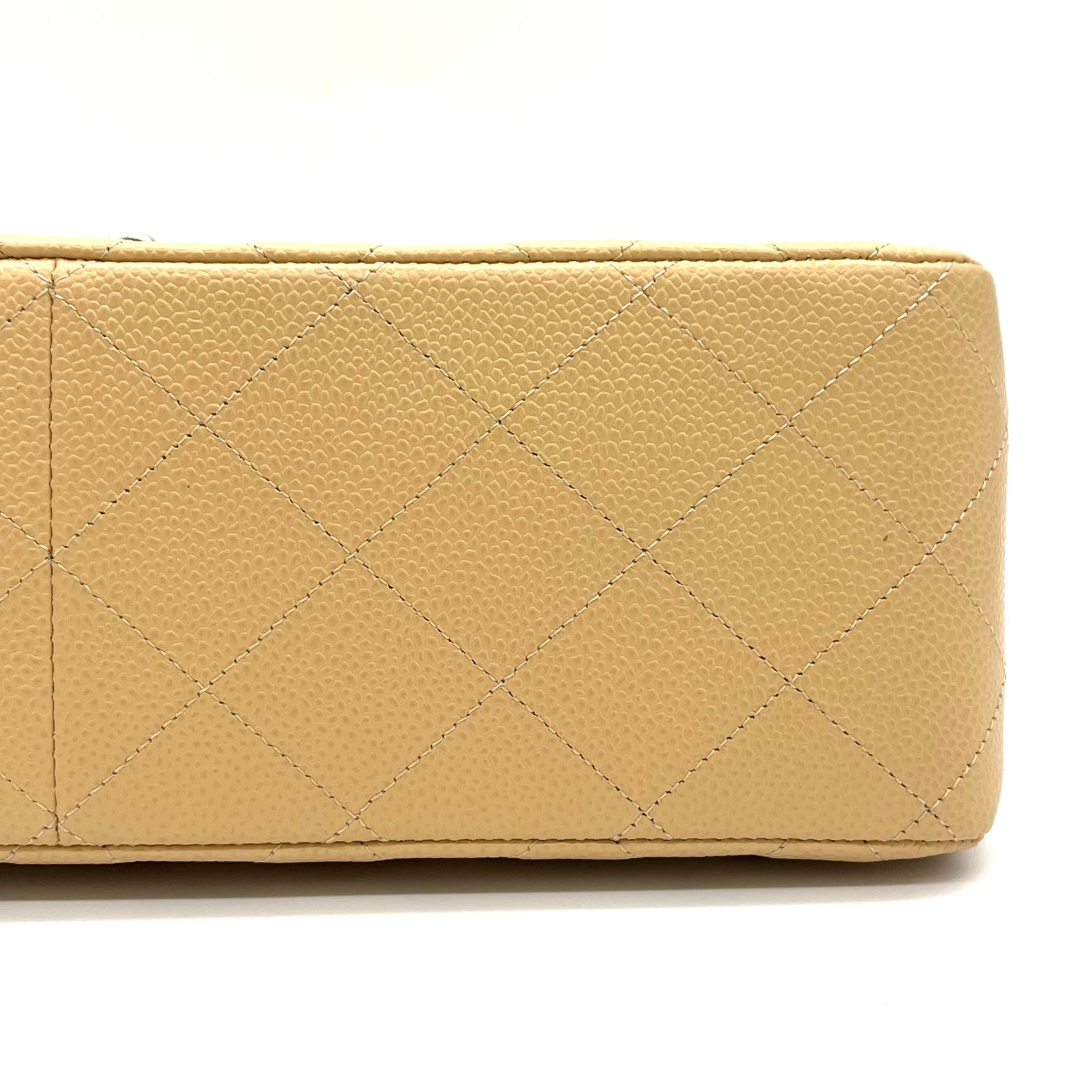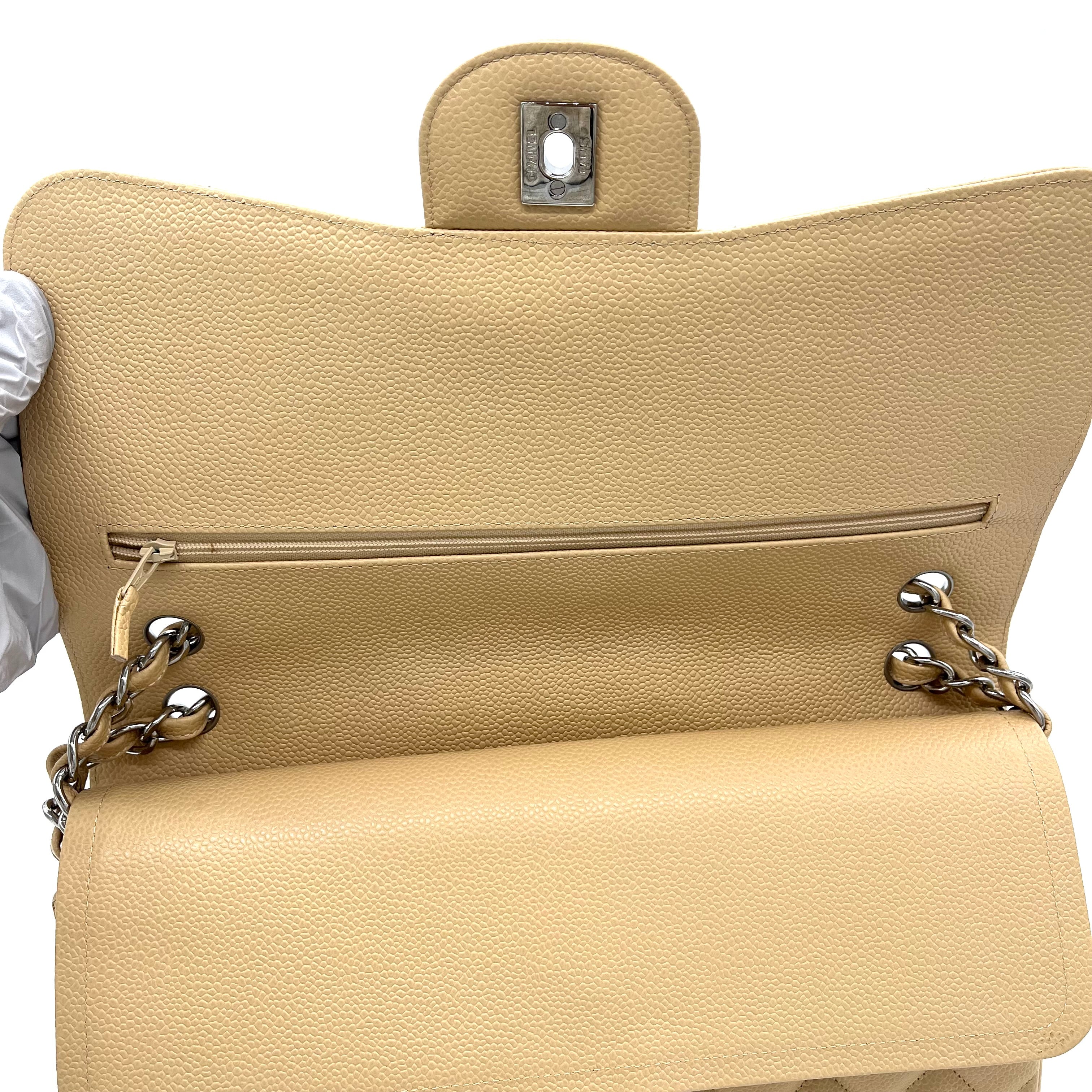 This is an authentic CHANEL Caviar Quilted Jumbo Double Flap in Beige. This stylish shoulder bag is crafted of luxurious diamond quilted caviar leather in beige. This bag features a leather threaded silver chain-link shoulder strap and a rear pocket. The Chanel CC turn-lock opens to an inner flap and matching leather interior with patch pockets.