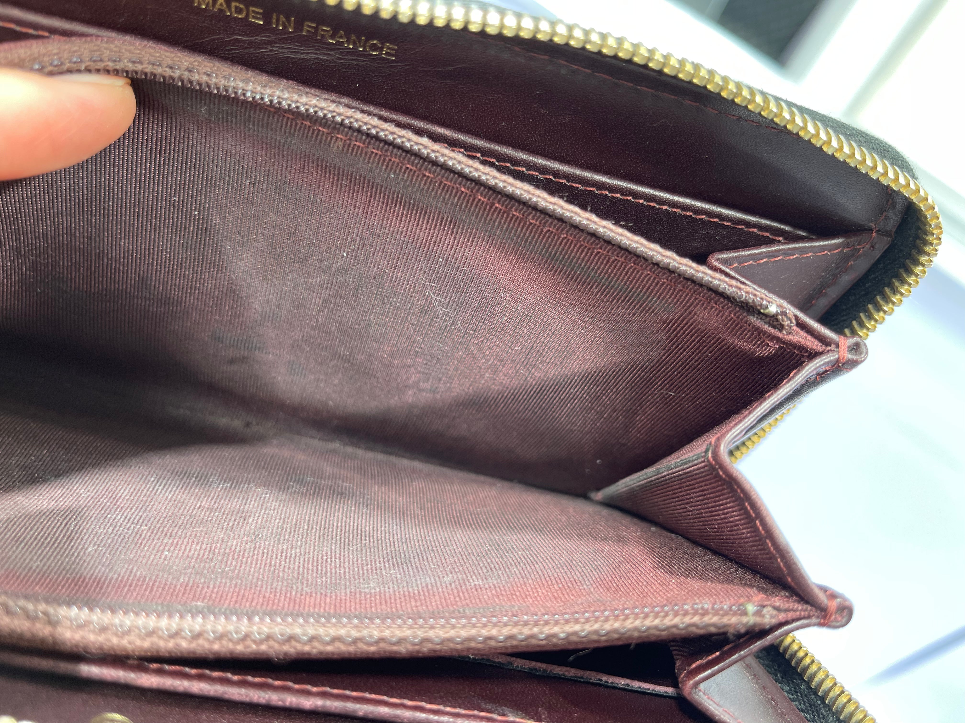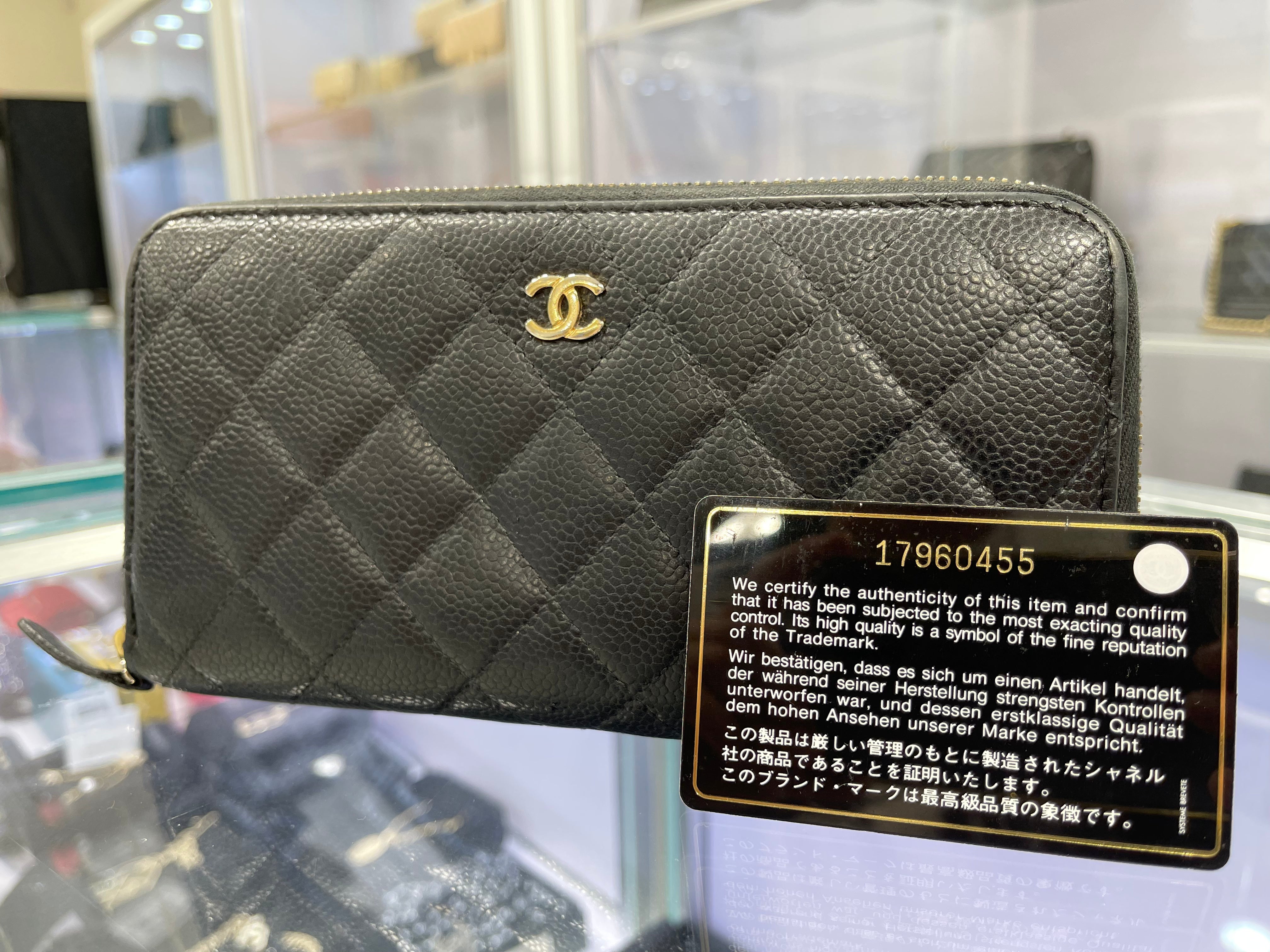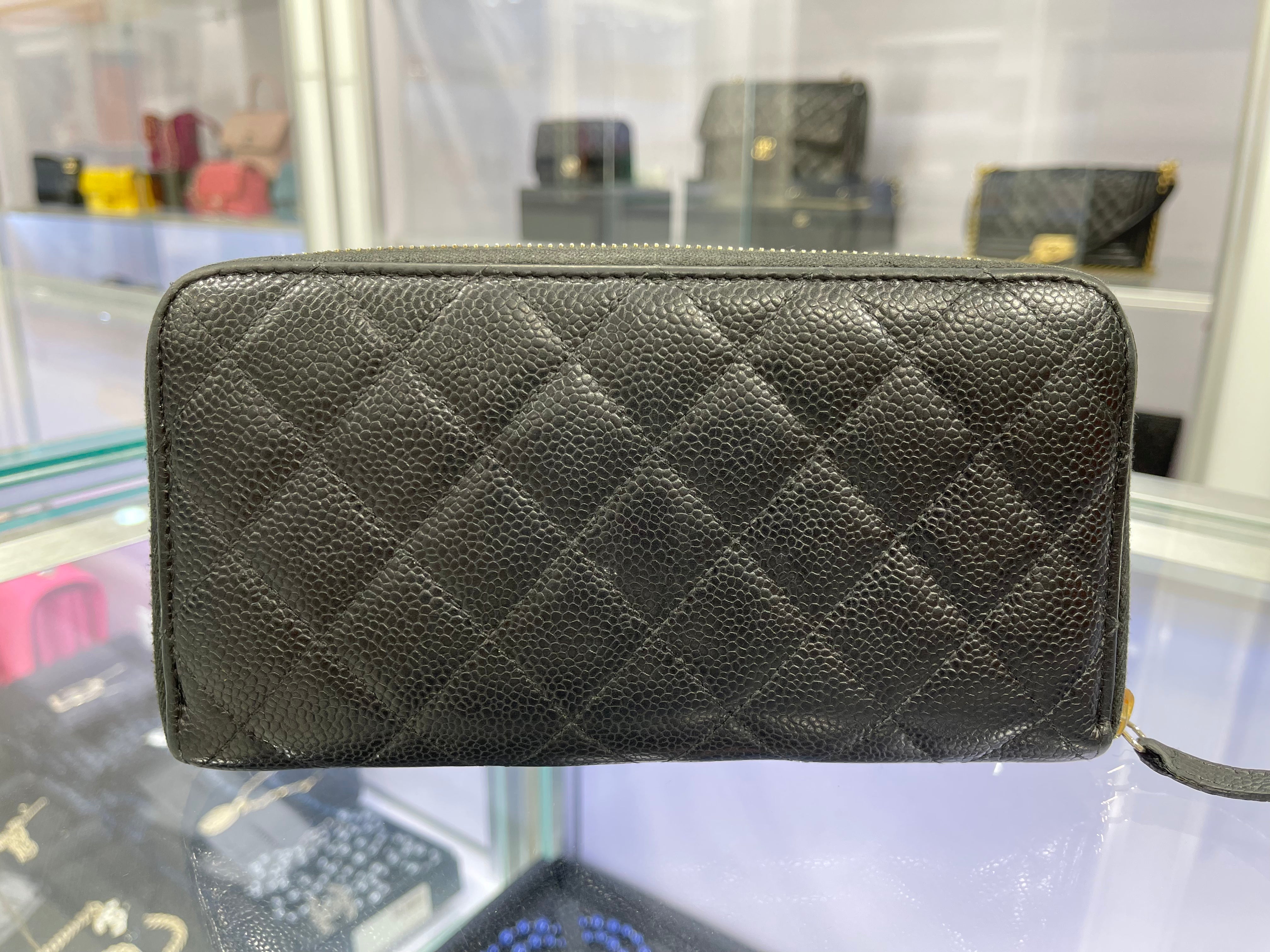 블랙 색상의 정품 샤넬 캐비어 퀼팅 라지 거싯 지퍼 어라운드 지갑입니다. 이 시크한 지갑은 블랙 색상의 퀼팅 캐비어 가죽으로 제작되었으며 작은 골드 샤넬 CC 로고가 새겨져 있습니다. 지퍼를 열면 칸막이된 버건디 가죽 내부, 카드 슬롯용 패널 2개, 중앙 지퍼 수납공간으로 구성됩니다.