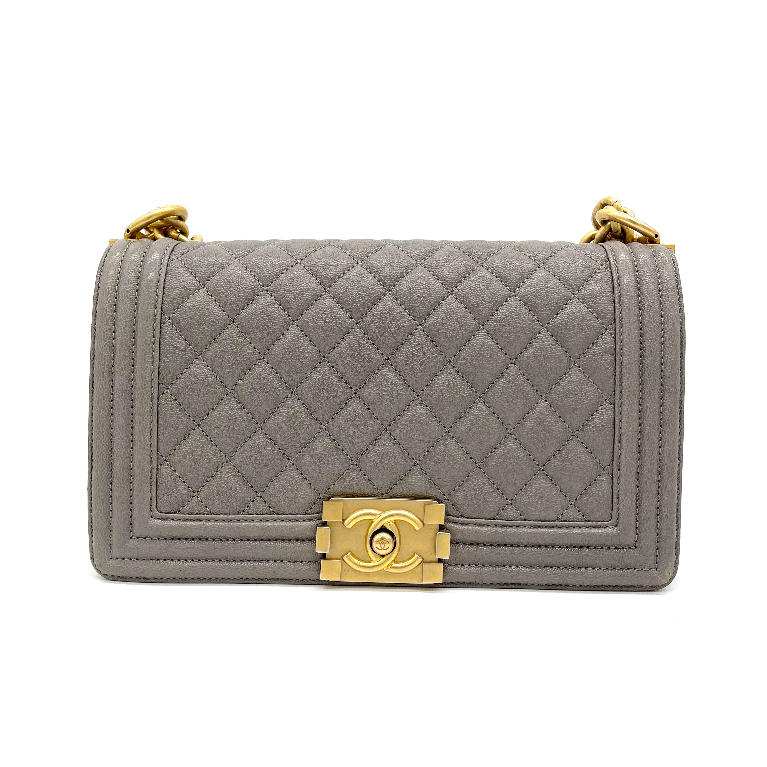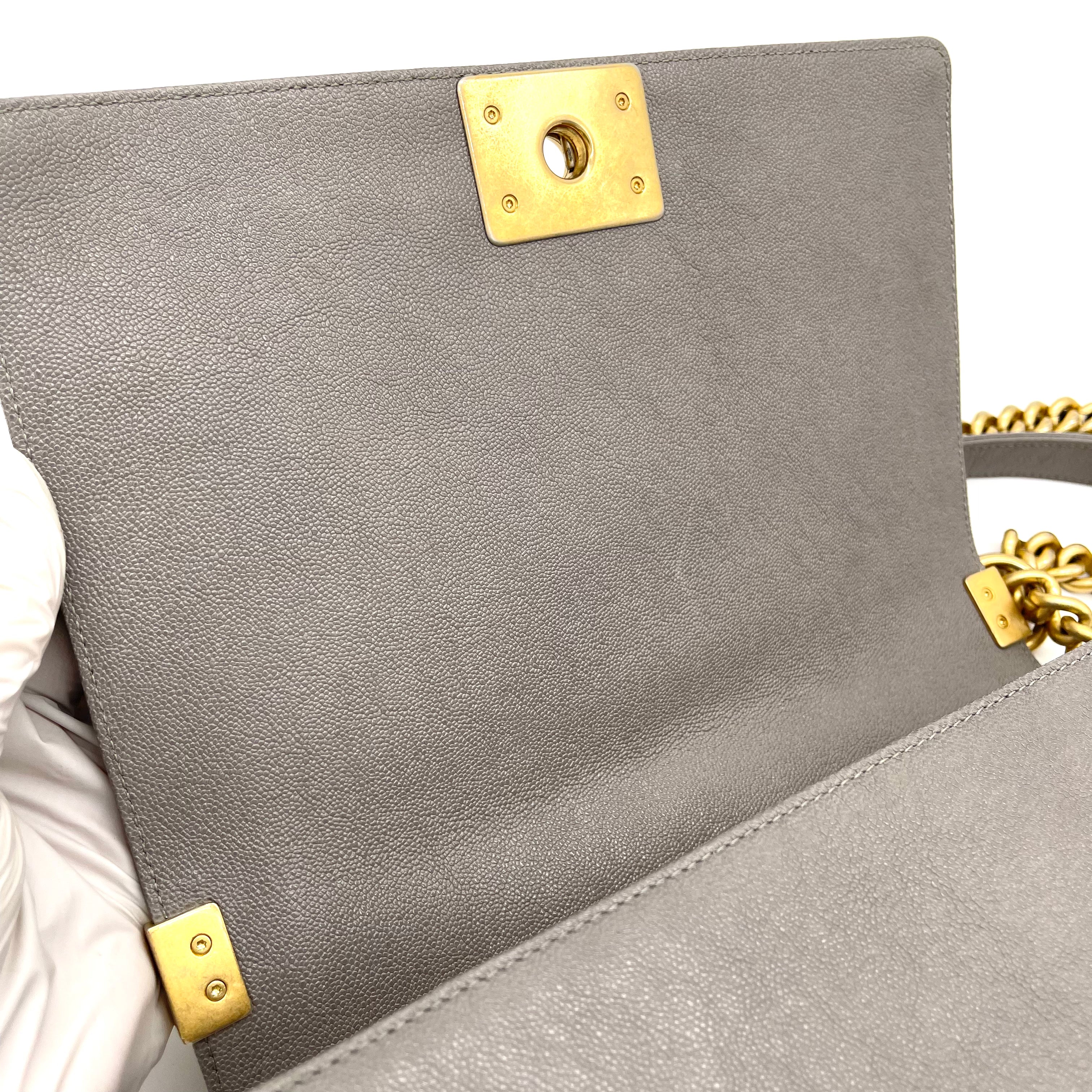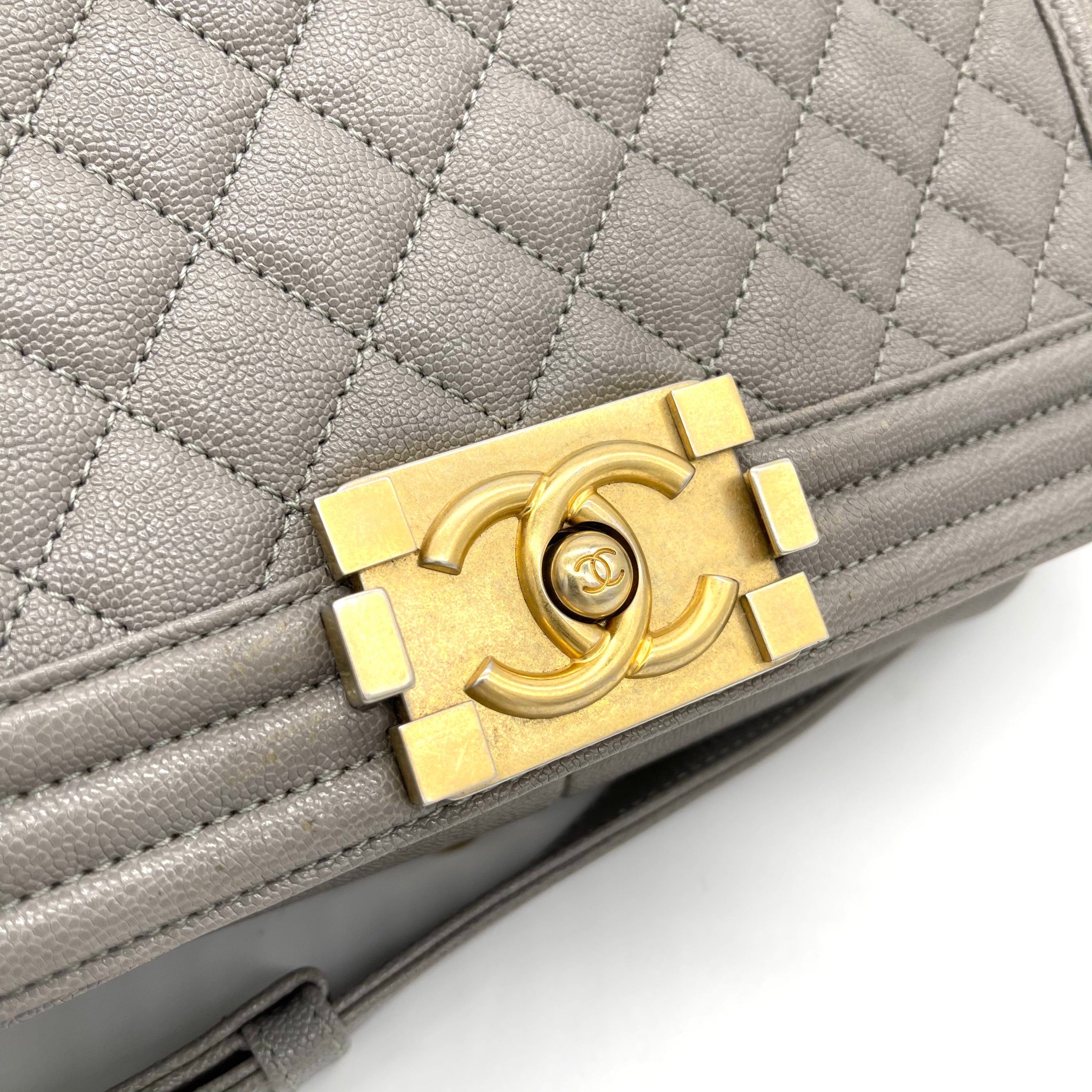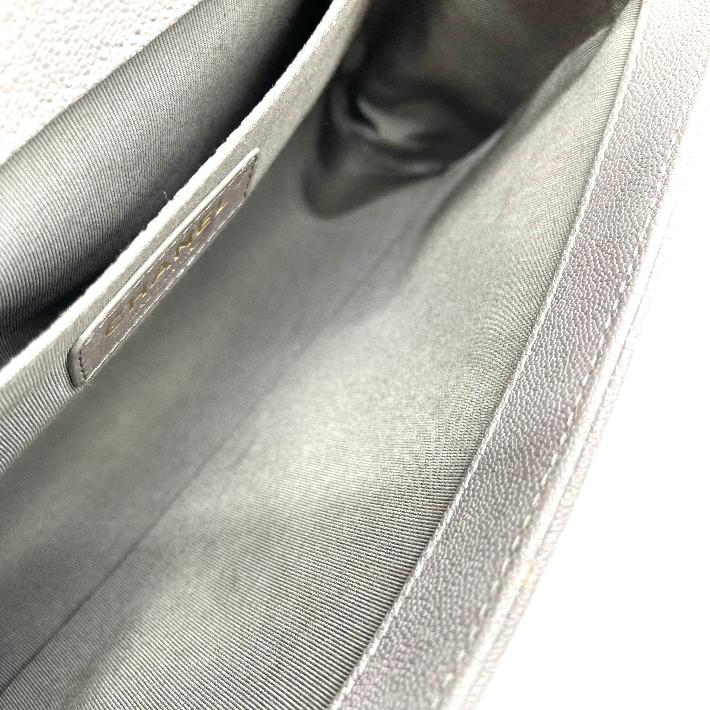 그레이 색상의 정품 샤넬 캐비어 퀼팅 미디엄 보이 플랩입니다. 고급스러운 질감의 다크 골드 다이아몬드 퀼팅 캐비어 가죽과 선형 퀼팅 가죽 테두리로 제작된 시크한 숄더백입니다. 이 가방은 어깨 패드가 있는 루테늄 체인 링크 어깨 스트랩과 전면 루테늄 보이 샤넬 CC 푸시 잠금 장치가 특징입니다. 앞면 플랩을 열면 골드 패브릭 내부에 플랫 포켓이 있습니다.