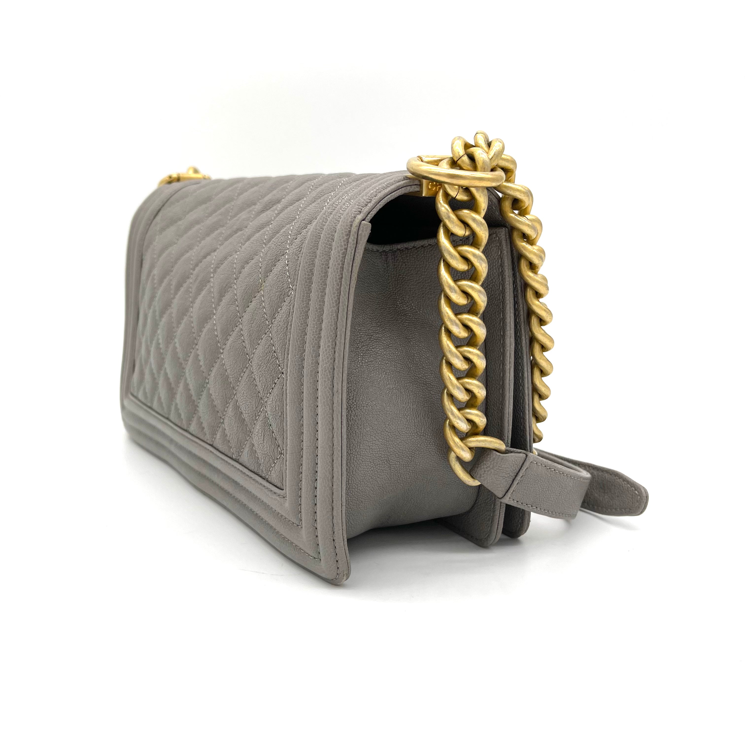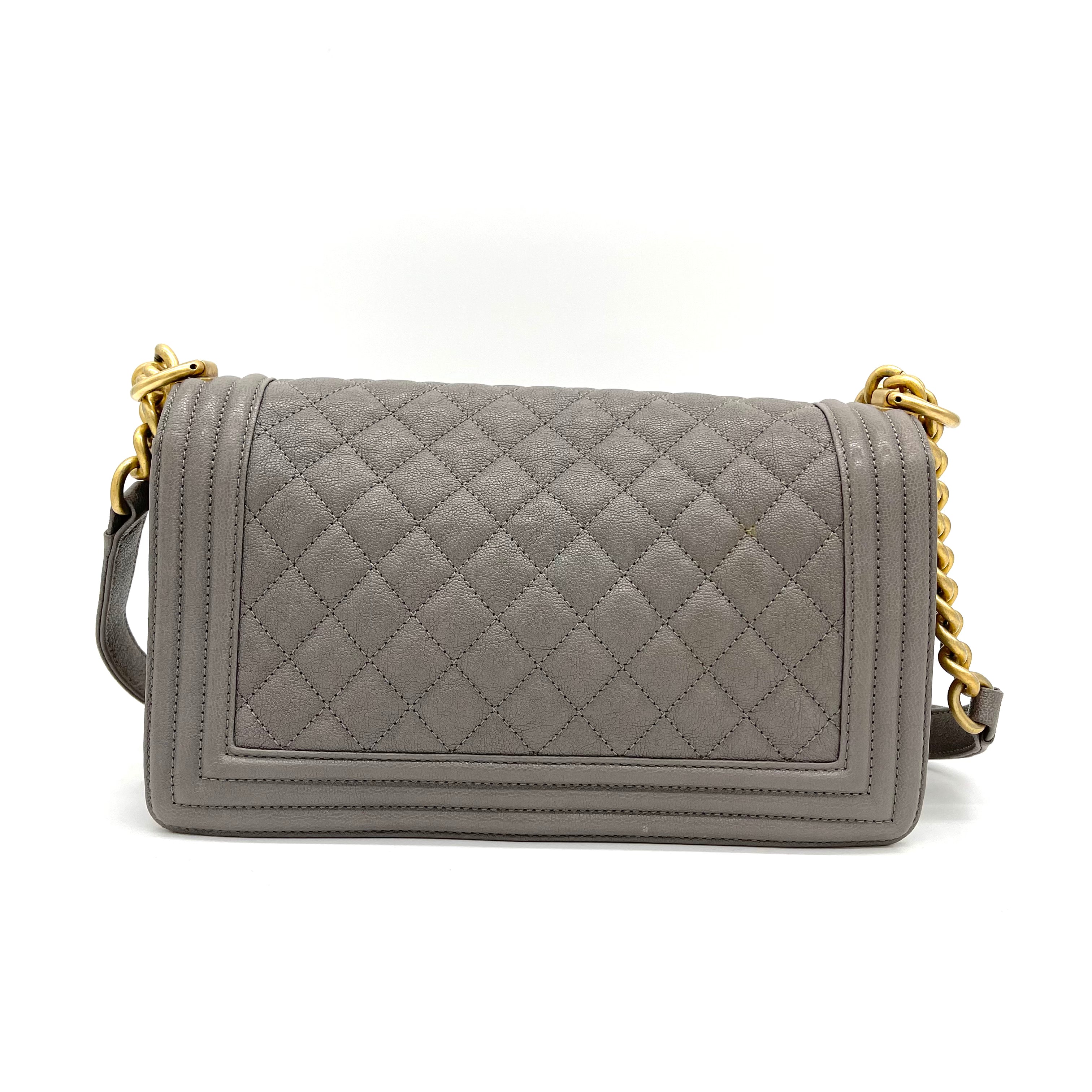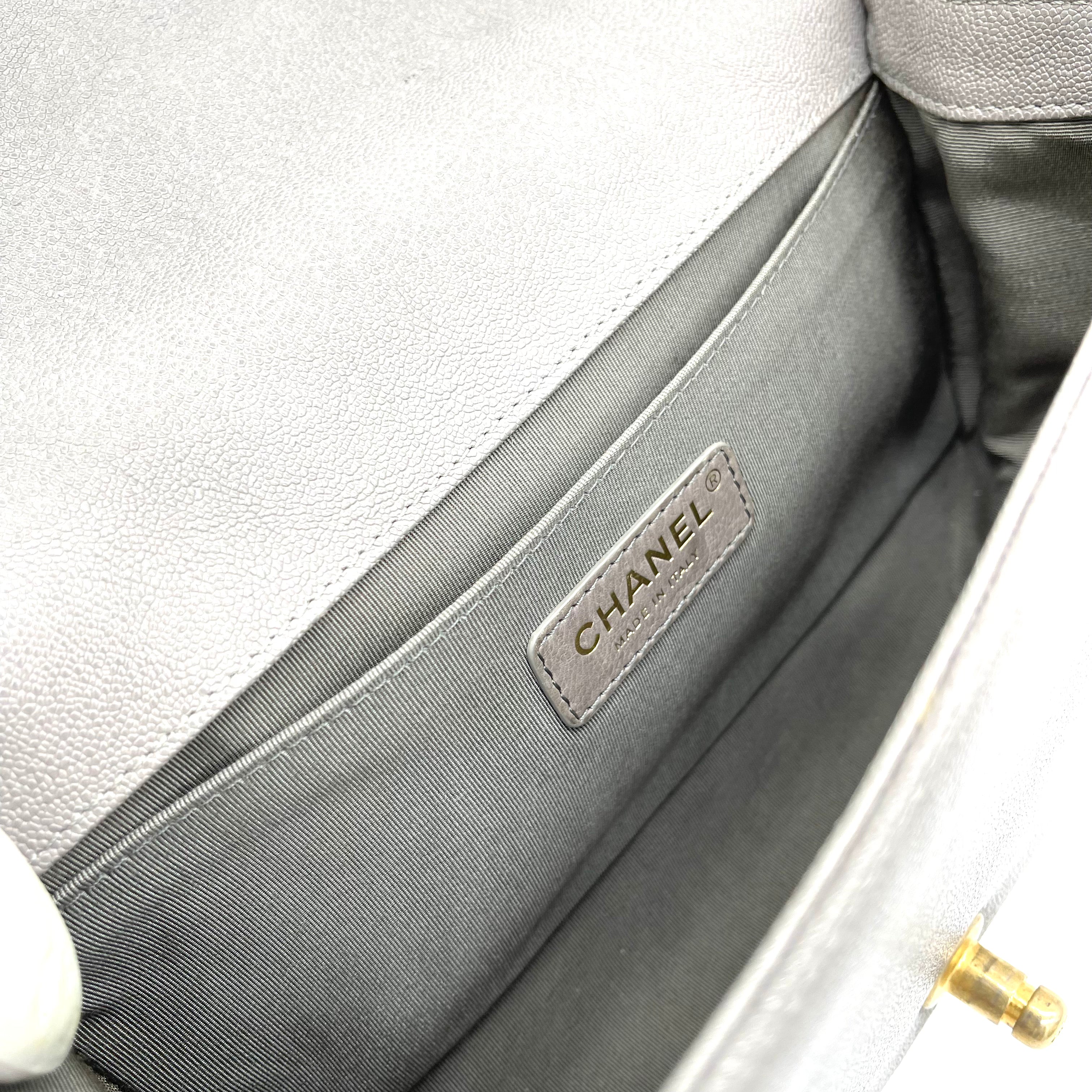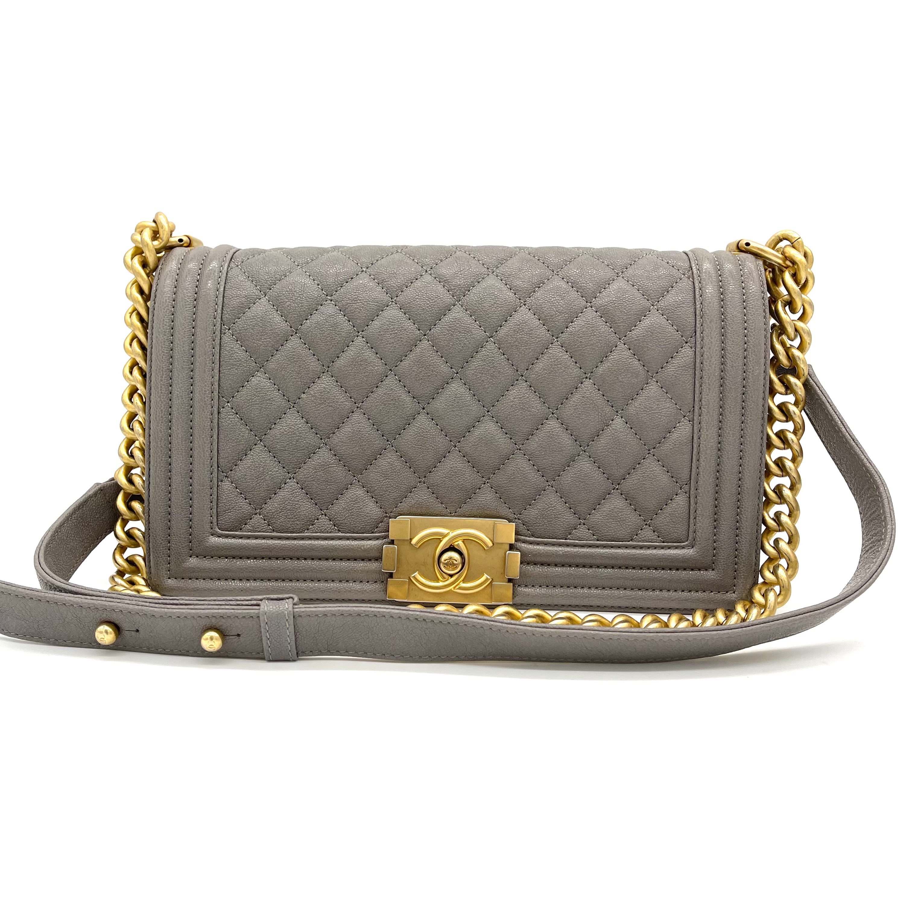 그레이 색상의 정품 샤넬 캐비어 퀼팅 미디엄 보이 플랩입니다. 고급스러운 질감의 다크 골드 다이아몬드 퀼팅 캐비어 가죽과 선형 퀼팅 가죽 테두리로 제작된 시크한 숄더백입니다. 이 가방은 어깨 패드가 있는 루테늄 체인 링크 어깨 스트랩과 전면 루테늄 보이 샤넬 CC 푸시 잠금 장치가 특징입니다. 앞면 플랩을 열면 골드 패브릭 내부에 플랫 포켓이 있습니다.