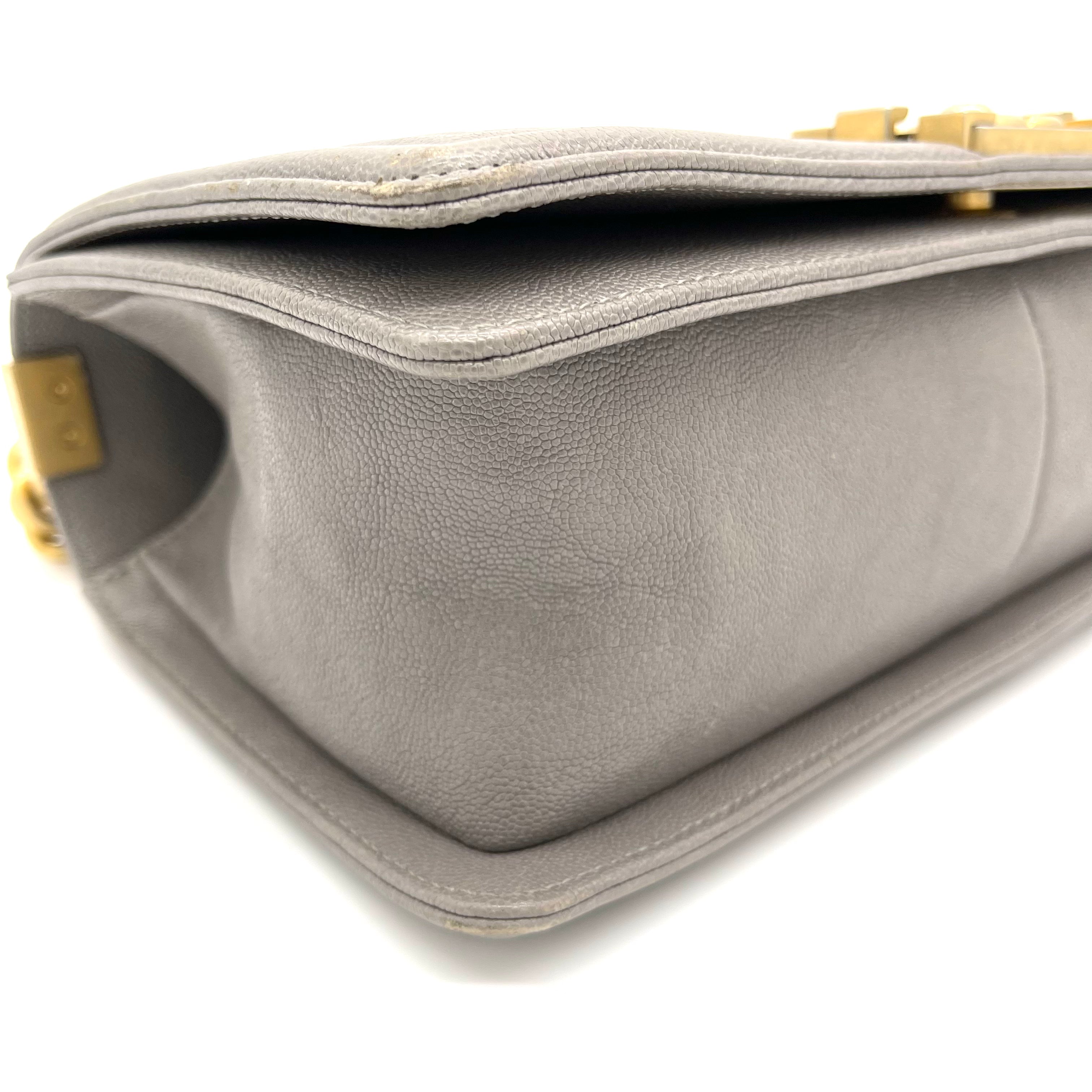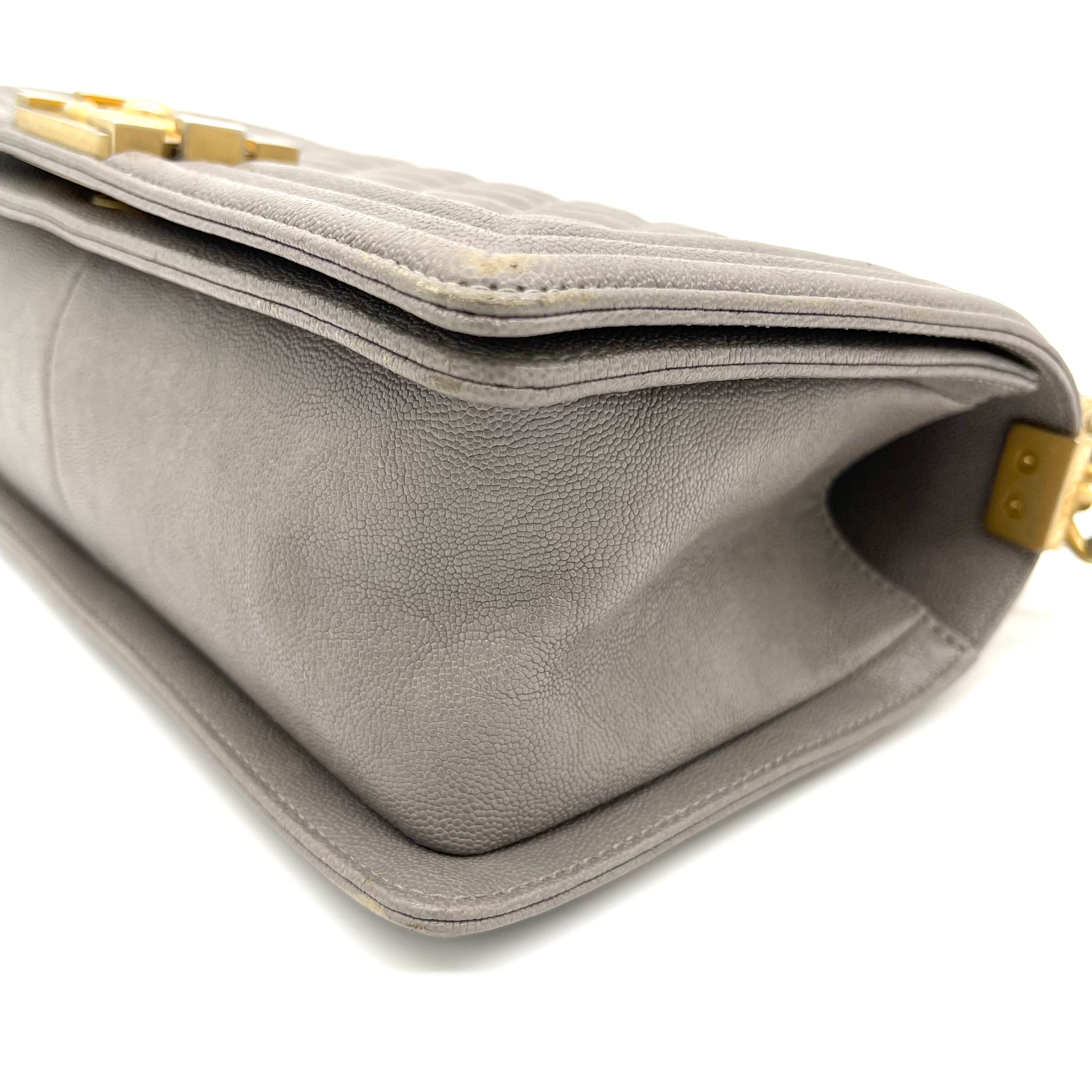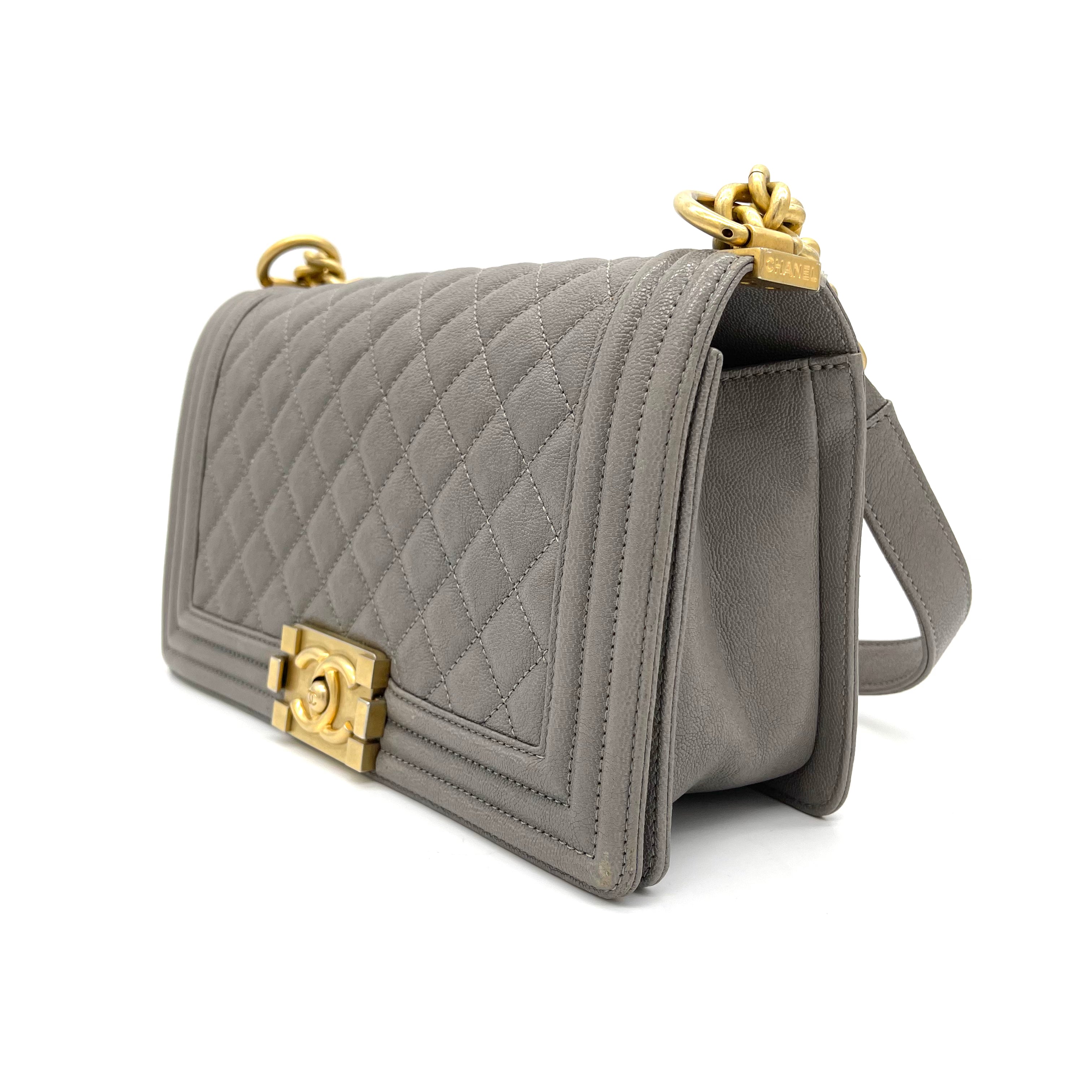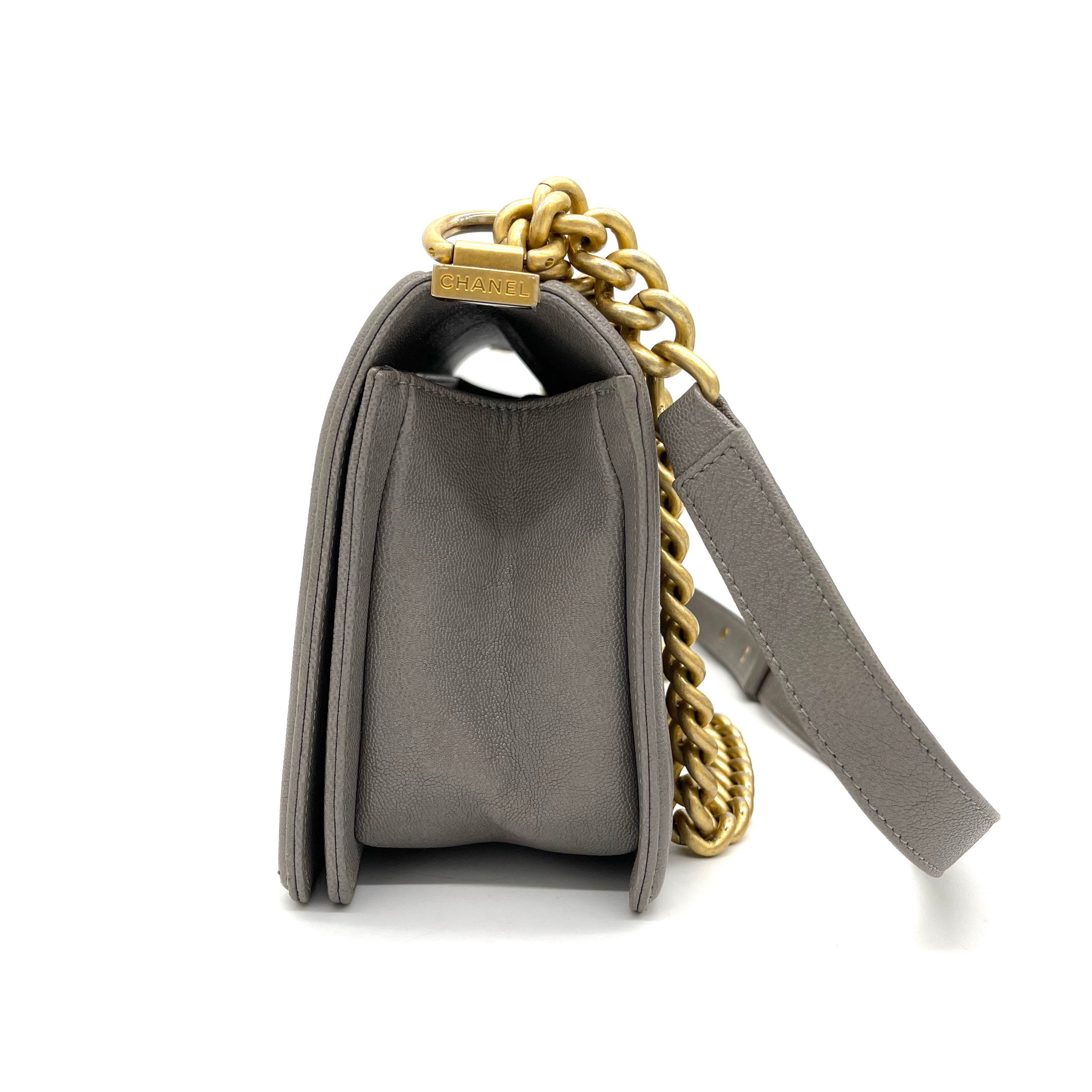 그레이 색상의 정품 샤넬 캐비어 퀼팅 미디엄 보이 플랩입니다. 고급스러운 질감의 다크 골드 다이아몬드 퀼팅 캐비어 가죽과 선형 퀼팅 가죽 테두리로 제작된 시크한 숄더백입니다. 이 가방은 어깨 패드가 있는 루테늄 체인 링크 어깨 스트랩과 전면 루테늄 보이 샤넬 CC 푸시 잠금 장치가 특징입니다. 앞면 플랩을 열면 골드 패브릭 내부에 플랫 포켓이 있습니다.