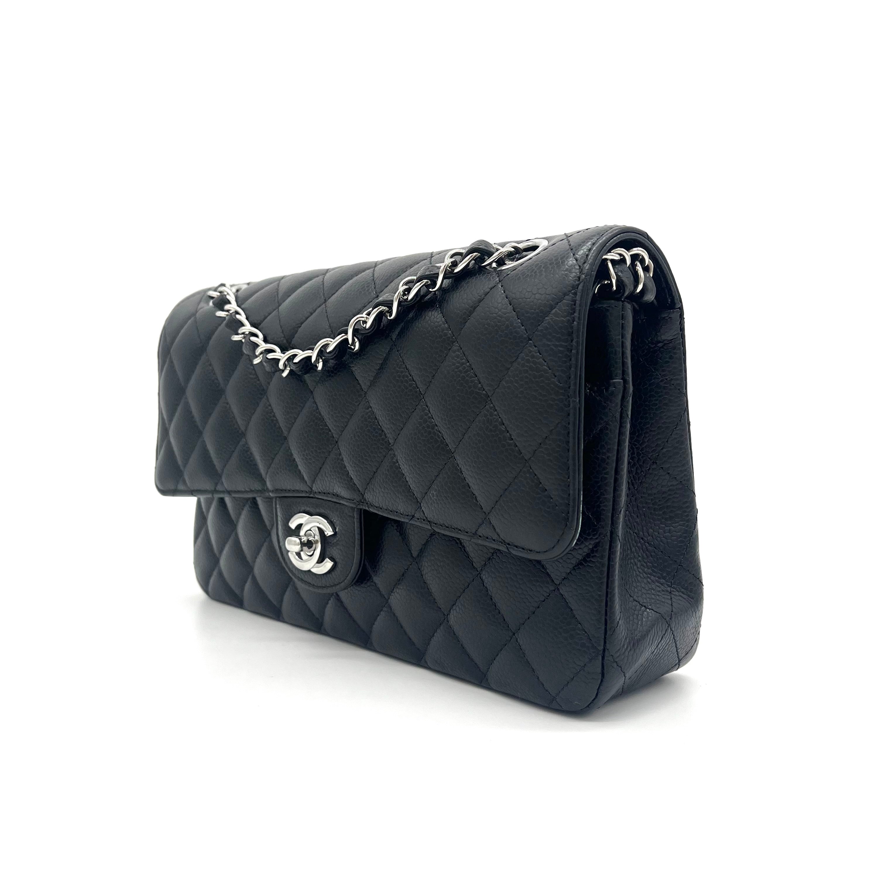 This is an authentic CHANEL Caviar Quilted medium Double Flap in Black. This elegant shoulder bag is crafted of luxurious caviar textured leather in black. The bag features a leather-threaded silver chain-link shoulder strap, a rear patch pocket, and a crossover flap with a silver classic CC turn lock. The flap opens to reveal an inner flap and a burgundy leather interior with pockets.
