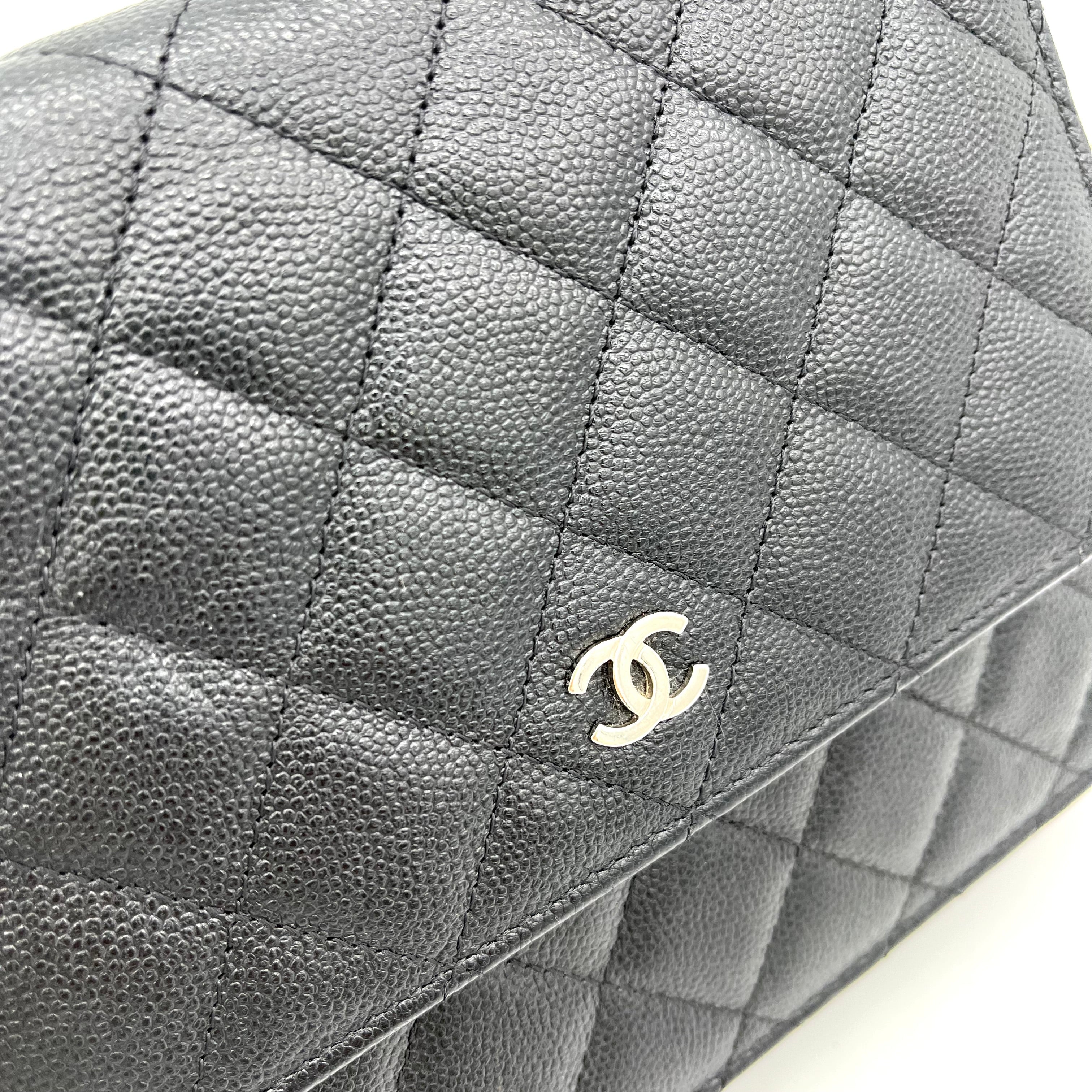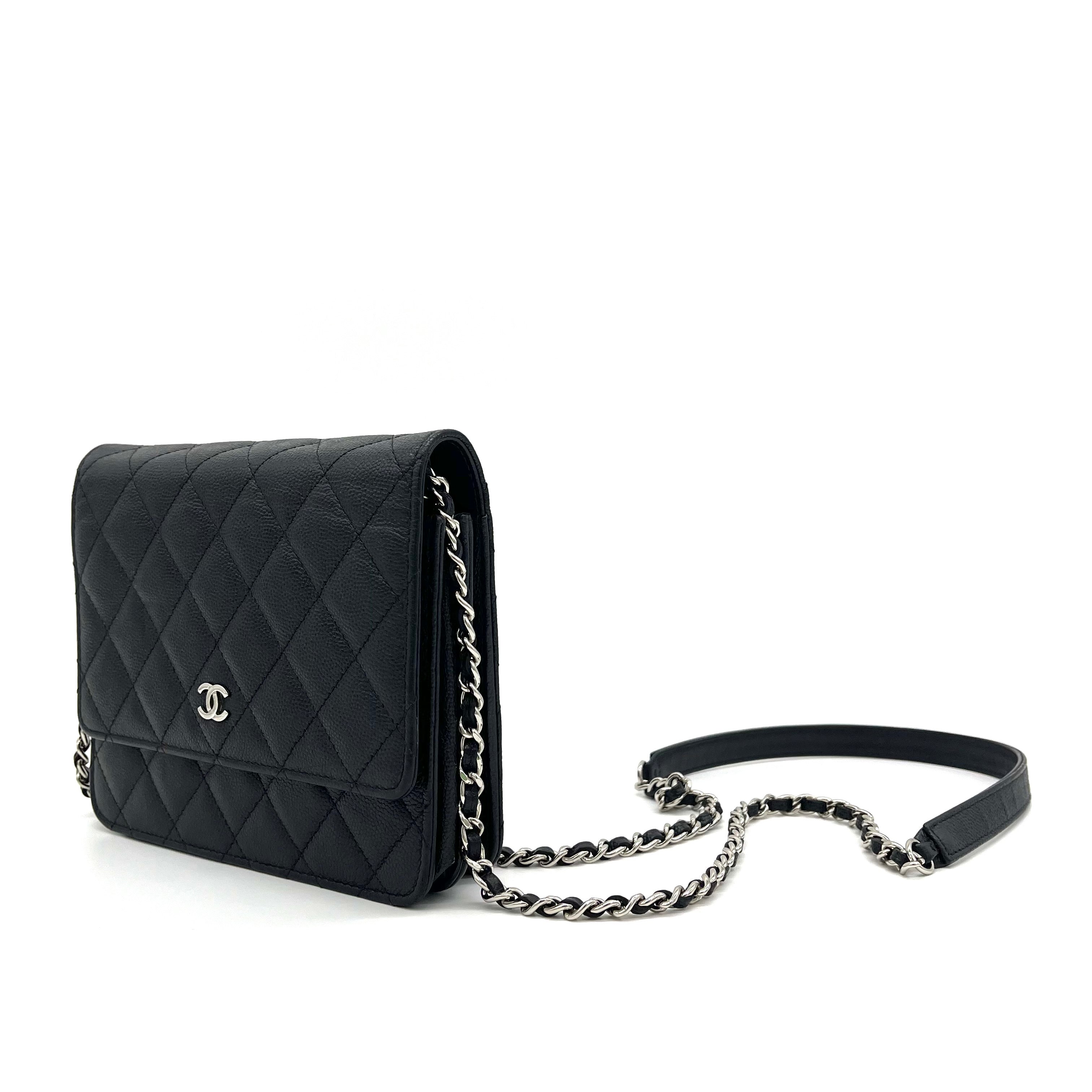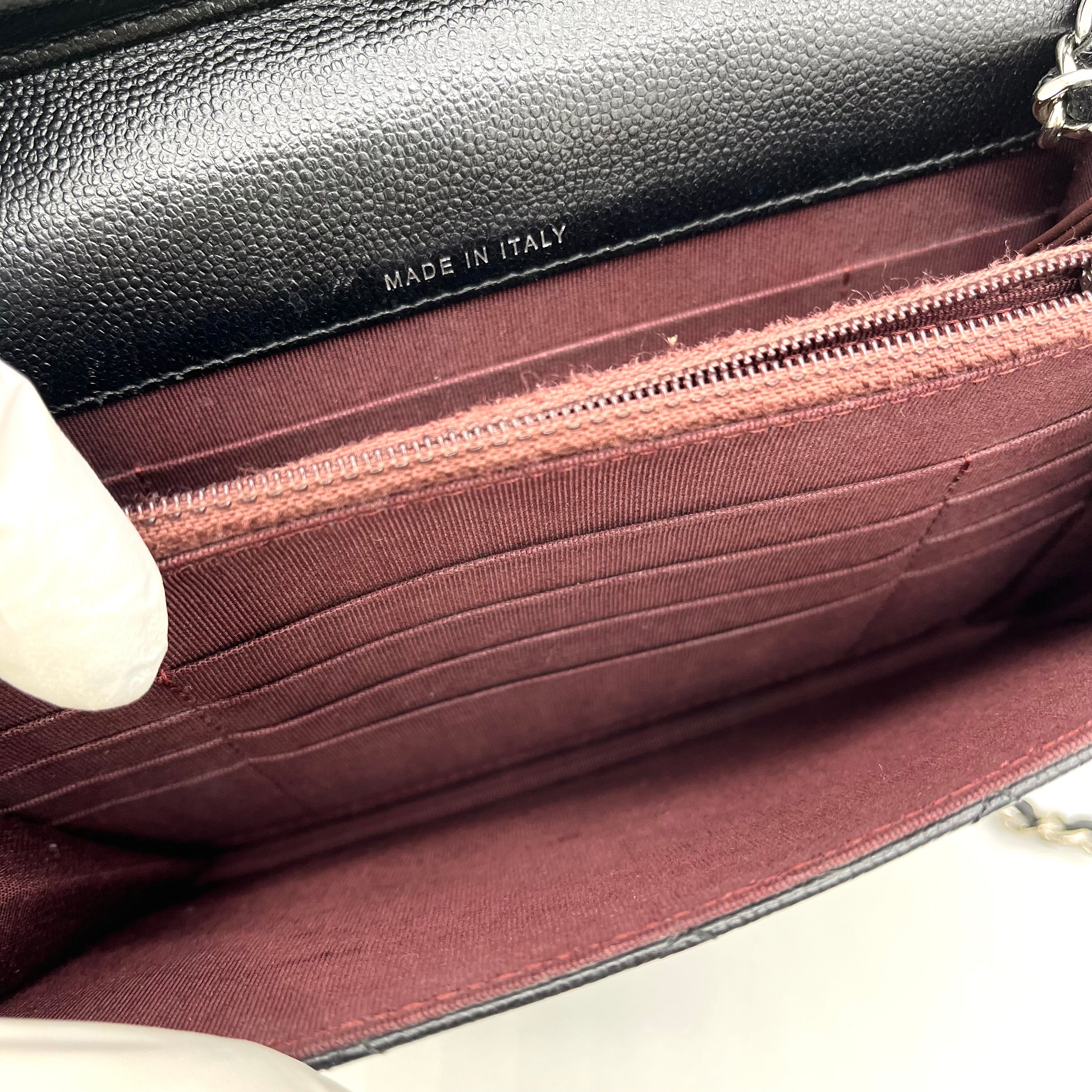 This is an authentic CHANEL Caviar Quilted Square Wallet On Chain WOC in Black. This chain wallet is beautifully crafted of diamond-quilted caviar leather in black. The bag features a leather-threaded polished light gold chain-link shoulder strap and a crossover flap with a matching Chanel CC logo. The flap opens to a partitioned burgundy fabric interior with card slots, a zipper, and a pocket.