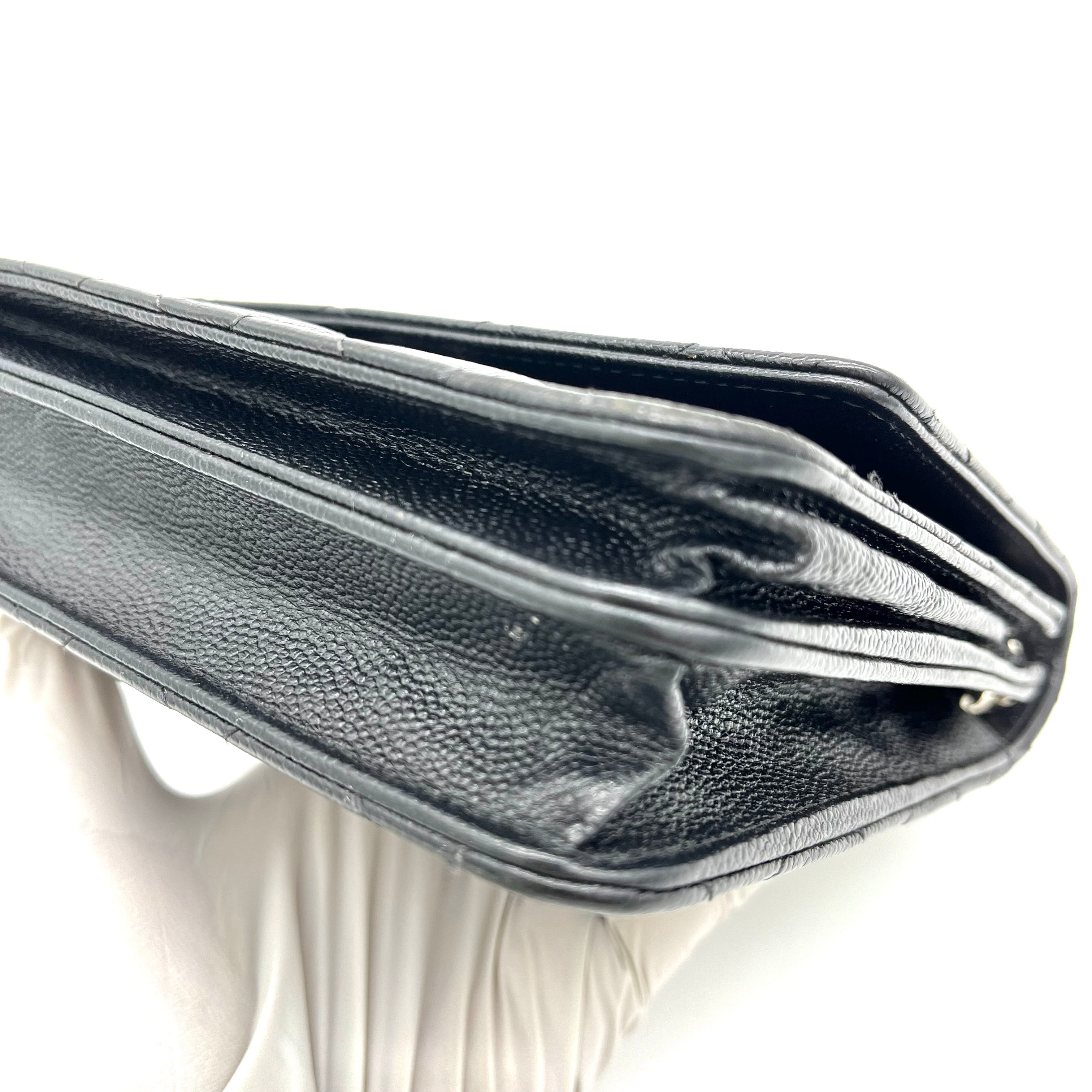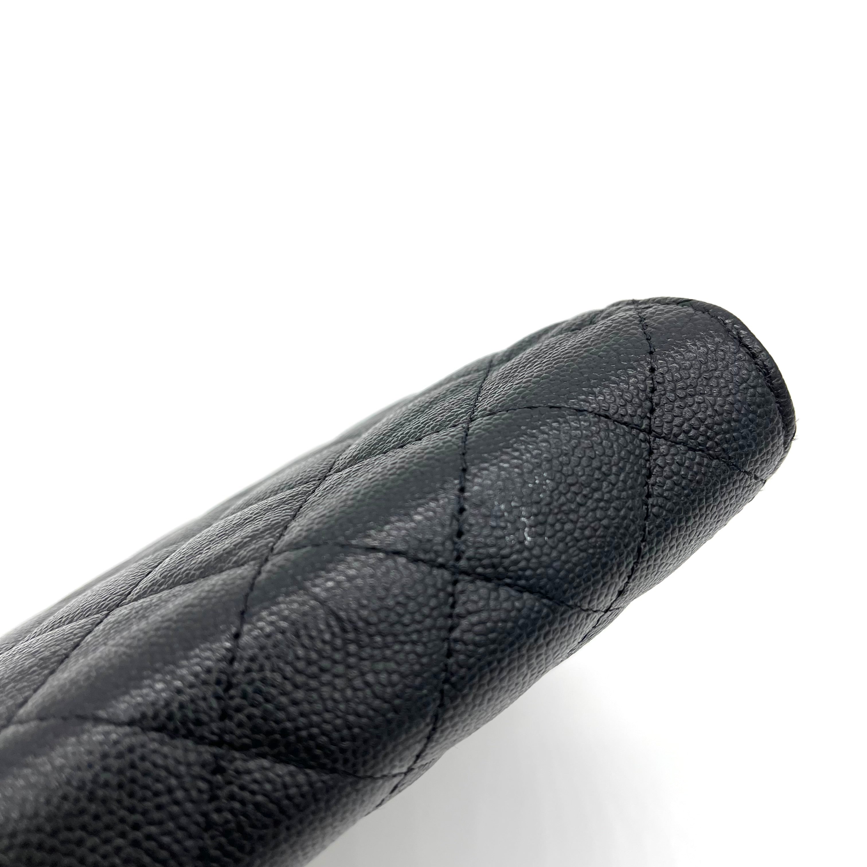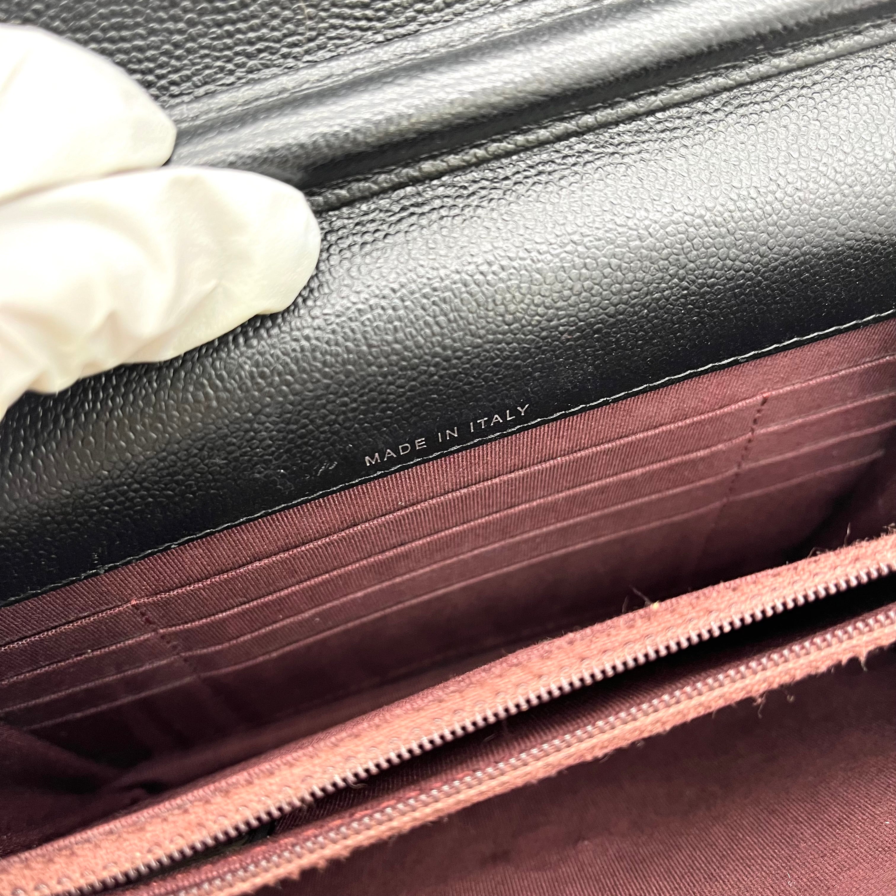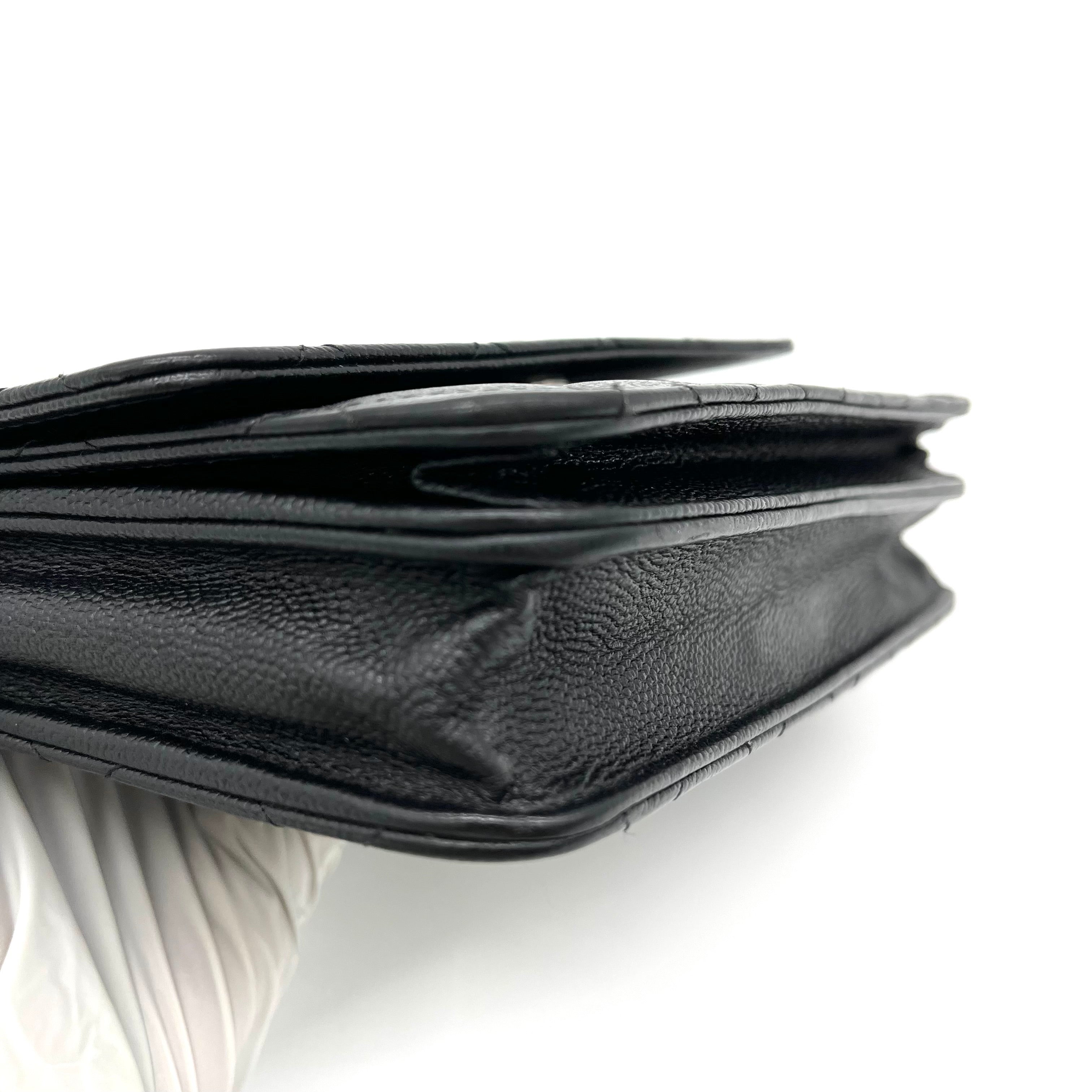 This is an authentic CHANEL Caviar Quilted Square Wallet On Chain WOC in Black. This chain wallet is beautifully crafted of diamond-quilted caviar leather in black. The bag features a leather-threaded polished light gold chain-link shoulder strap and a crossover flap with a matching Chanel CC logo. The flap opens to a partitioned burgundy fabric interior with card slots, a zipper, and a pocket.