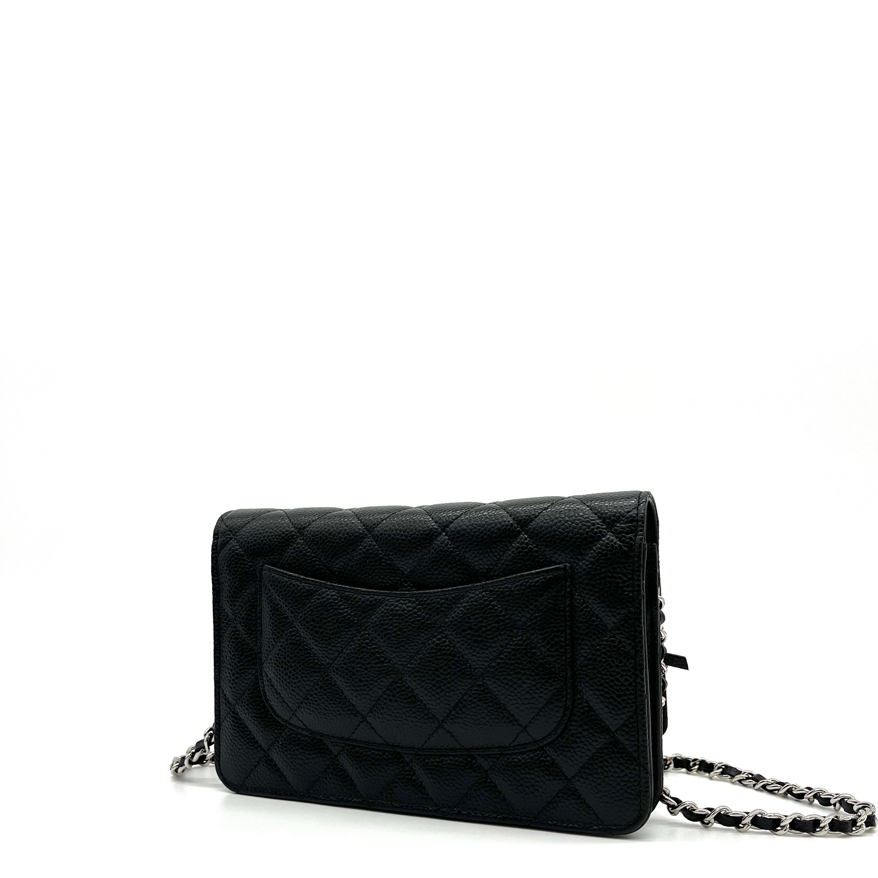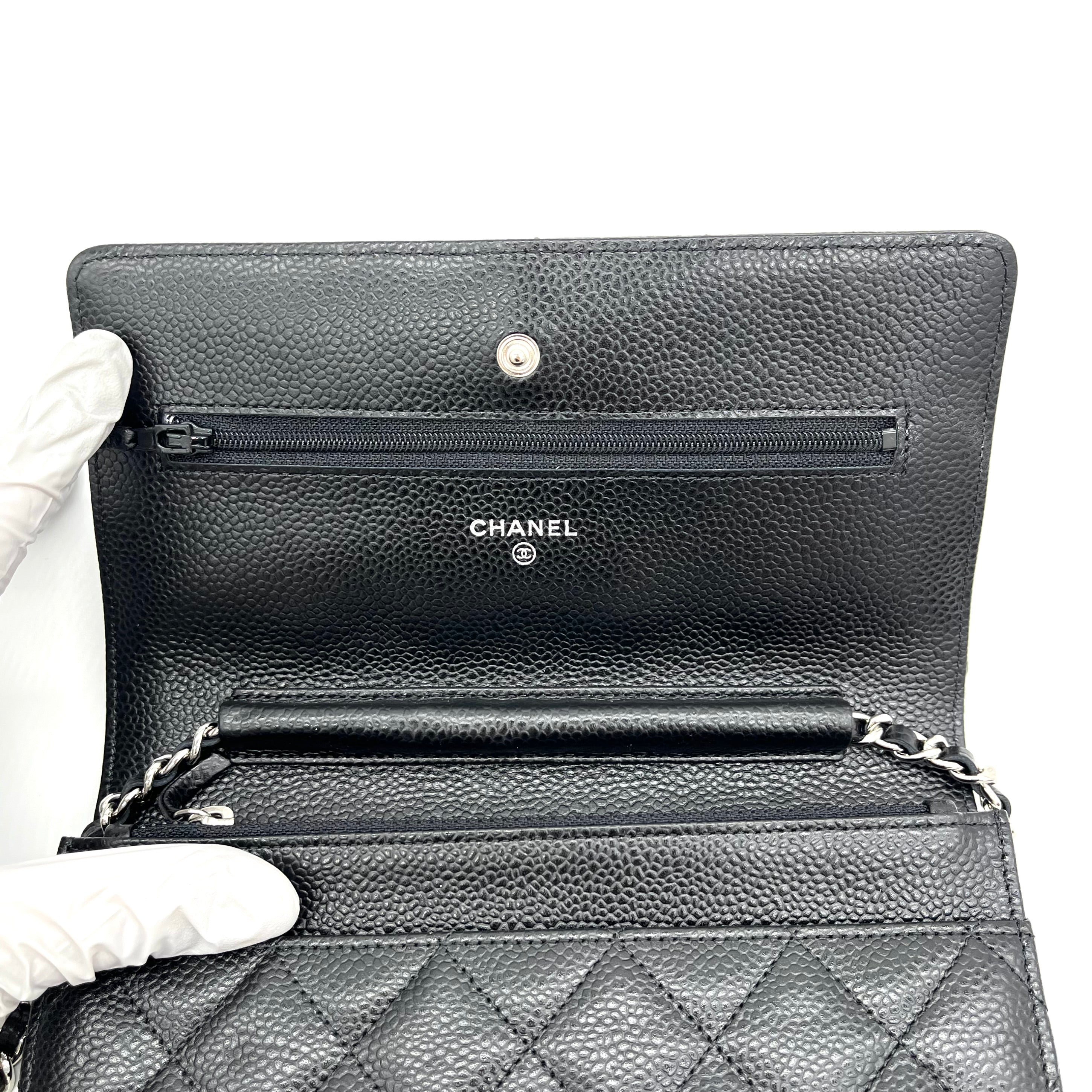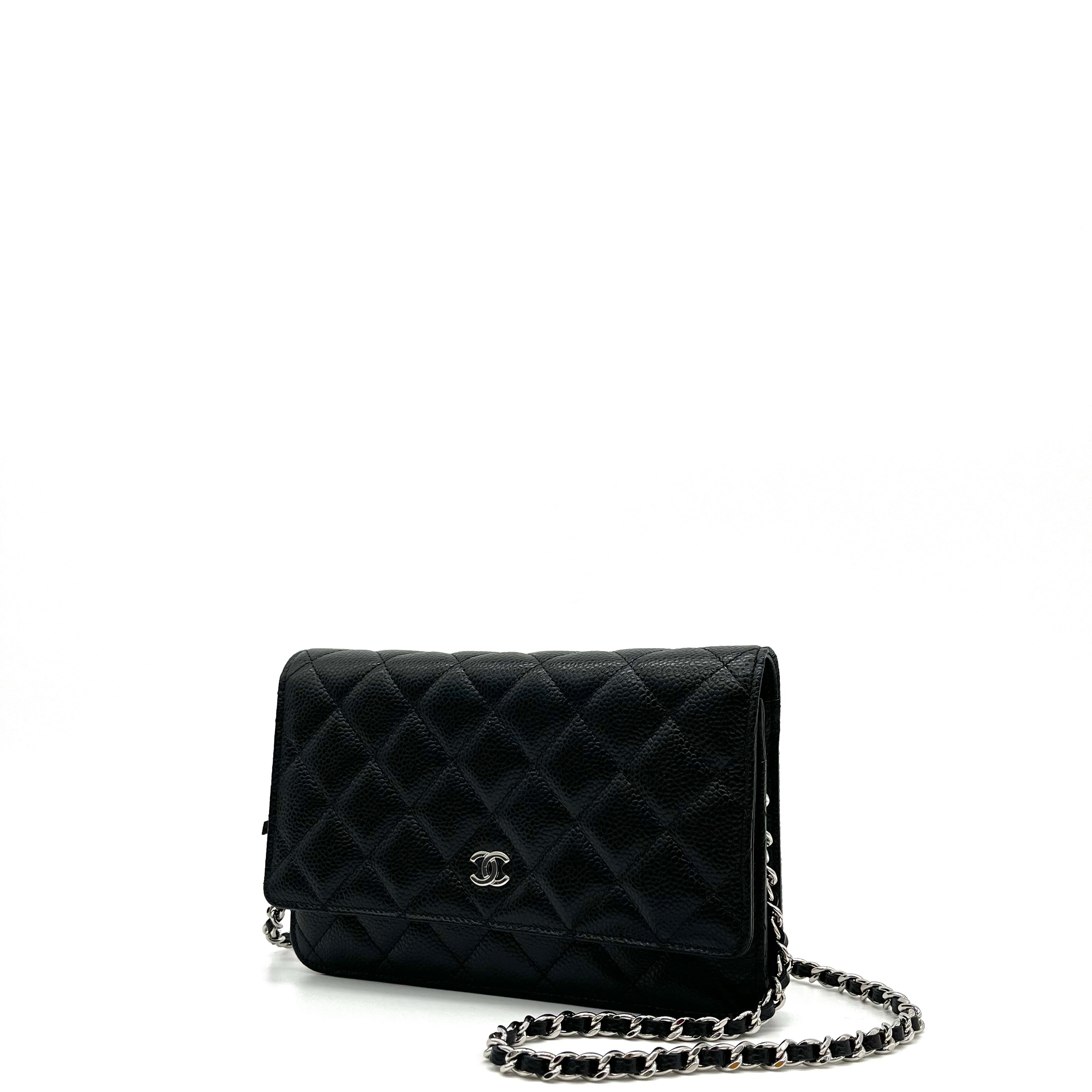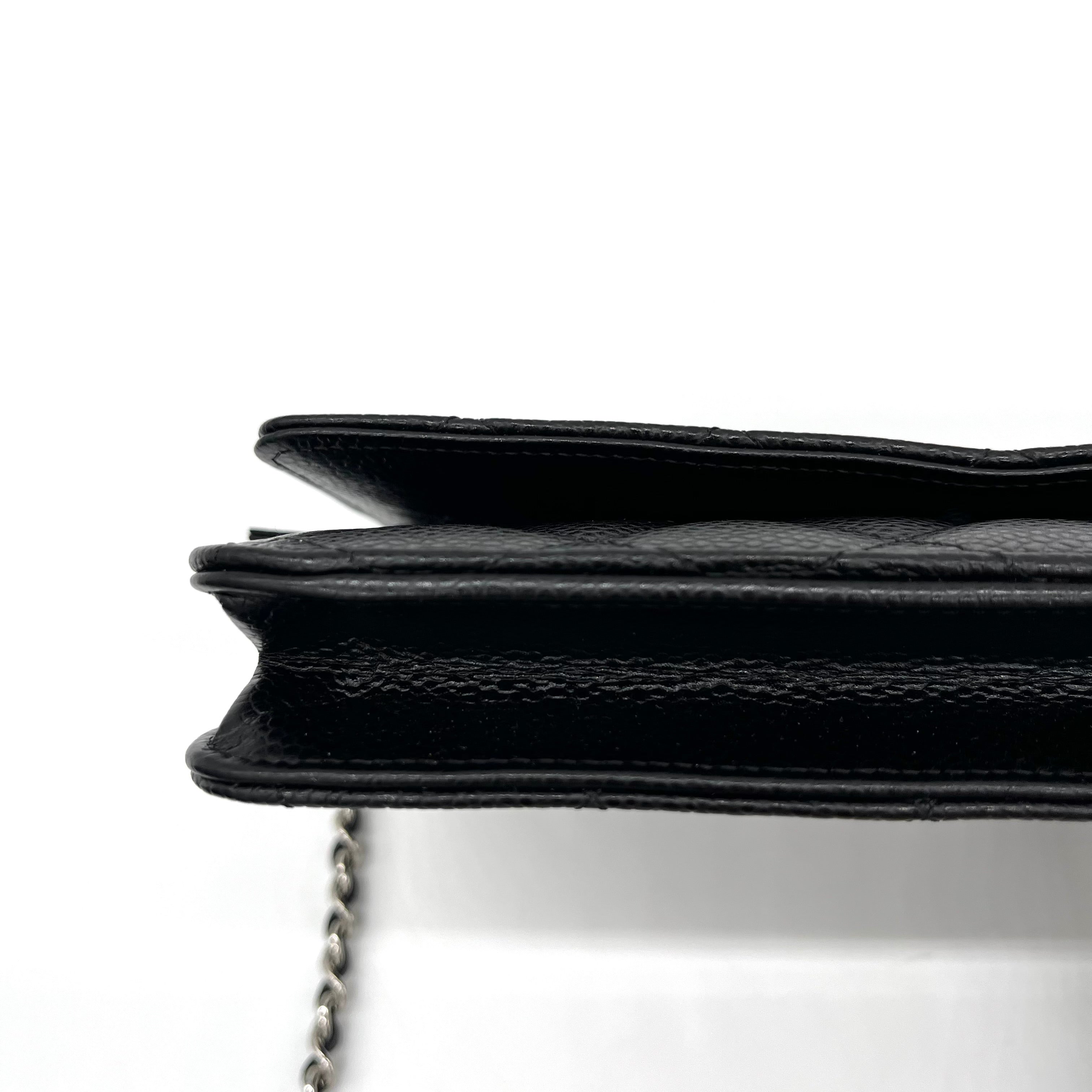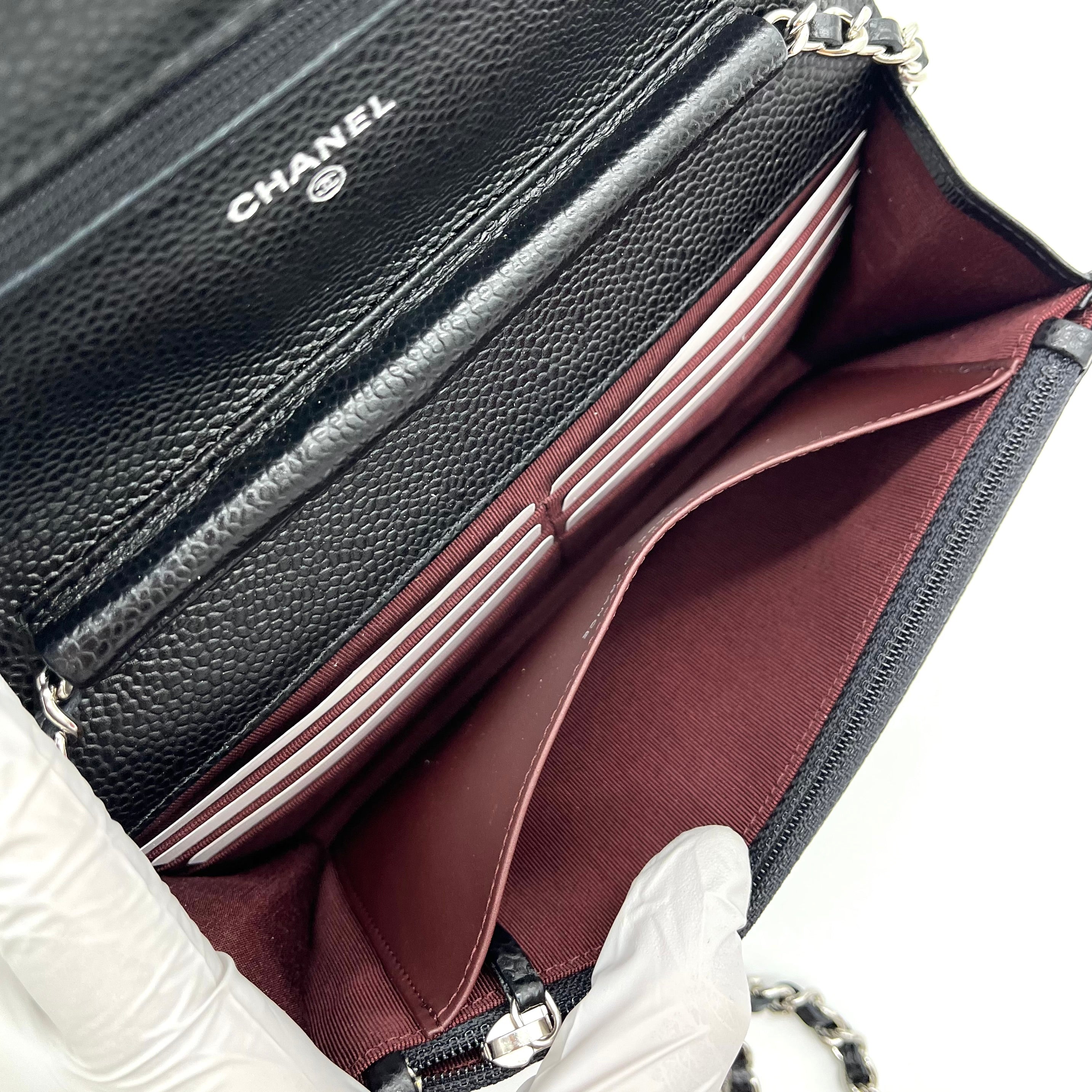 This is an authentic CHANEL Caviar Quilted Wallet on Chain WOC in Black. This stylish wallet is crafted of luxuriously textured diamond quilted caviar leather in black. This shoulder bag features a polished silver chain-link crossbody strap and a Chanel CC logo on the facing flap. The bag opens to a burgundy fabric interior with a zipper compartment, card slots, and a leather patch pocket.