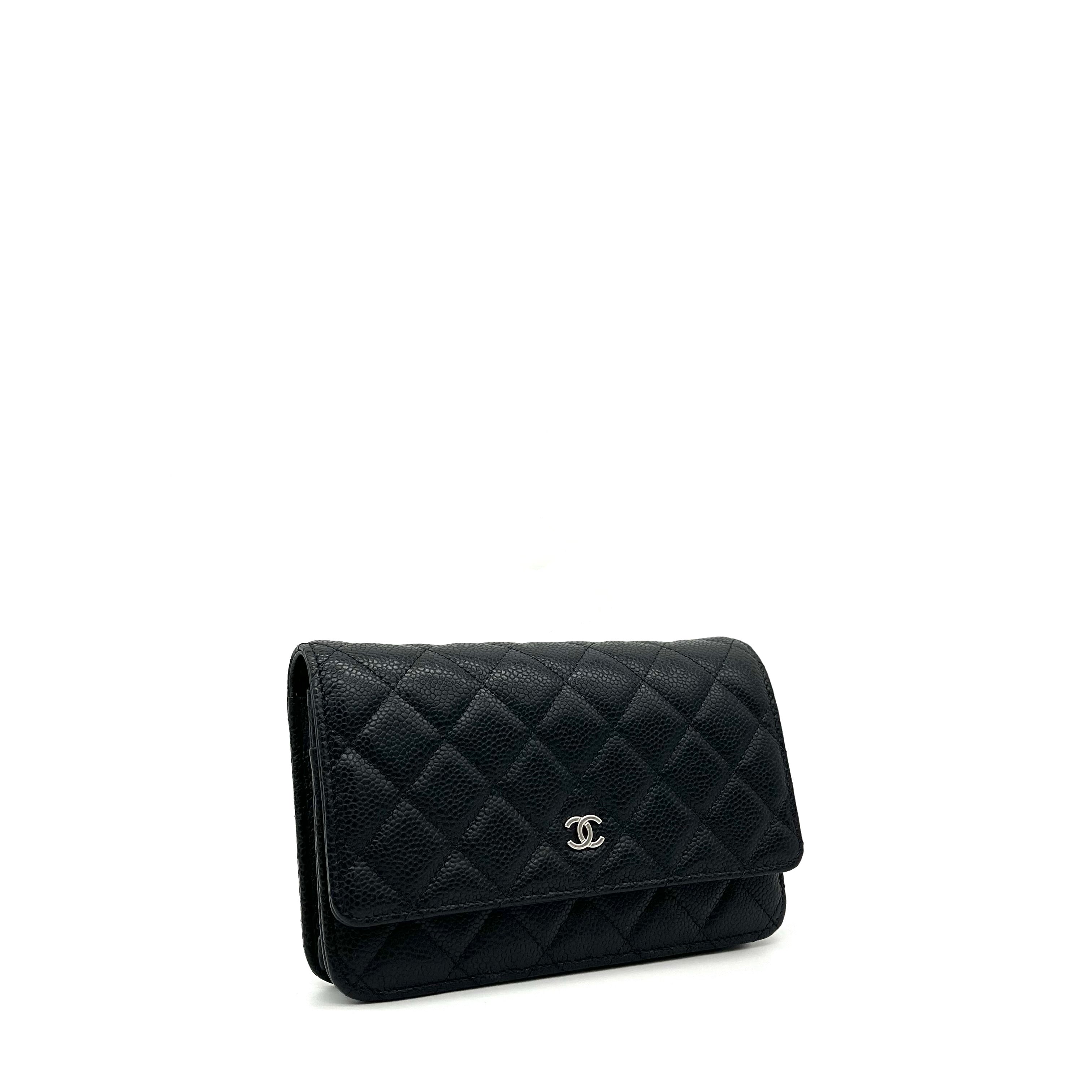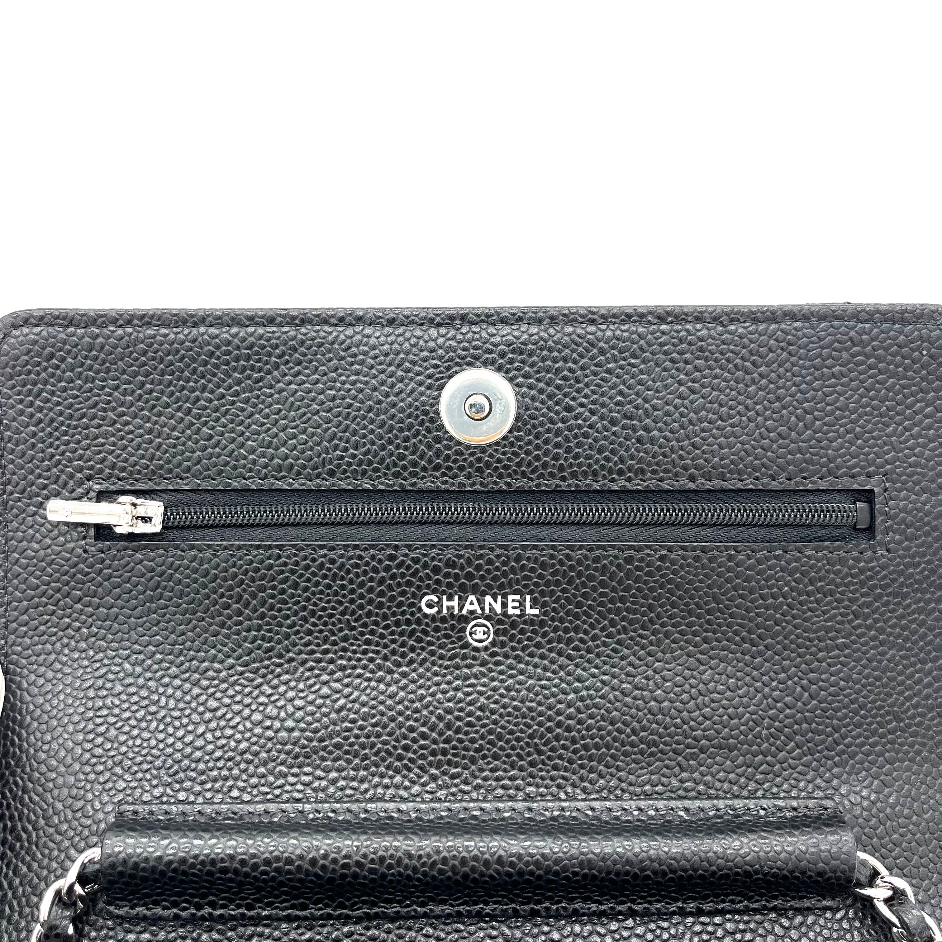 This is an authentic CHANEL Caviar Quilted Wallet on Chain WOC in Black. This stylish wallet is crafted of luxuriously textured diamond quilted caviar leather in black. This shoulder bag features a polished silver chain-link crossbody strap and a Chanel CC logo on the facing flap. The bag opens to a burgundy fabric interior with a zipper compartment, card slots, and a leather patch pocket.