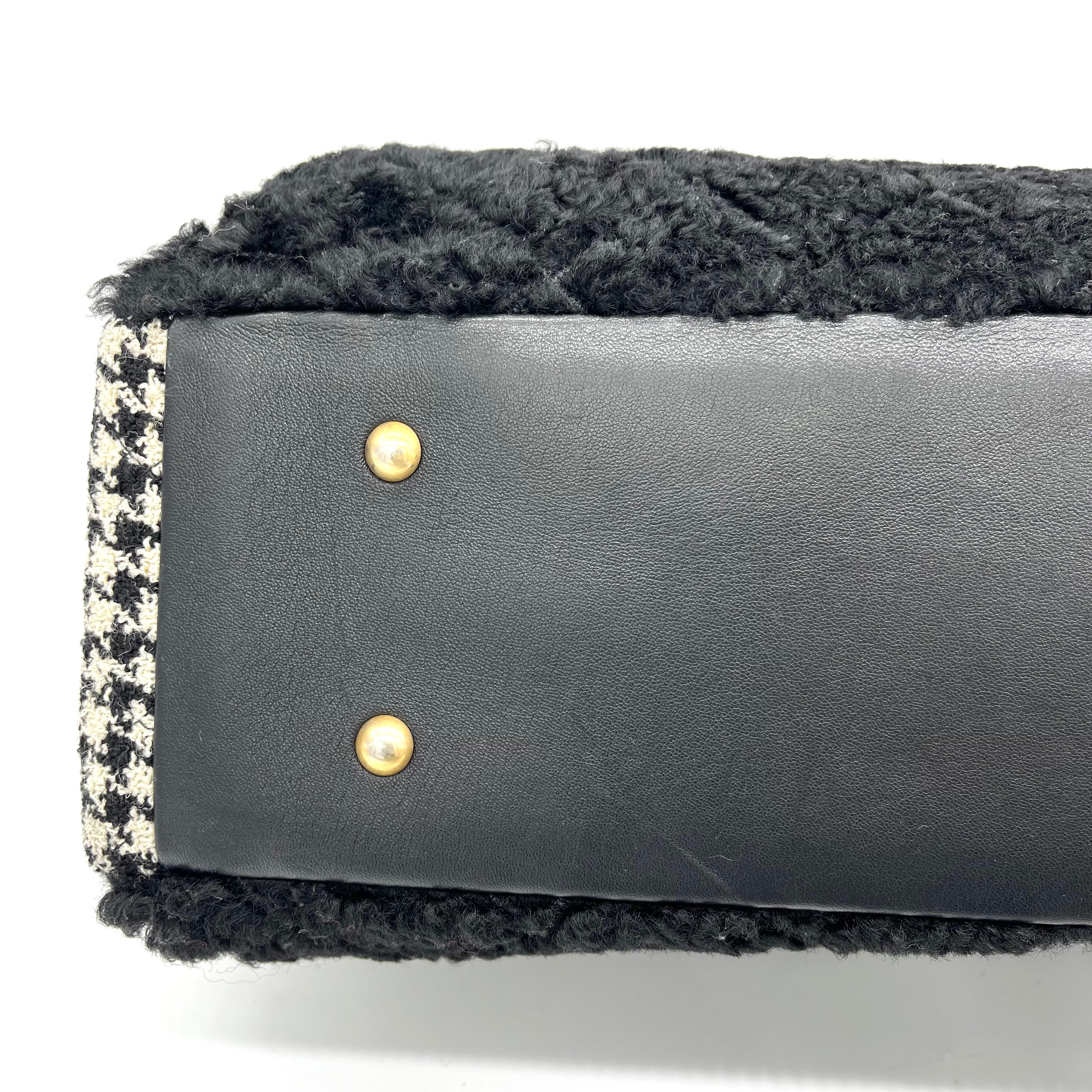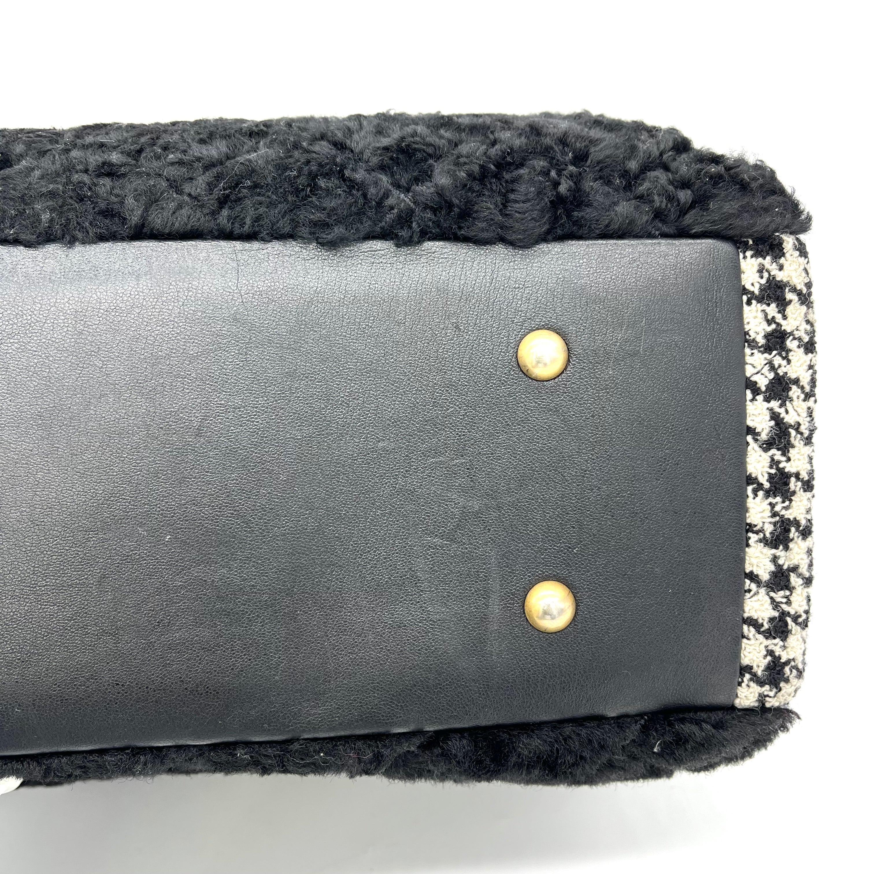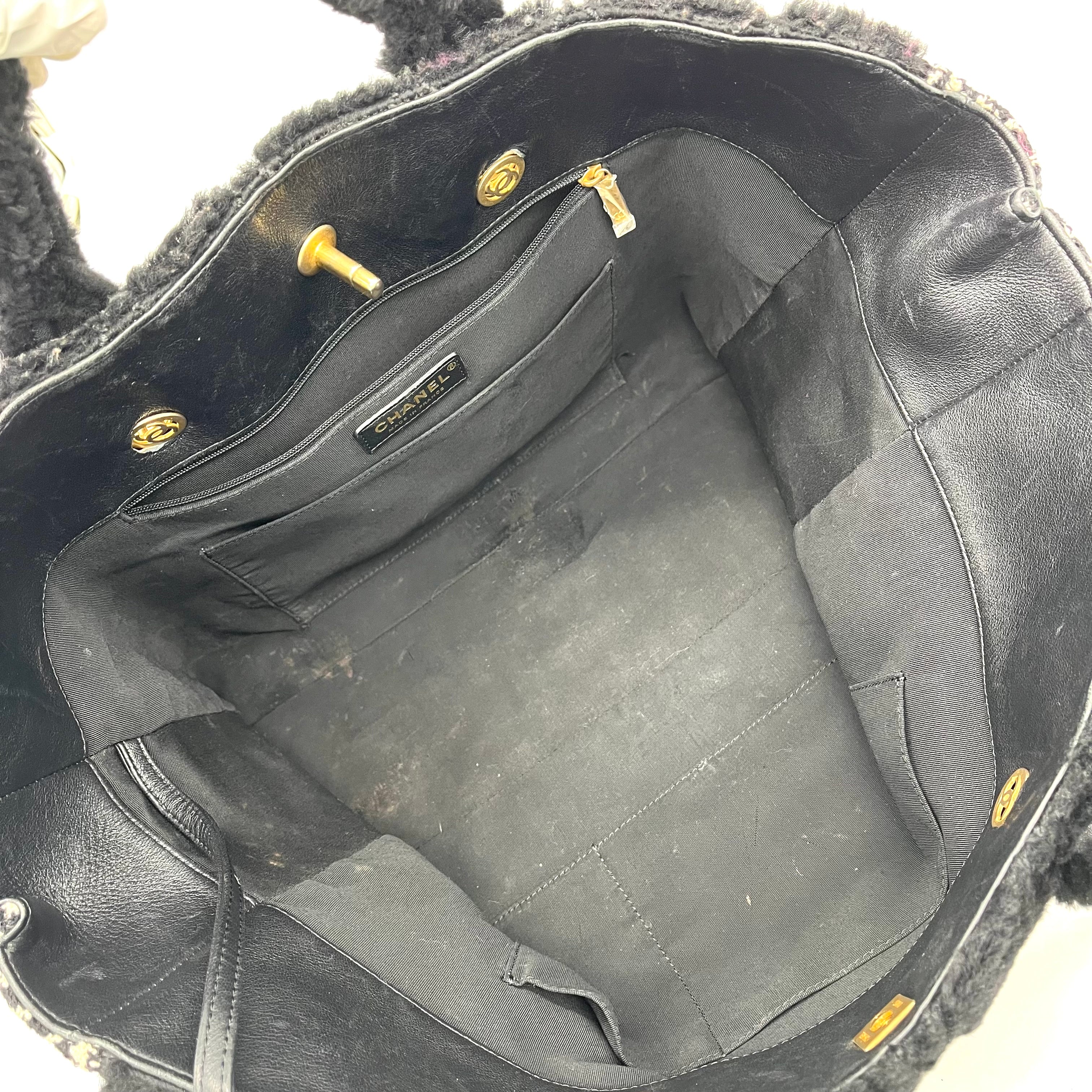 This is an authentic CHANEL CC Chain Shopping Tote Quilted Shearling with Tweed Large. This Tweed bag is finely crafted of Shearling and Tweed Exterior. The bag features an twisted with gold hardware and black leather strap and the handle is made with Shearling material. The tote bag opens with Chanel's signature logo hook.