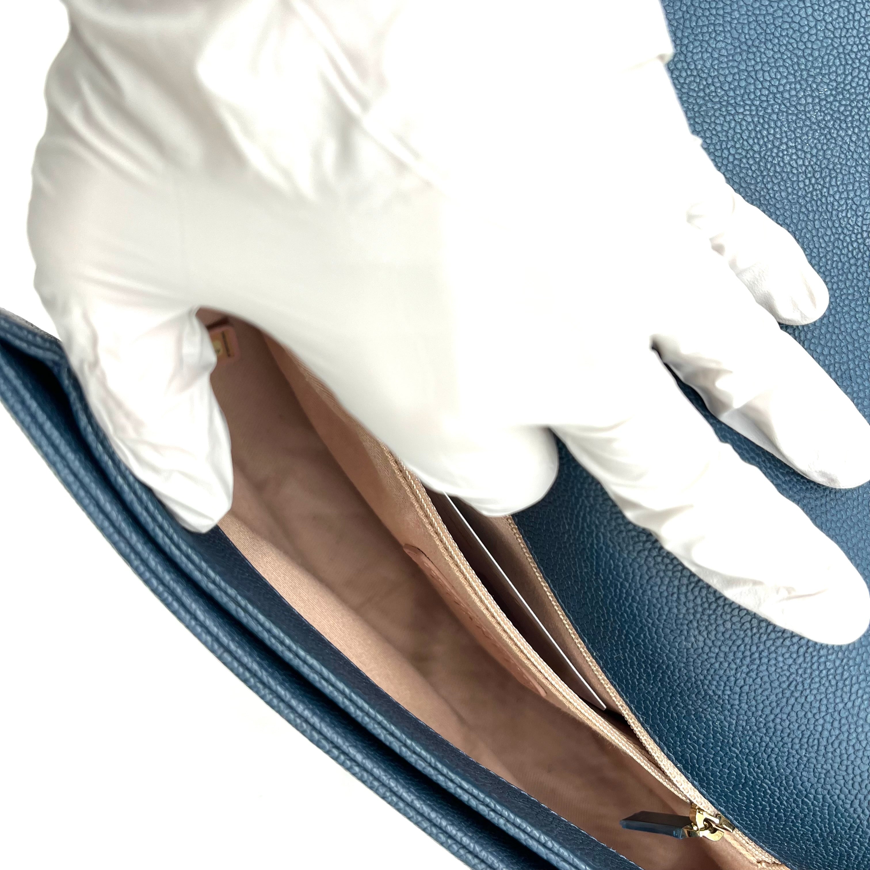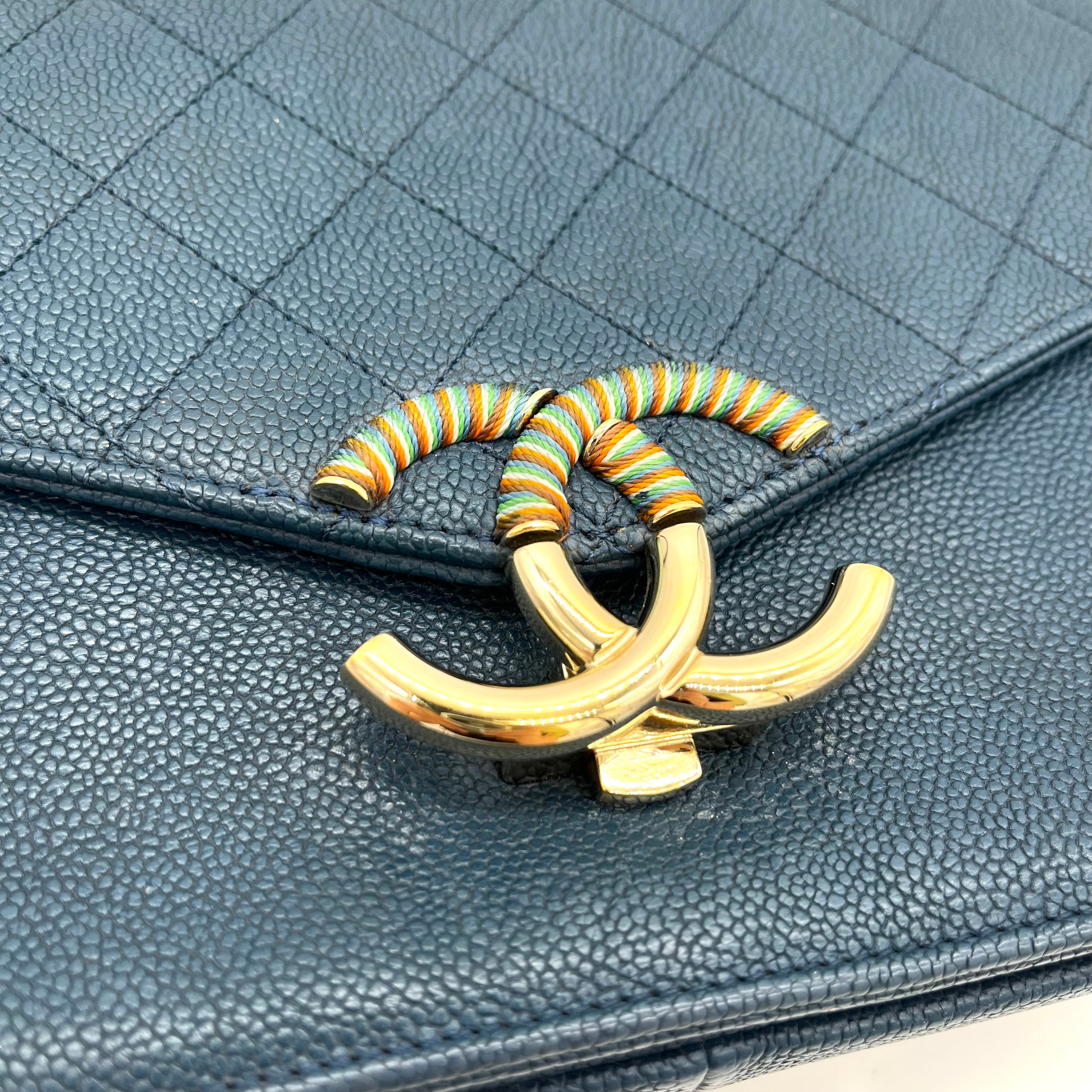 This is an authentic CHANEL Grained Calfskin Quilted Medium Cuba Top Handle Flap in Blue. This chic shoulder bag is crafted of pebbled and quilted leather in blue. This features a matching leather top handle and light gold chain link shoulder strap, exterior patch pocket, and envelope style front flap with a prominent Chanel interlocking CC closure. This opens to a pink fabric interior with zipper and patch pockets.