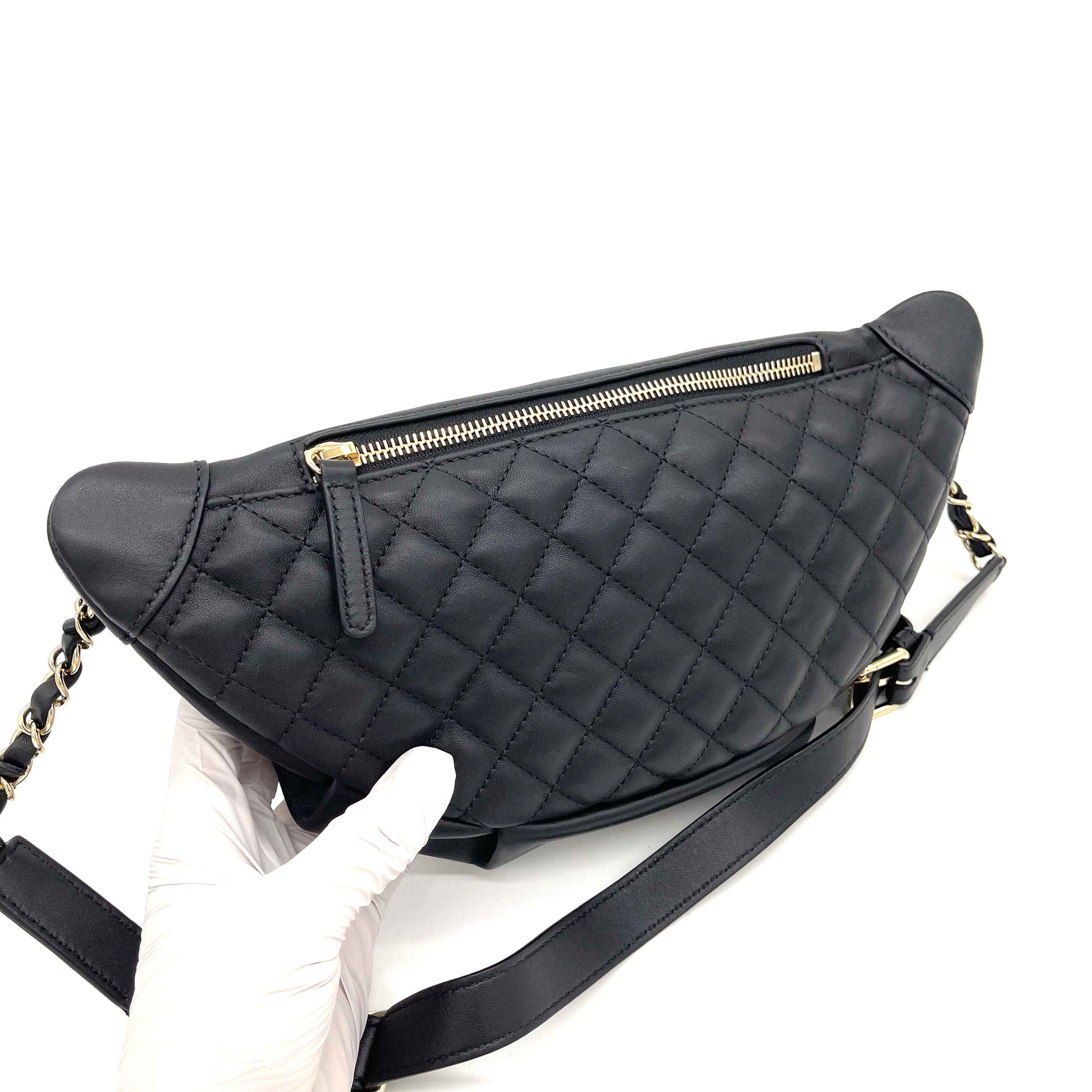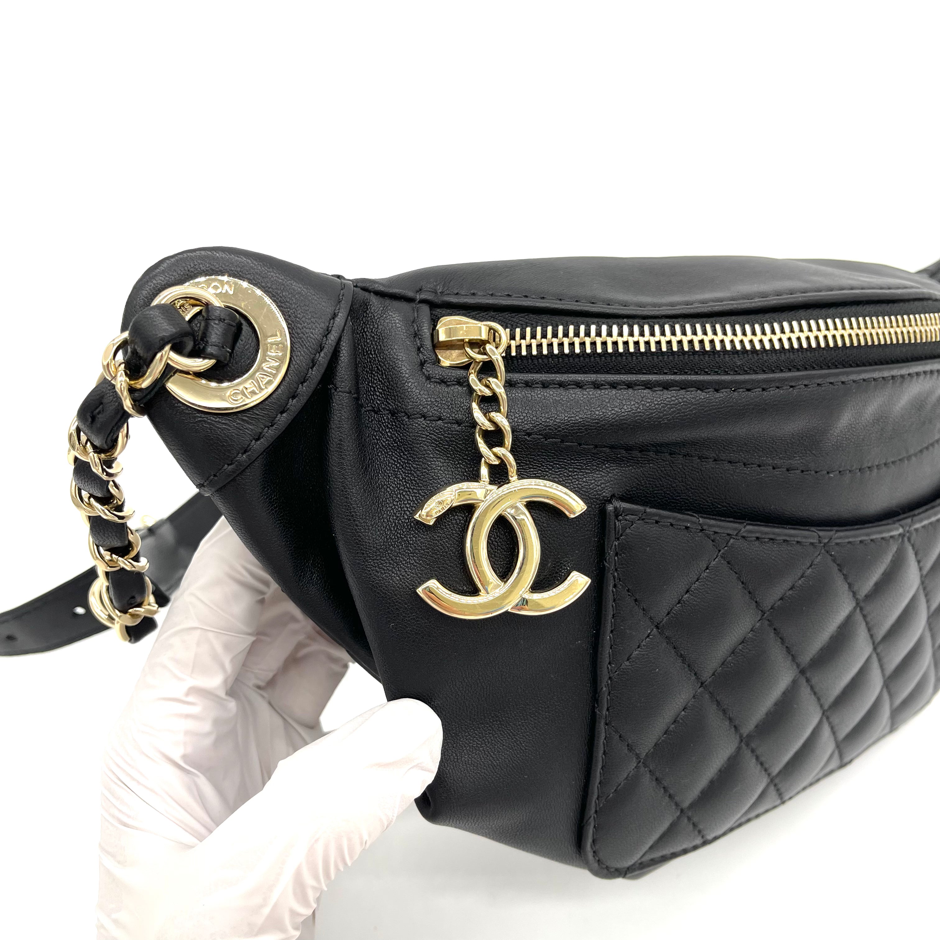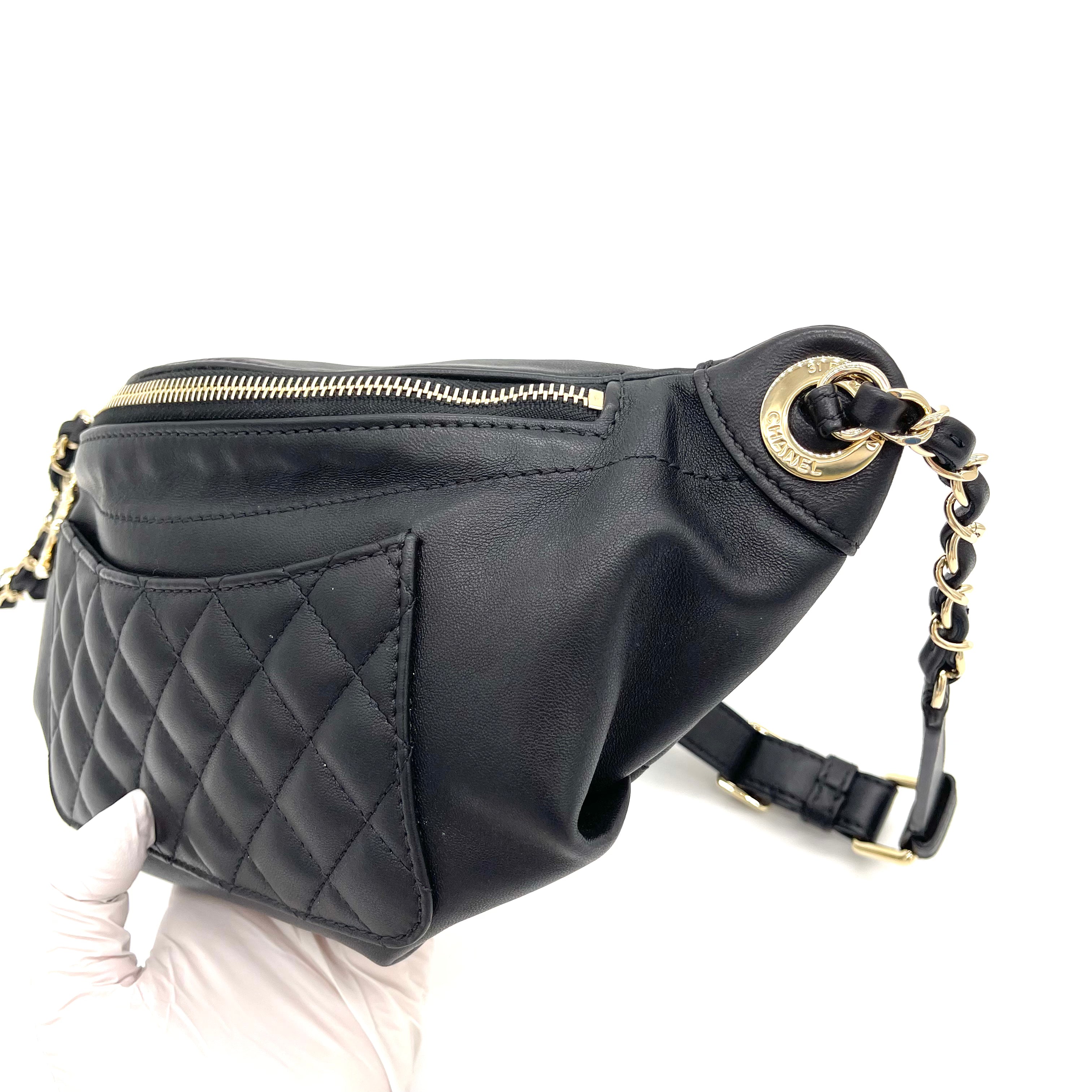 정품 샤넬 램스킨 바이 퀼팅 웨이스트 백 패니 팩(블랙)입니다. 다이아몬드 퀼팅 처리된 글로시 블랙 양가죽으로 정교하게 제작된 스타일리시한 웨이스트 백입니다. 이 가방에는 라이트 골드 체인 링크와 조절 링크가 있는 가죽 허리 스트랩, 샤넬 CC 지퍼 손잡이가 달린 상단 지퍼 포켓이 있습니다. 그러면 검정색 패브릭 내부가 열립니다.