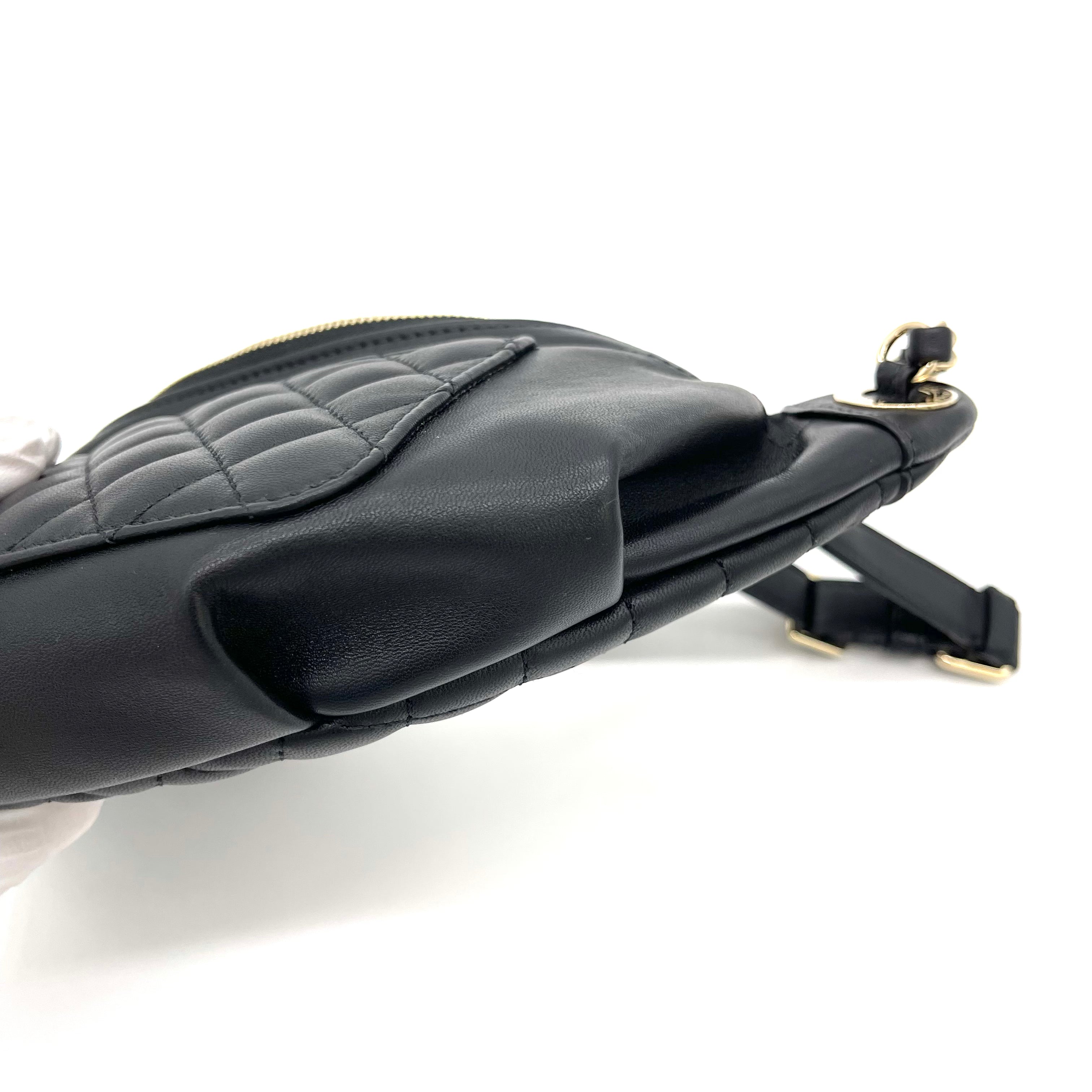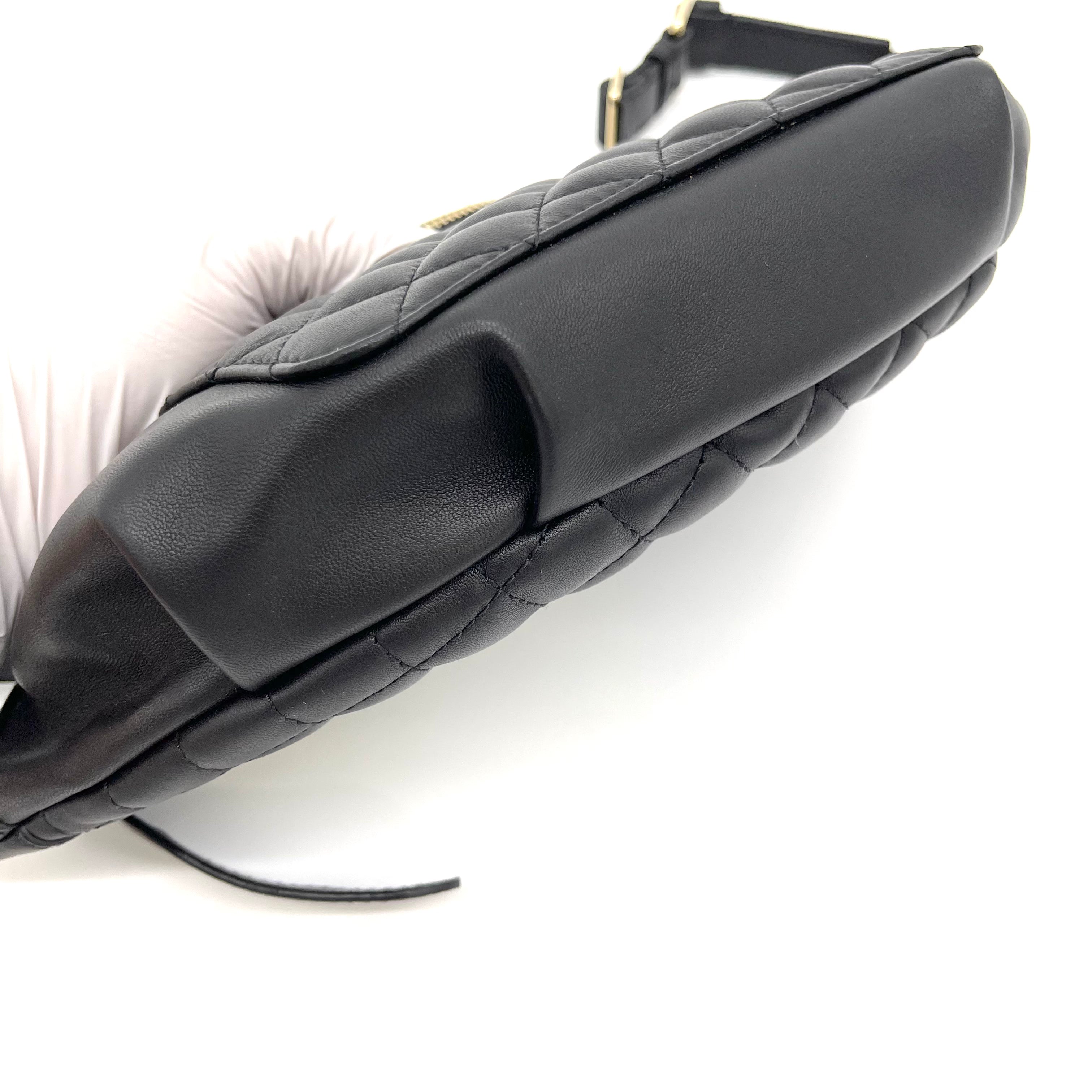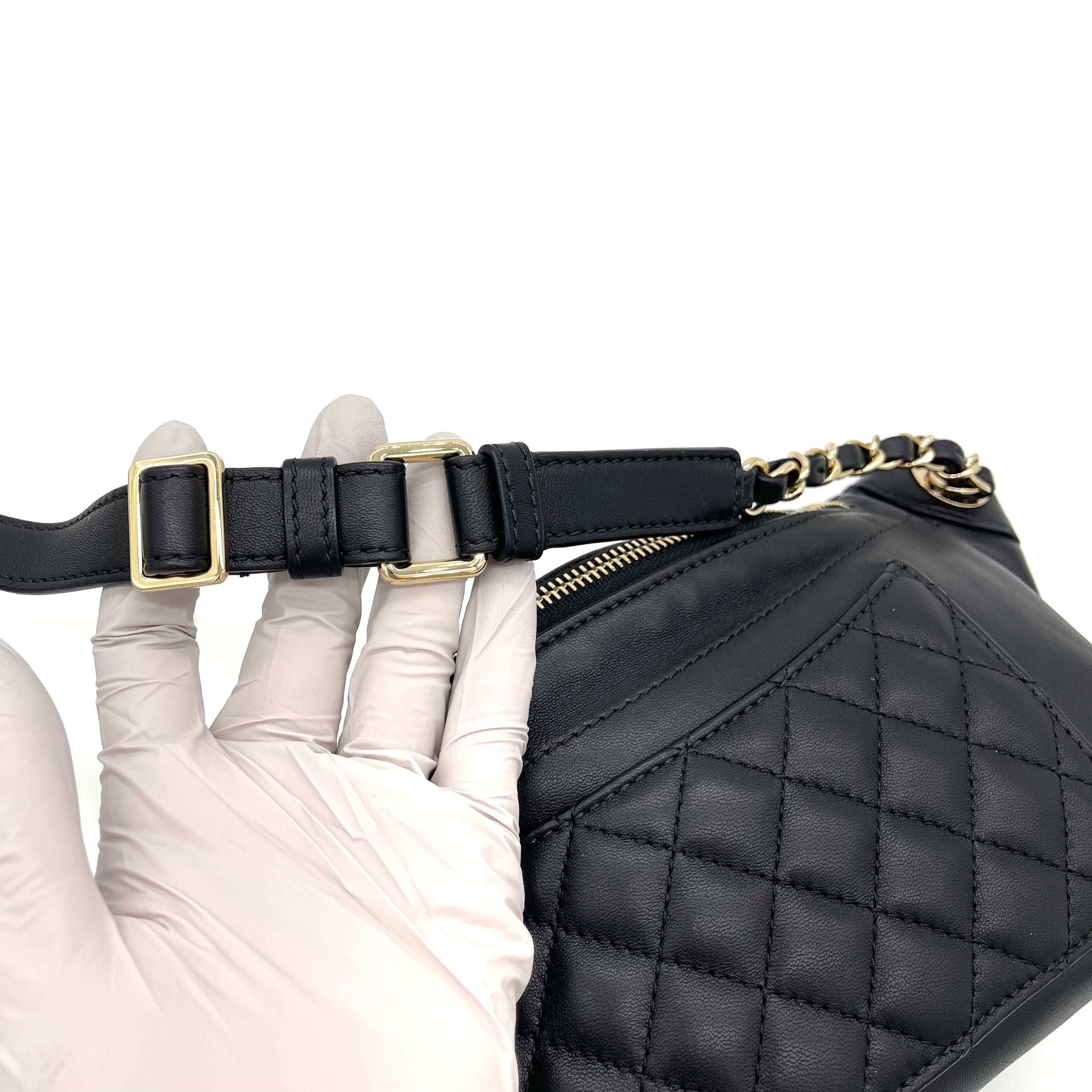 정품 샤넬 램스킨 바이 퀼팅 웨이스트 백 패니 팩(블랙)입니다. 다이아몬드 퀼팅 처리된 글로시 블랙 양가죽으로 정교하게 제작된 스타일리시한 웨이스트 백입니다. 이 가방에는 라이트 골드 체인 링크와 조절 링크가 있는 가죽 허리 스트랩, 샤넬 CC 지퍼 손잡이가 달린 상단 지퍼 포켓이 있습니다. 그러면 검정색 패브릭 내부가 열립니다.