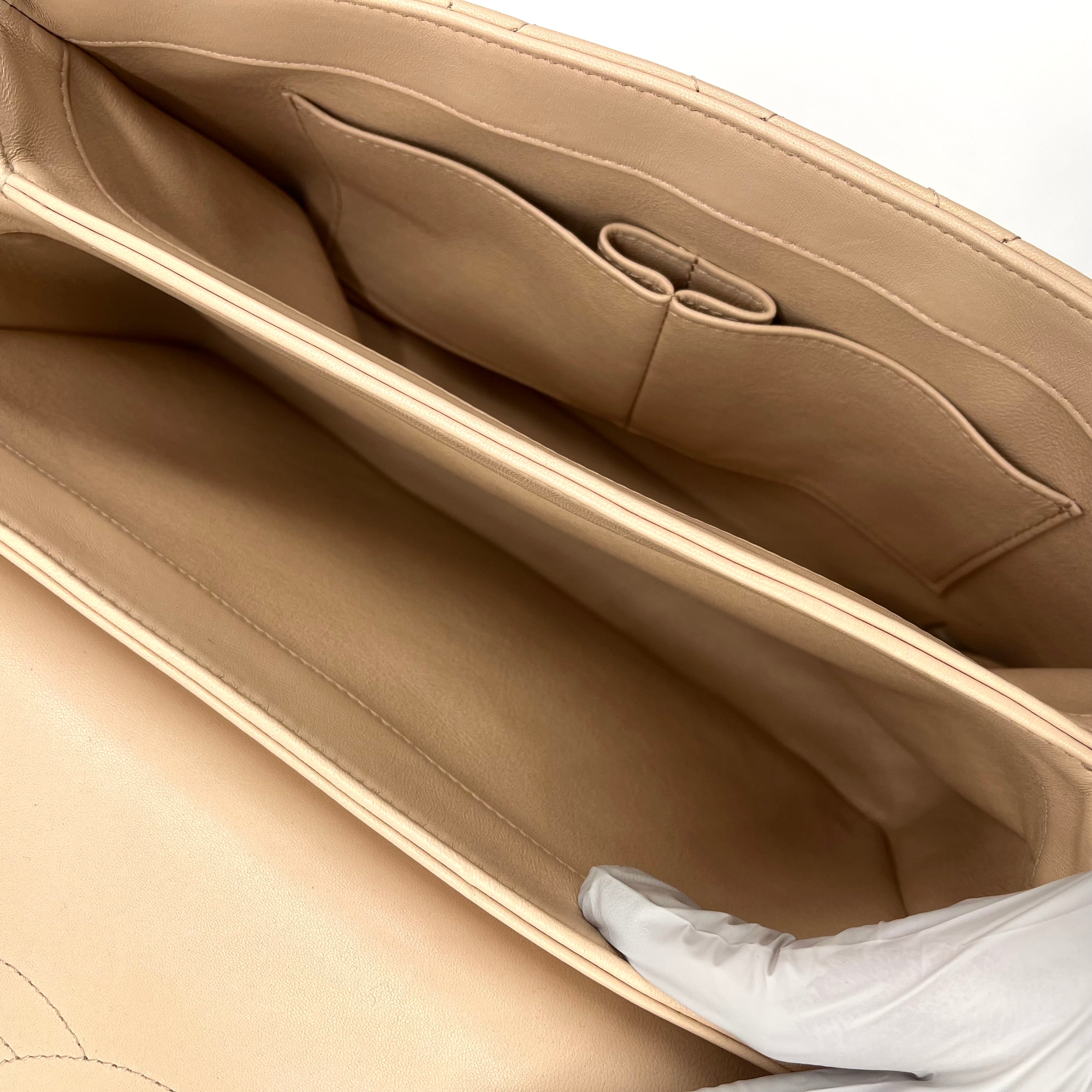 This is an authentic CHANEL Lambskin Quilted Large Trendy CC Flap in Light Beige. This stylish handbag is crafted of diamond quilted lambskin leather in light beige. The refined bag features a gold chain leather threaded shoulder strap with a leather shoulder pad, a gold bar with Chanel logo pad, and a gold Chanel CC logo on the front flap. This opens to a partitioned burgundy leather interior with zipper and patch pockets.