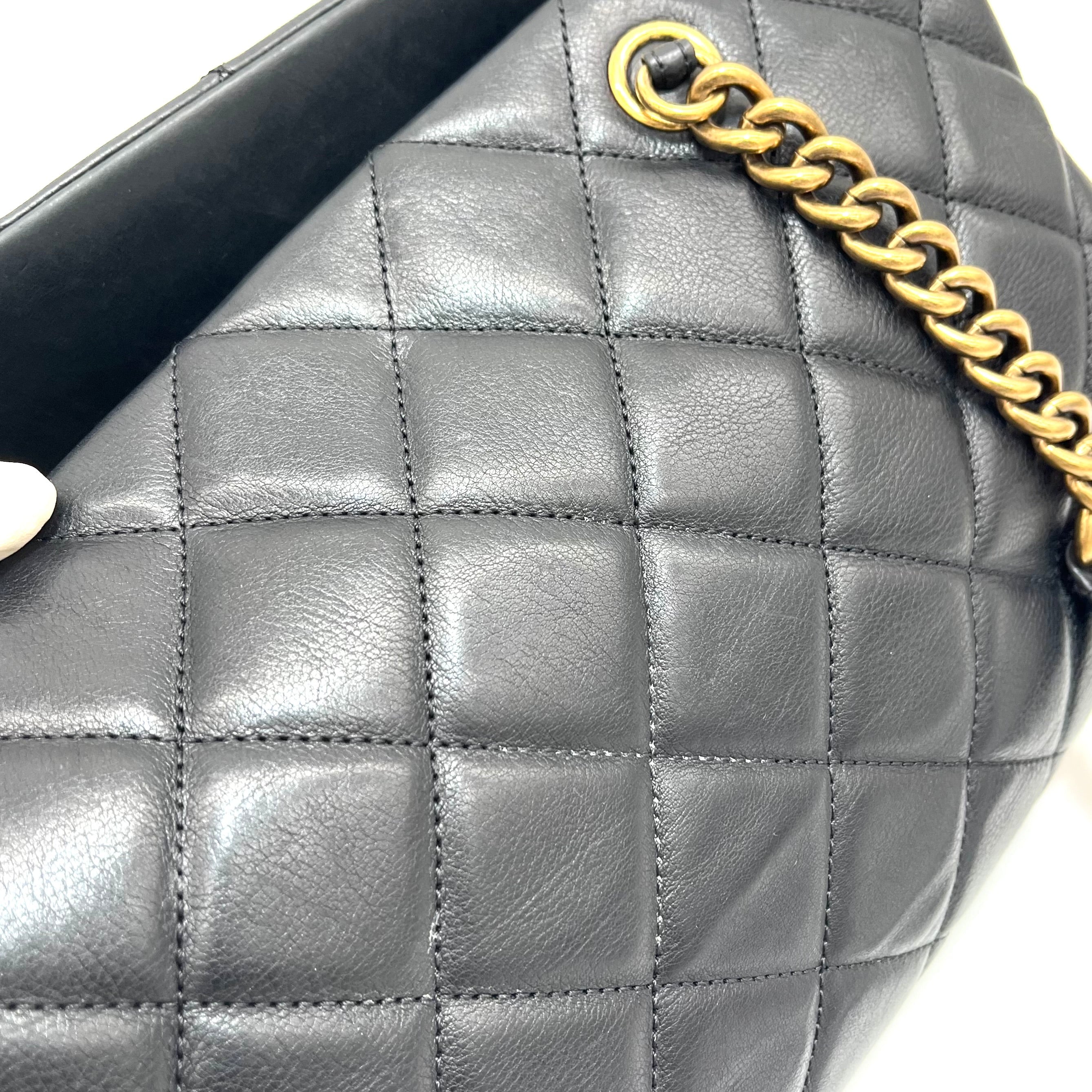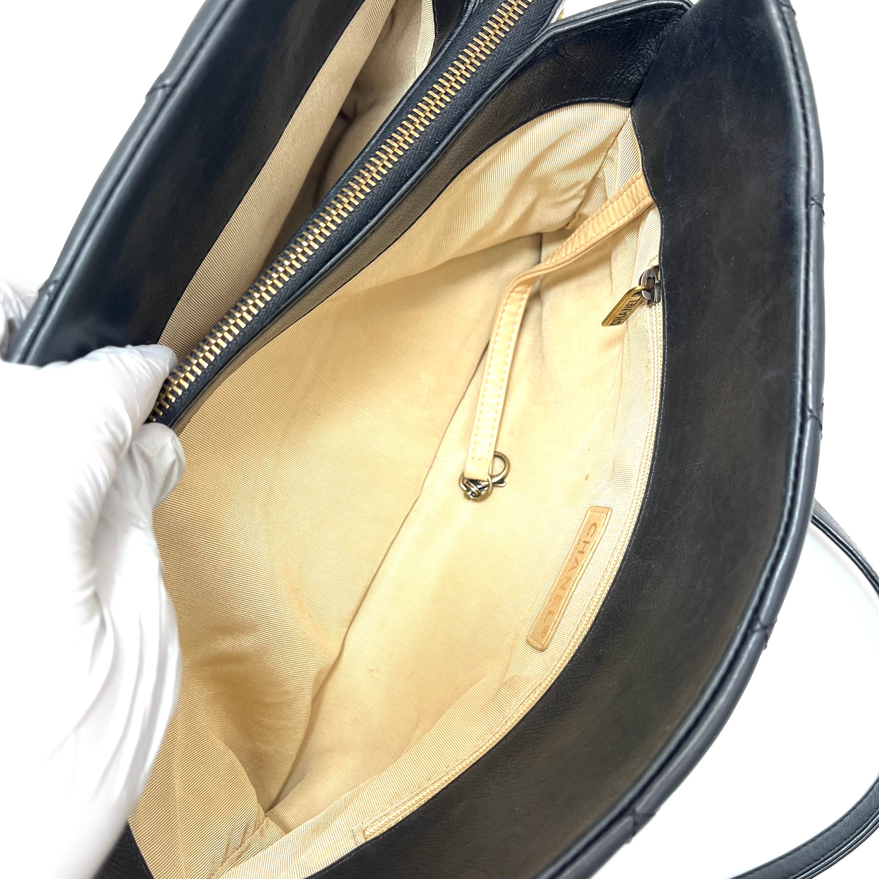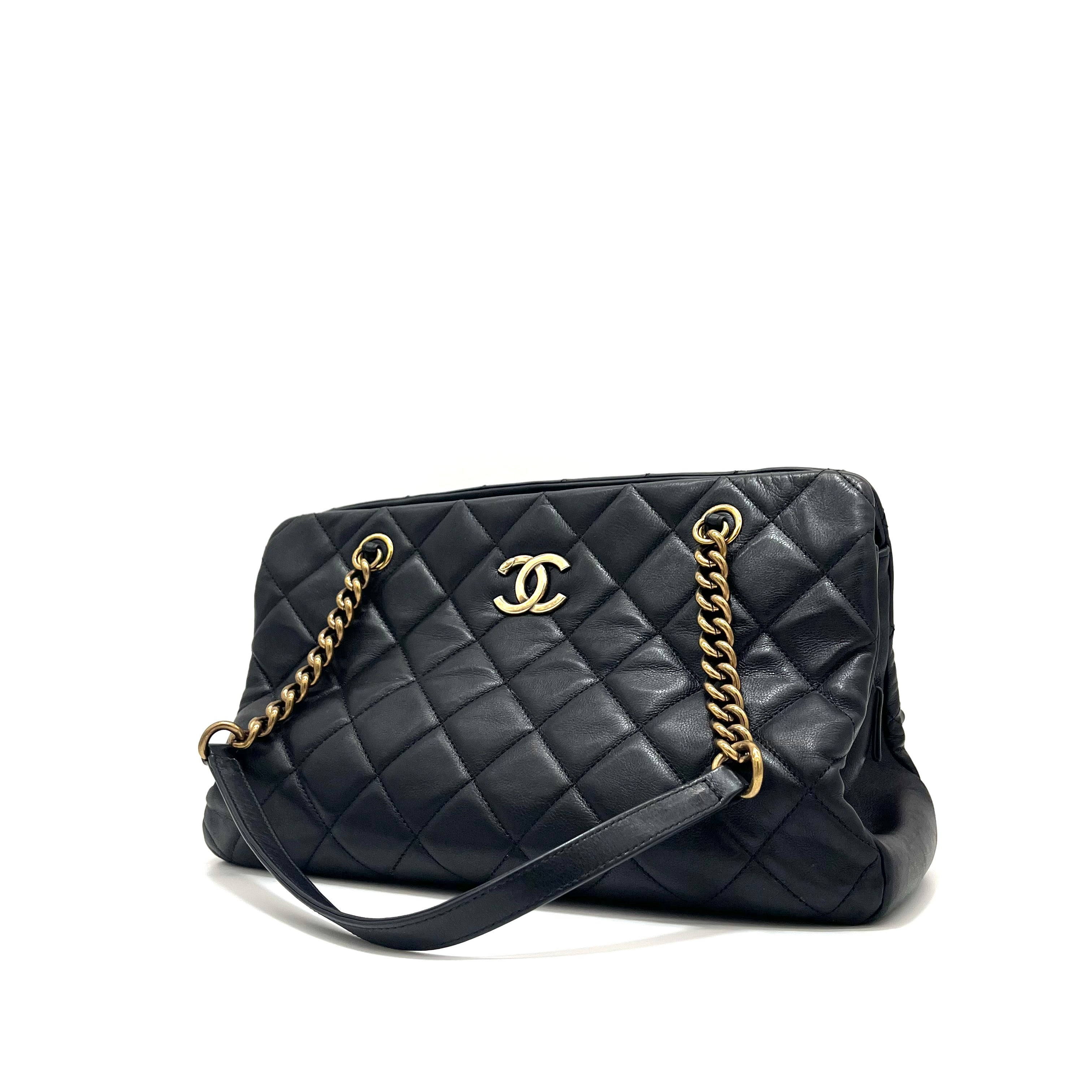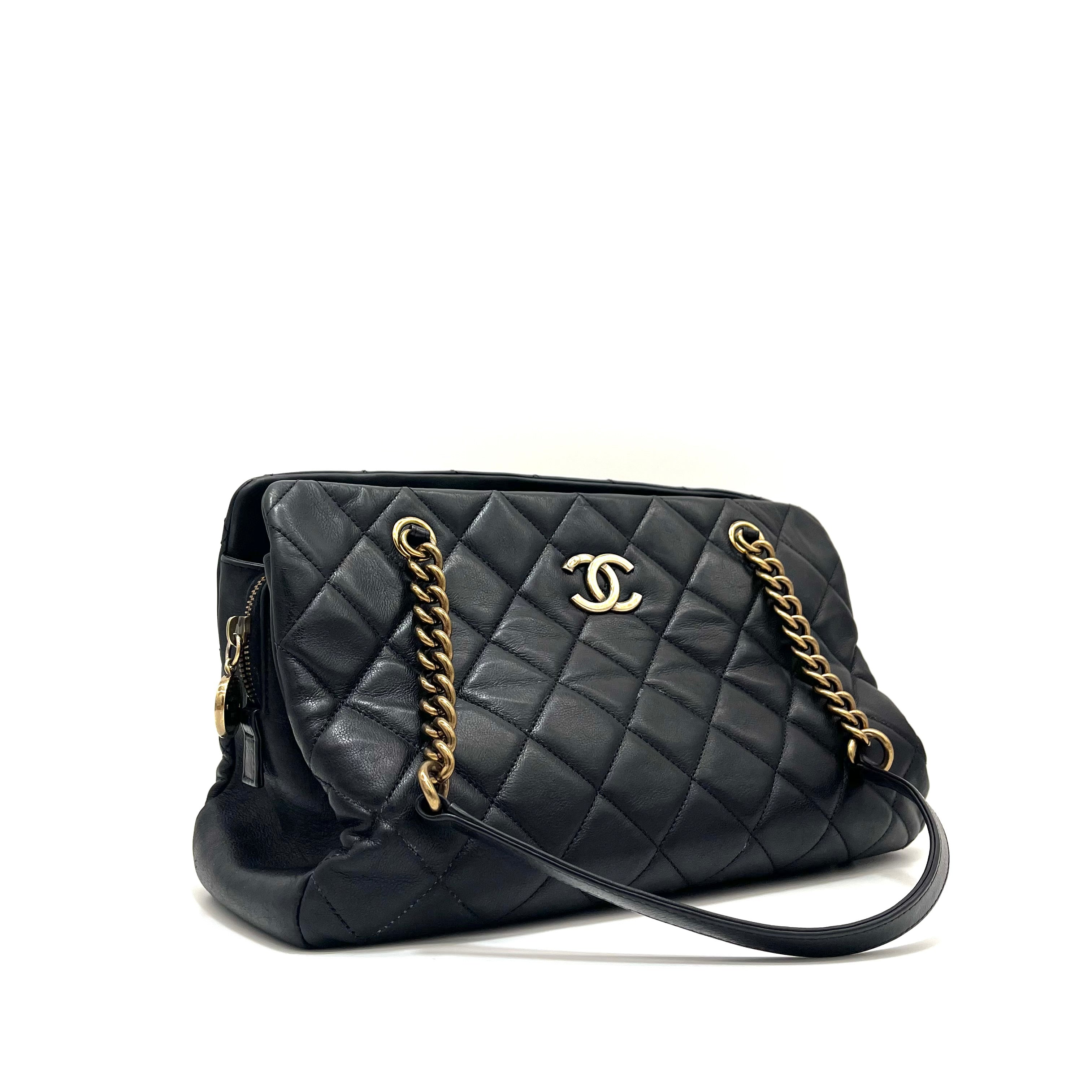 This is an authentic CHANEL Calfskin Quilted Small CC Crown Tote in Black. This stunning tote is crafted of smooth luxurious diamond quilted calfskin leather in black. The bag features aged gold Chanel CC logo and thick aged gold chain link shoulder straps with leather shoulder pads. The top is open to a partitioned beige fabric interior with a central zipper compartment and pocket. This is a chic tote, ideal for everyday use, from Chanel!