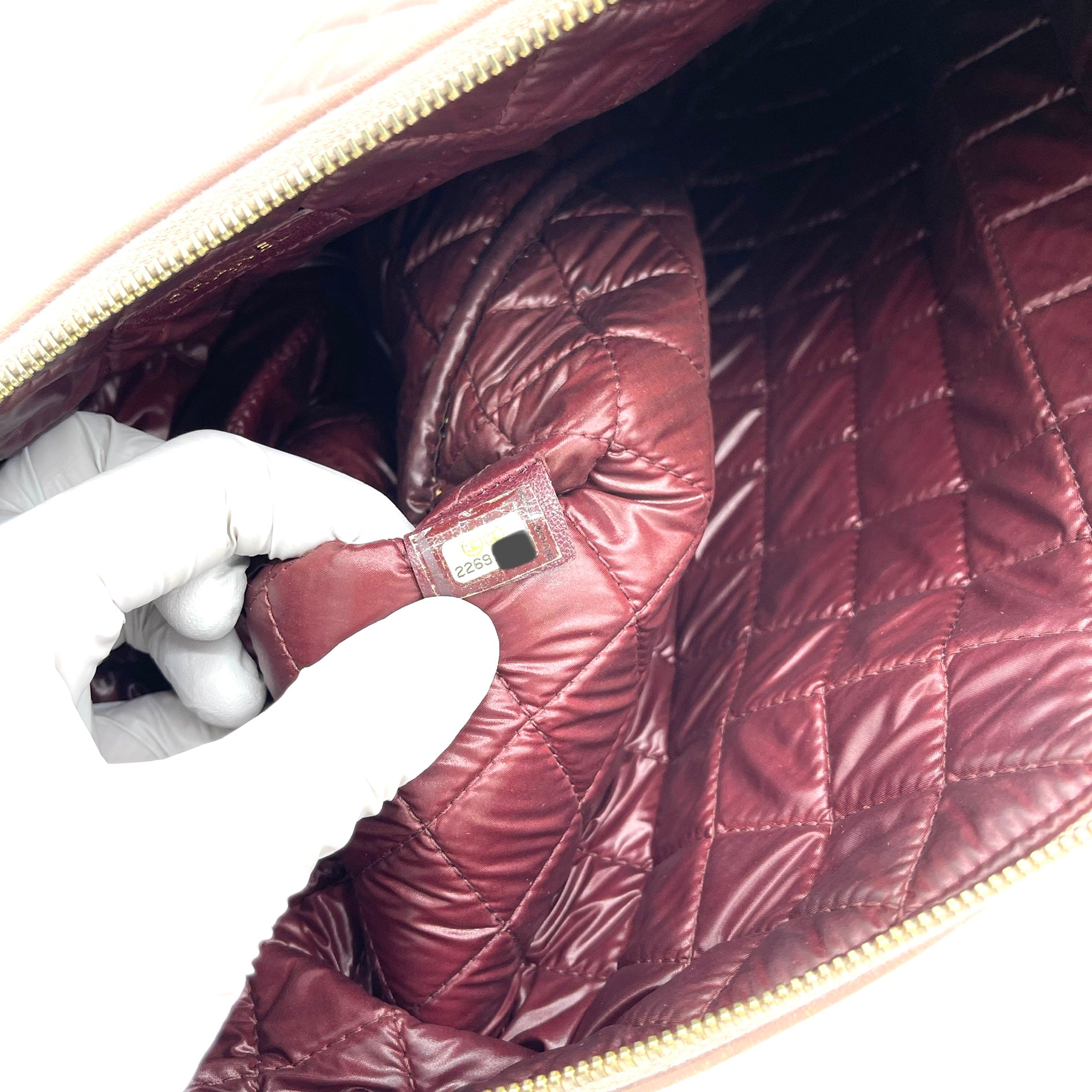 정품 샤넬 양가죽 퀼팅 마드모아젤 빈티지 핑크 라지 지퍼 파우치입니다. 시그니처 다이아몬드 스티치가 돋보이는 고급스러운 양가죽으로 제작된 세련된 파우치입니다. 파우치에는 광택 처리된 골드 샤넬 CC 인조 잠금 장치와 버건디색 나일론 내부로 열리는 상단 지퍼가 있습니다.