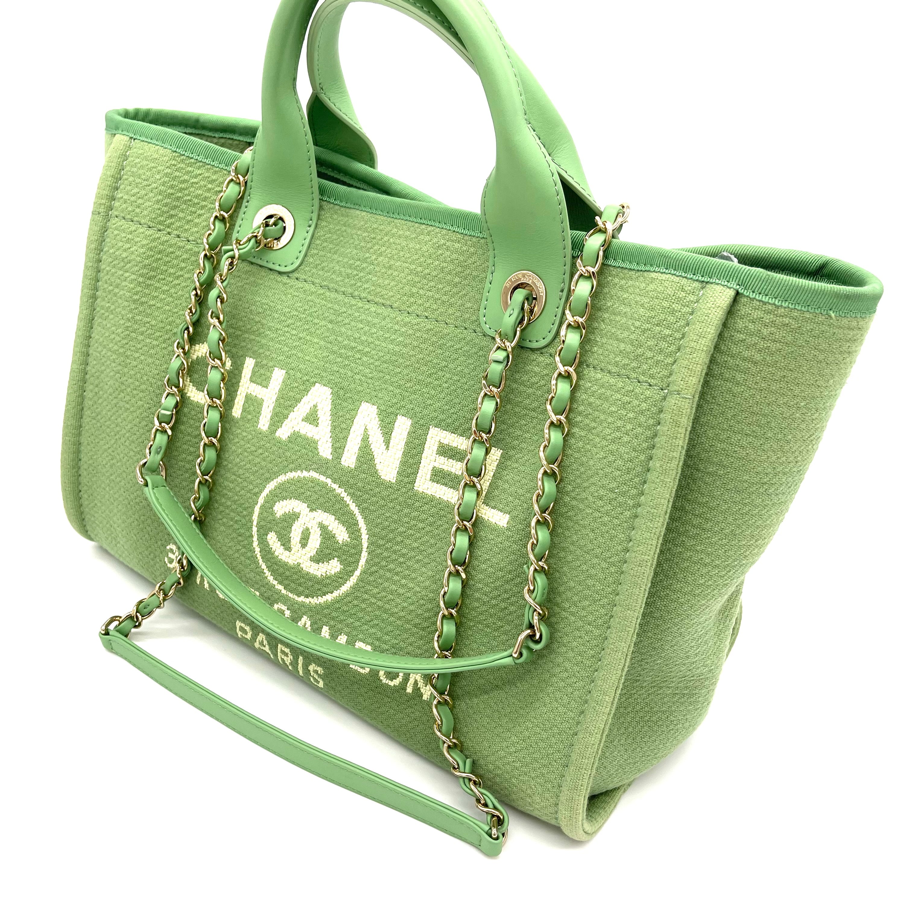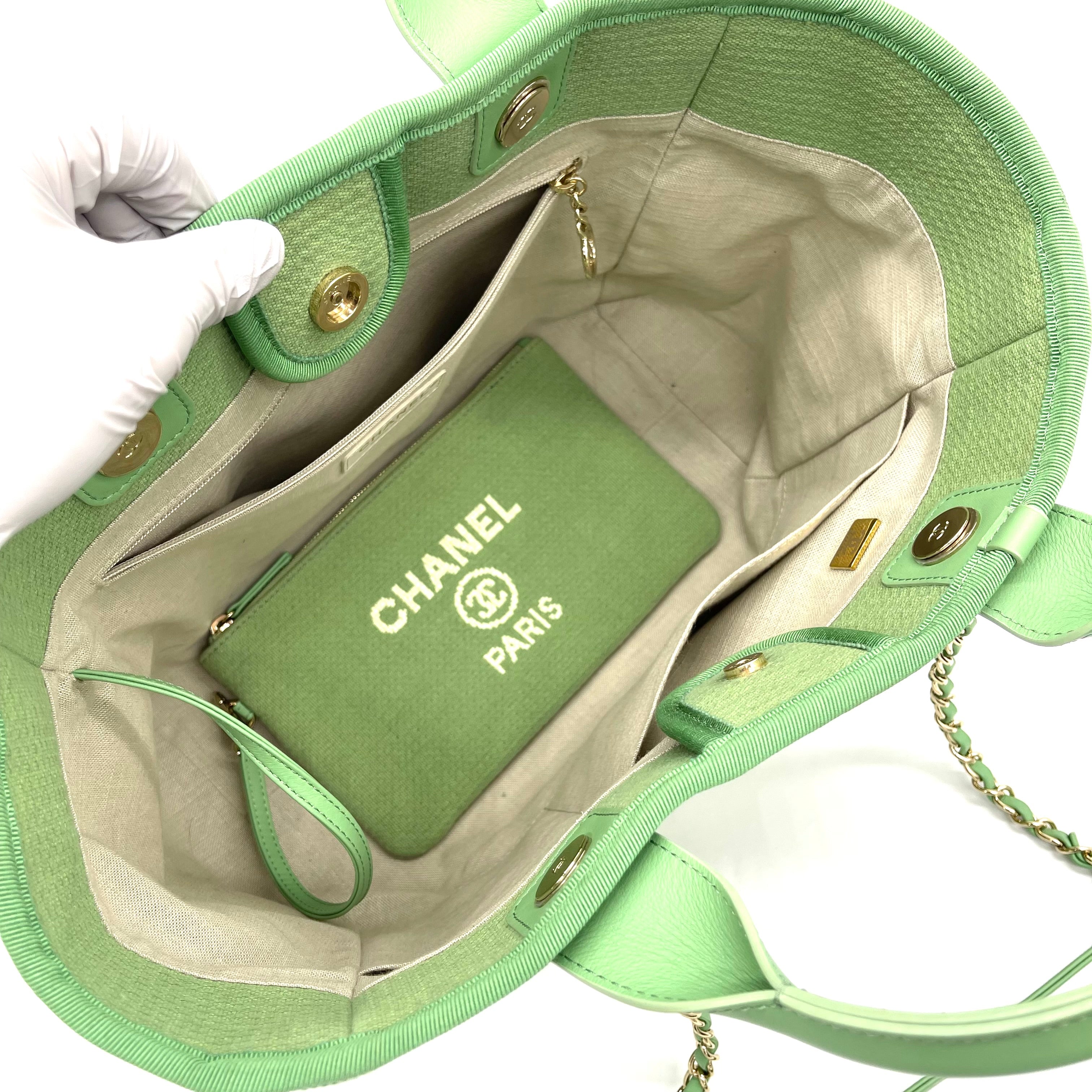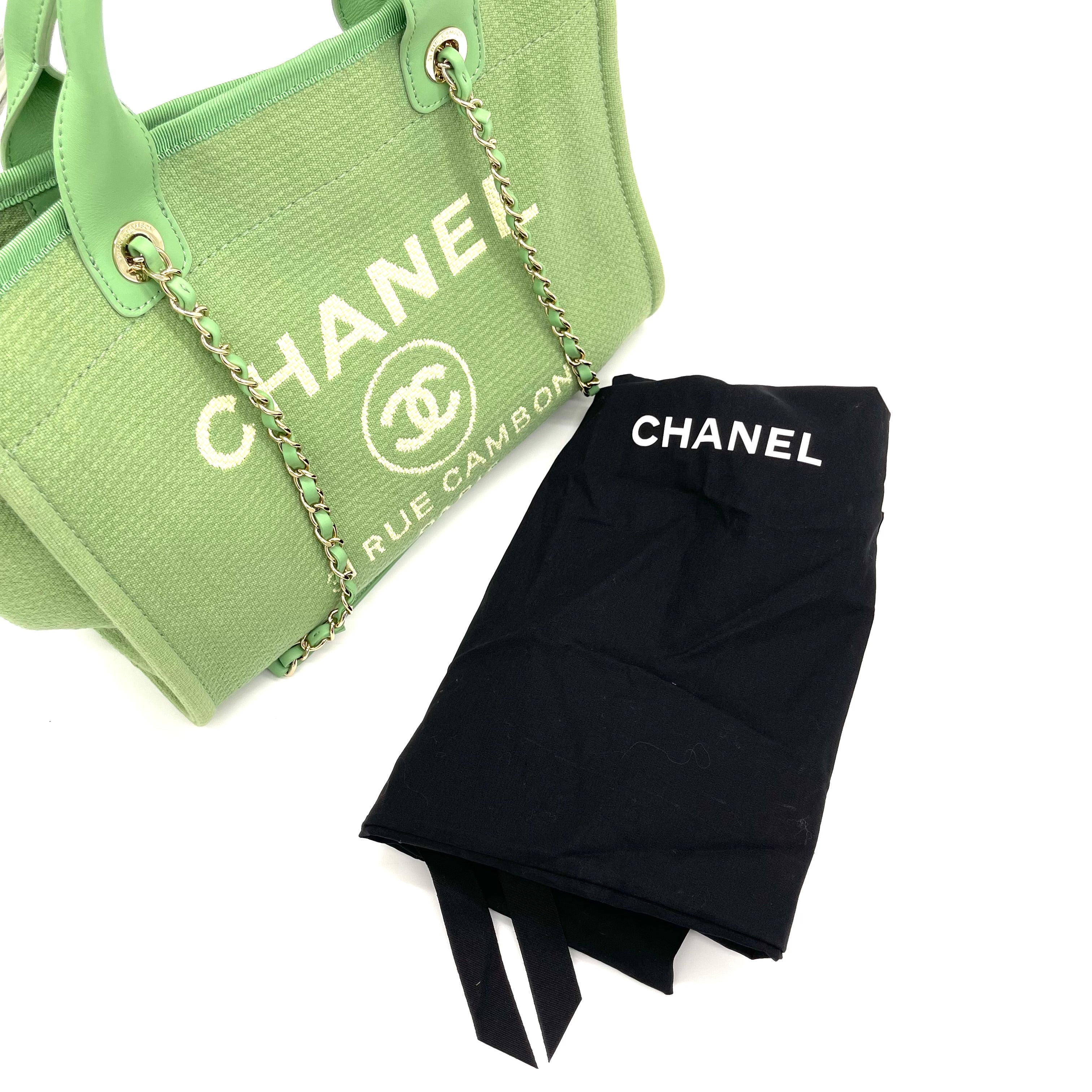 This is an authentic CHANEL Mixed Fibers Small Deauville Tote in Green. This tote is crafted of mixed fibers in green with a white printed Chanel logo. The bag features rolled leather top handles, gold chain link fabric threaded shoulder straps with leather shoulder pads, and silver hardware. The top opens to a beige fabric interior with zipper and patch pockets.