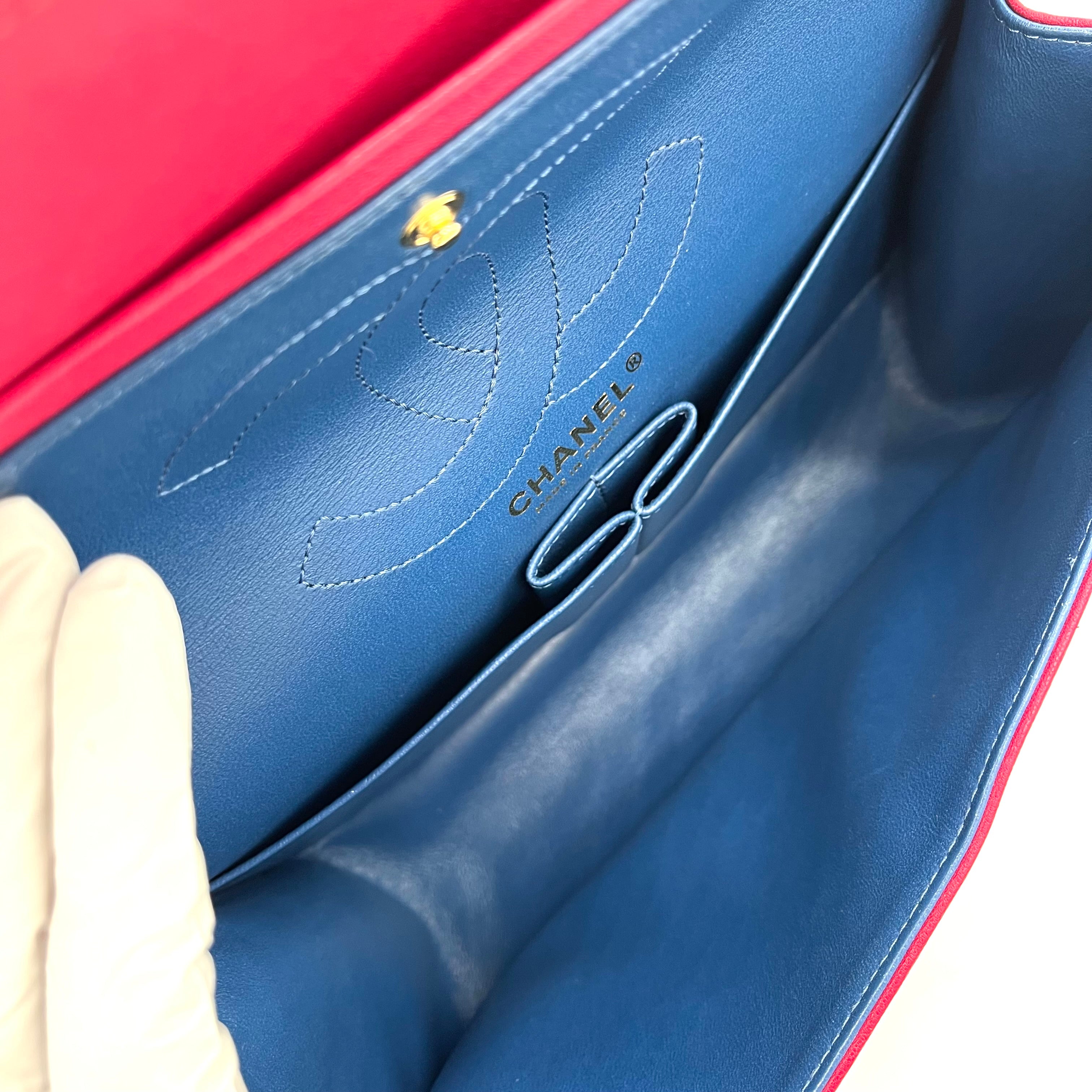 This is an authentic CHANEL Sheepskin Chevron Quilted 2.55 Reissue 226 Flap in Dark Pink. This stylish shoulder bag is beautifully crafted of chevron-quilted sheepskin leather in pink. The bag features a reissue aged gold-toned chain straps with a frontal squared Mademoiselle turn lock. This opens the frontal semi-full flap to a blue leather interior with patch pockets.