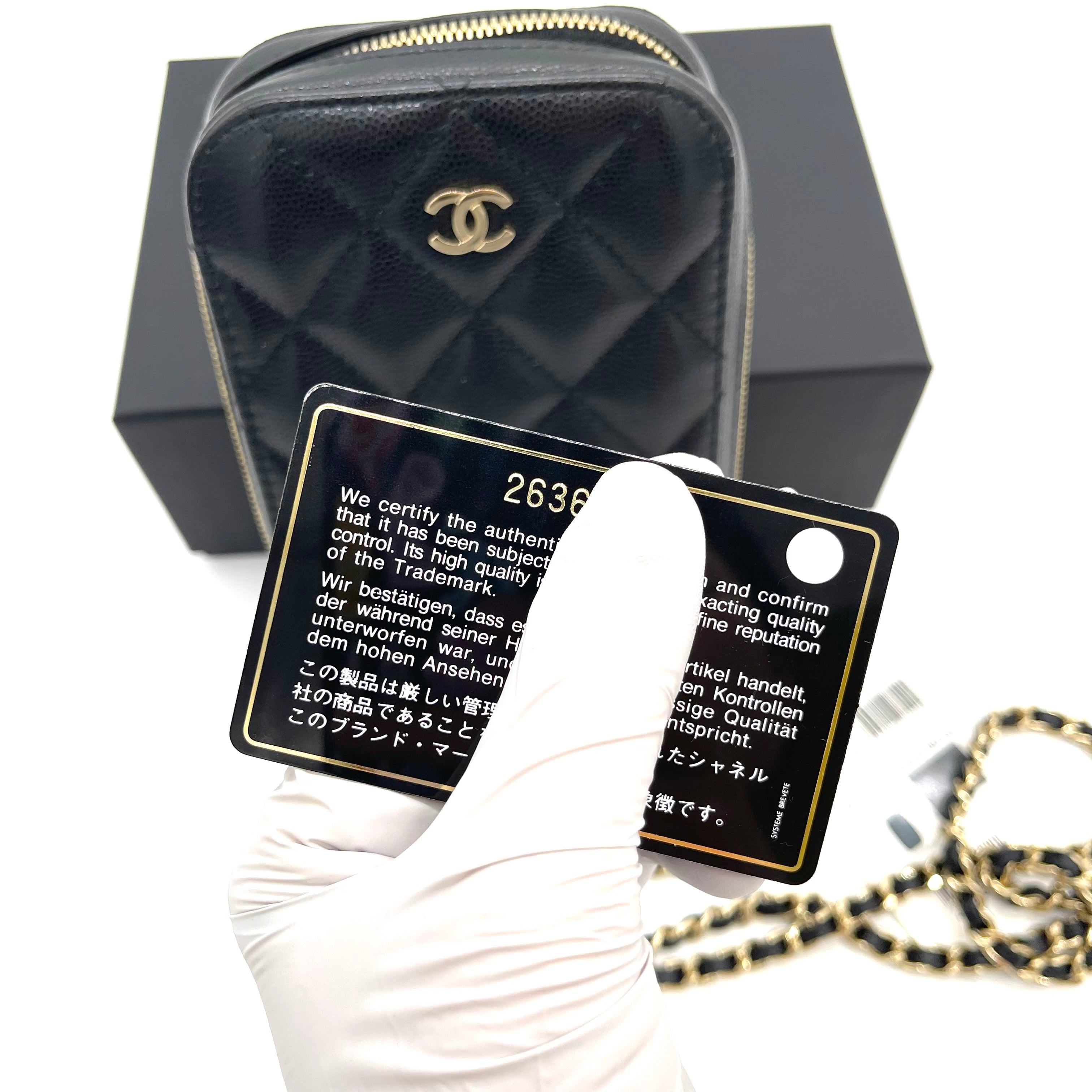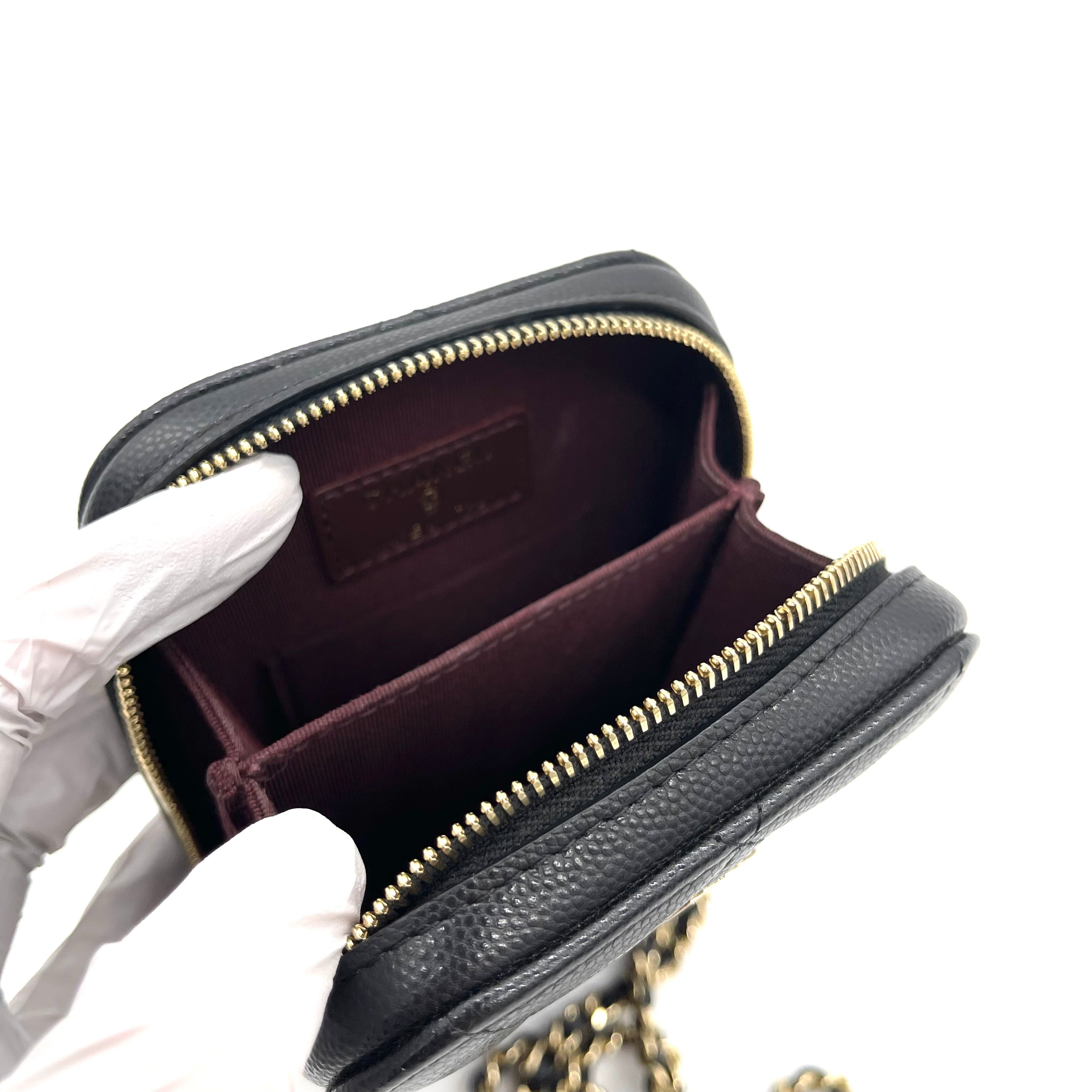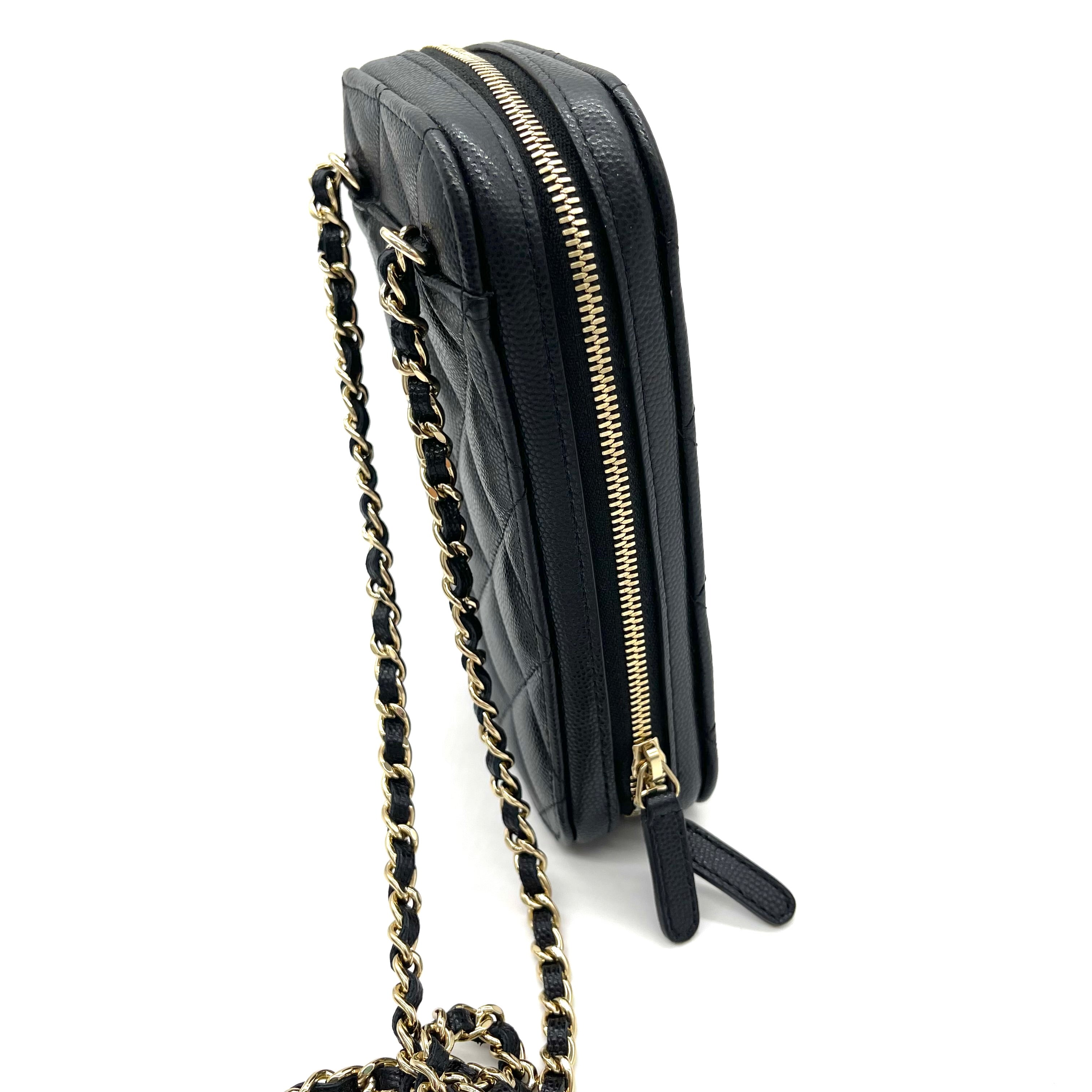 Sleek and stylish, this CHANEL bag features black grained calfskin leather with a secure zip-around closure. The chic chain shoulder strap lets you wear it comfortably day or night. Compact yet functional, it’s perfect for carrying your phone and essentials in timeless CHANEL style.