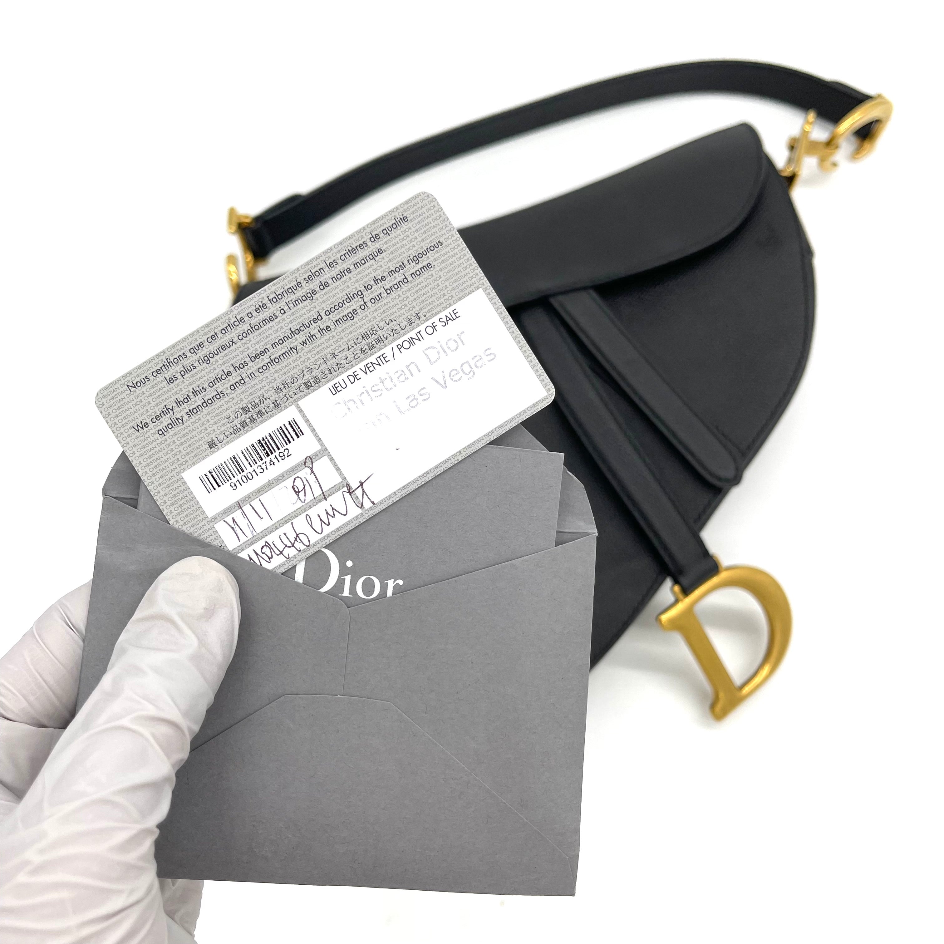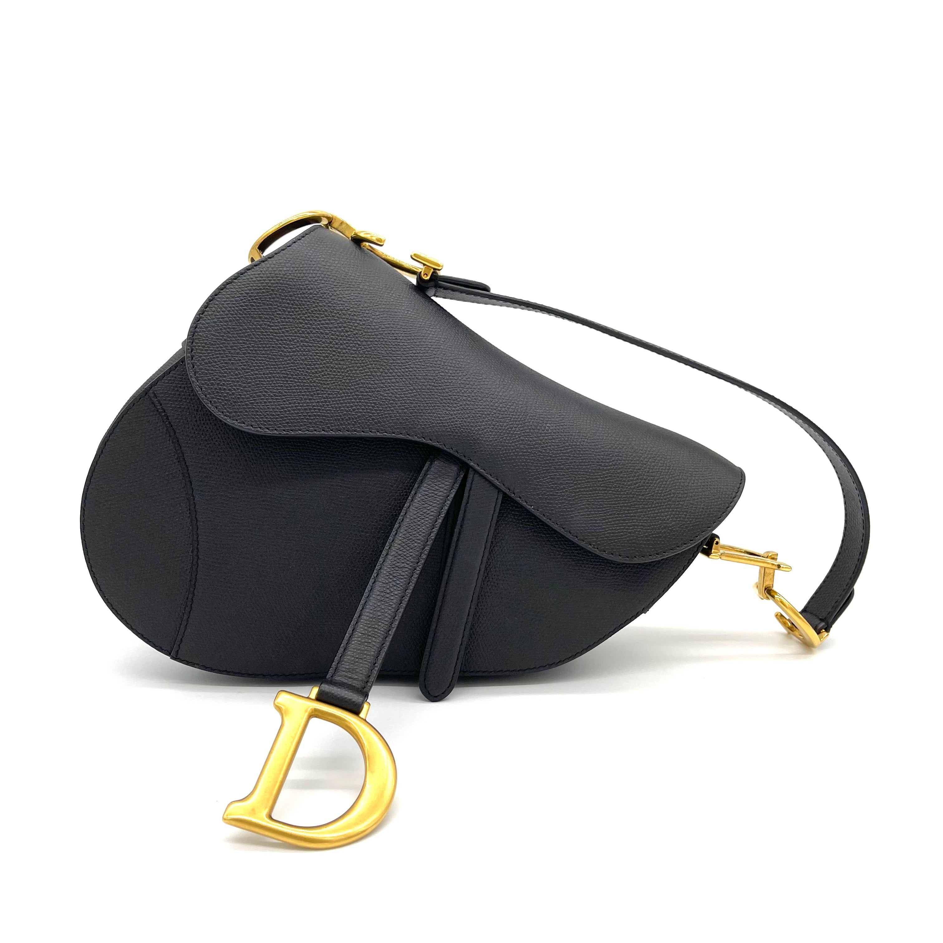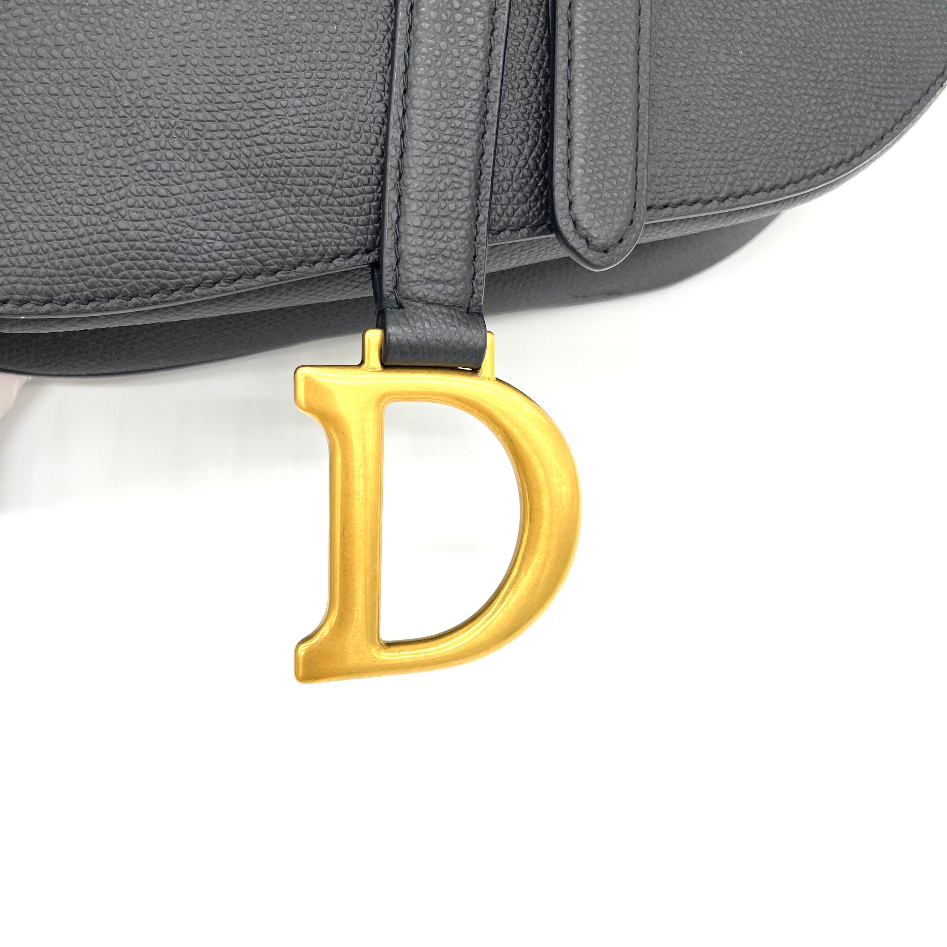 This is an authentic CHRISTIAN DIOR Grained Calfskin Saddle Bag in Black. This saddle-shaped handbag is crafted of grained calfskin leather in black and features a matching leather strap, secured with aged gold CD logo anchors. The front flap has an aged gold D initial logo and opens to a black suede interior with a zipper pocket.