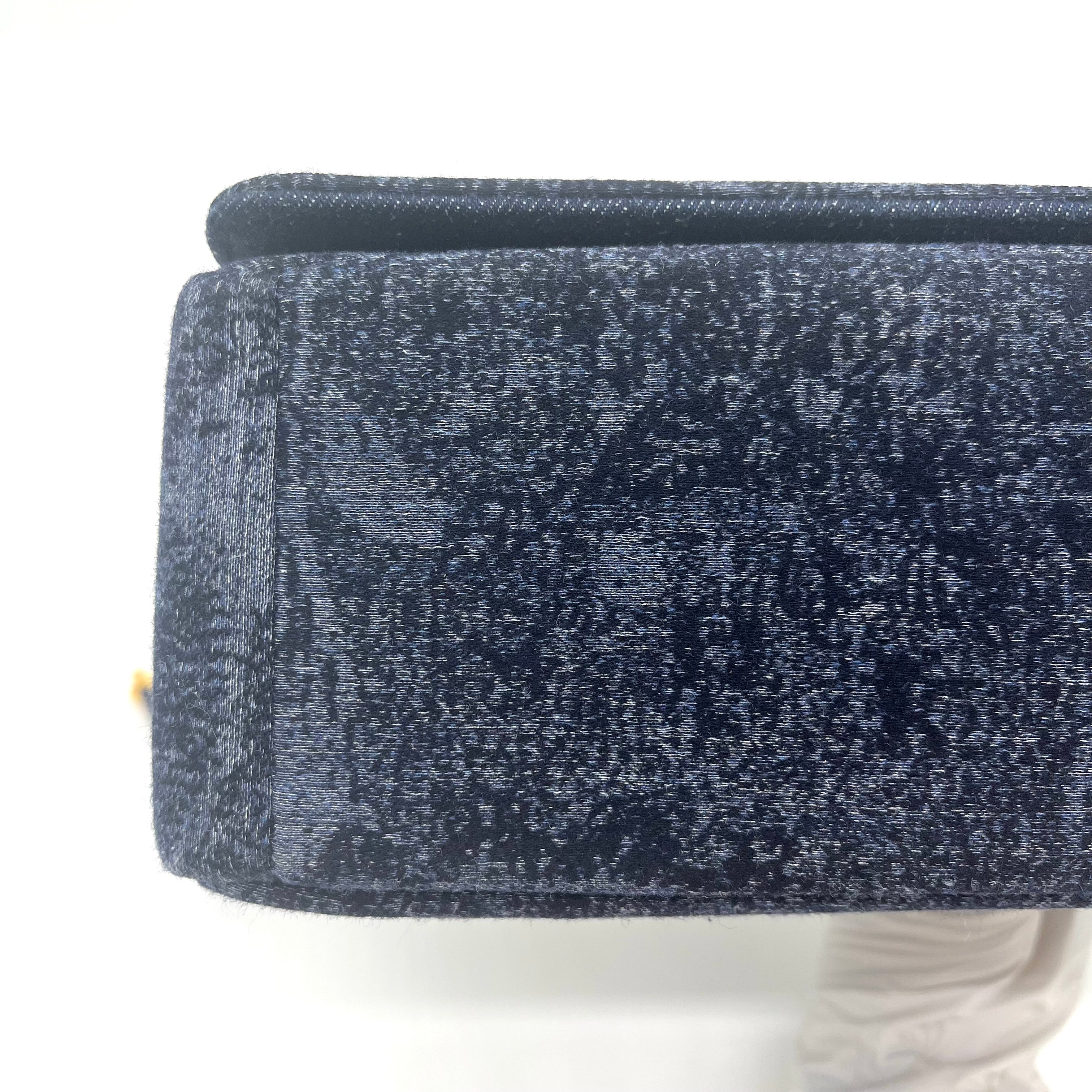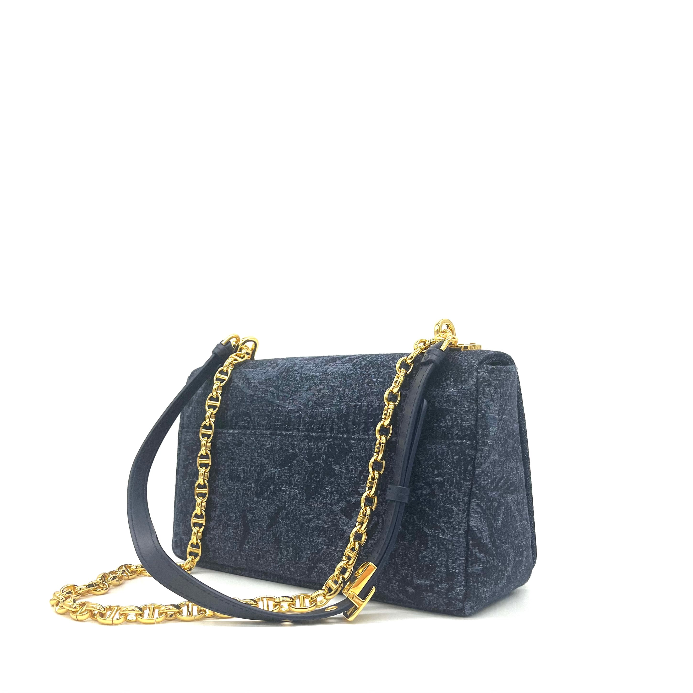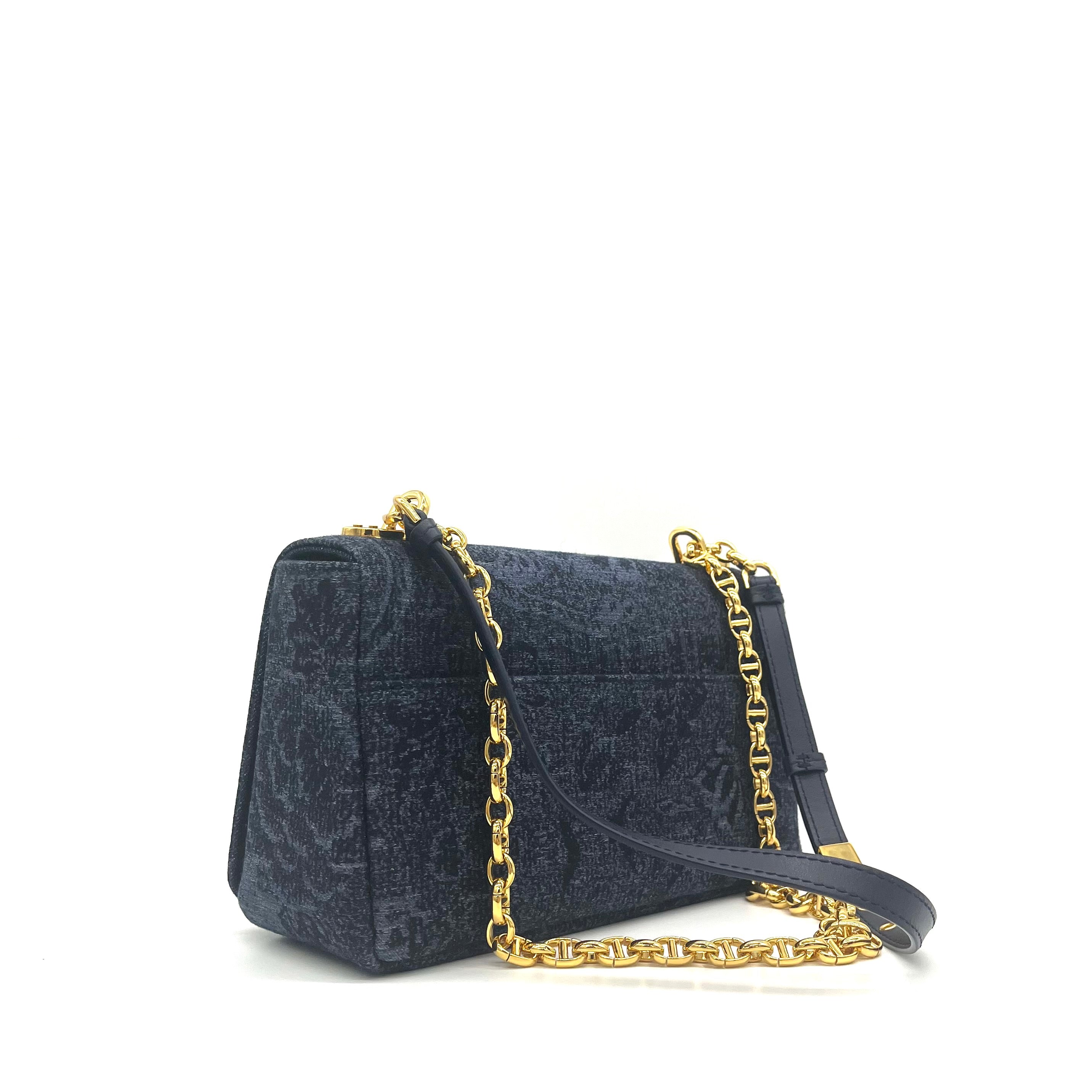This is an authentic CHRISTIAN DIOR Denim Brocart Embroidered Medium Caro Bag in Blue. The bag is crafted of floral printed denim in shades blue. It features a gold chain shoulder strap with an adjustable shoulder pad, a rear patch pocket with an embroidered Christian Dior logo, and polished gold CD logo turn lock on the front flap. The bag opens to a denim interior with a zipper pocket and patch pocket.
