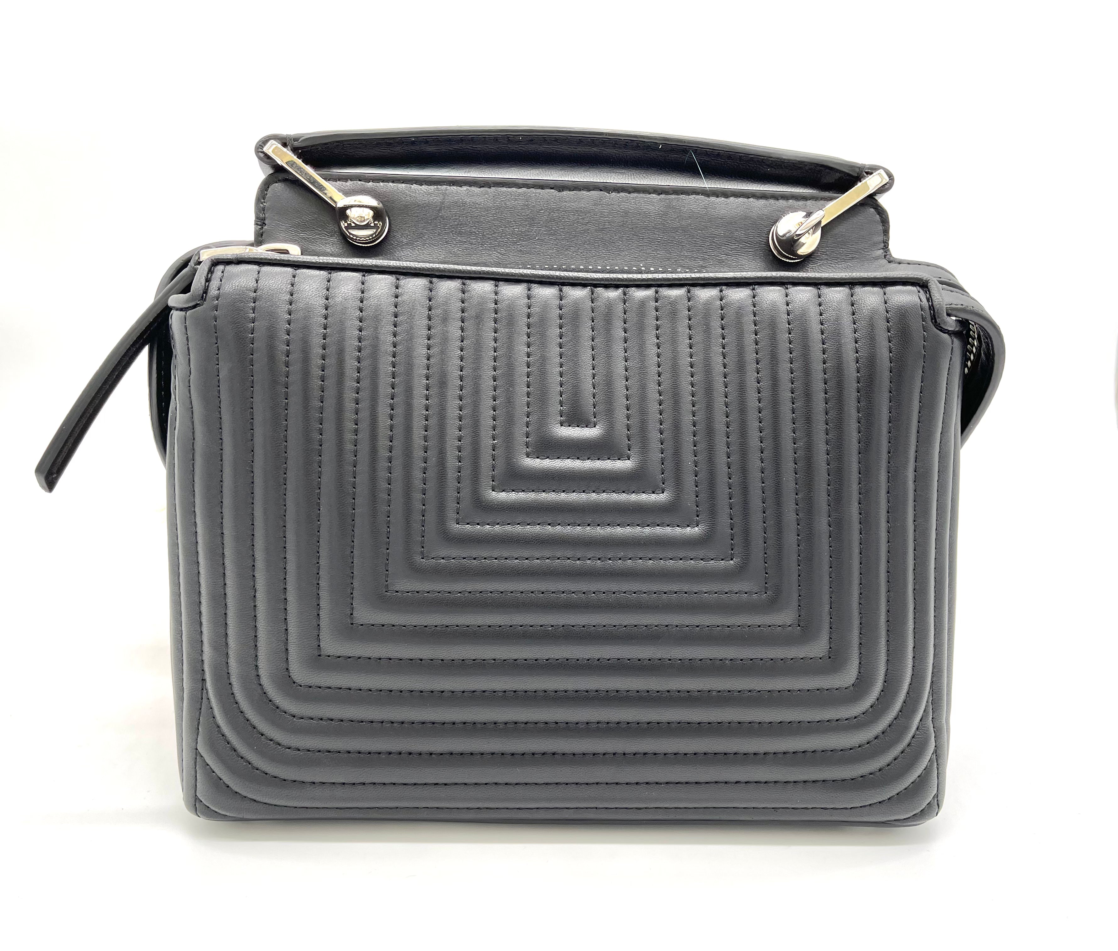 정품 FENDI 양가죽 퀼트 스몰 닷컴 사첼 블랙 컬러입니다. 이 고급스러운 가방은 블랙 컬러의 퀼팅 양가죽으로 제작되었습니다. 이 가방은 블랙 양가죽 핸들, 원뿔형 스터드가 포함된 실버 하드웨어, 앞면의 작은 컷아웃을 통해 볼 수 있는 탈부착 가능한 블랙 파우치로 구성되어 있습니다. 상단 프레임의 양쪽에 두 개의 확장 지퍼가 있으며 이를 열면 주머니가 있는 검정색 스웨이드 내부로 연결됩니다.