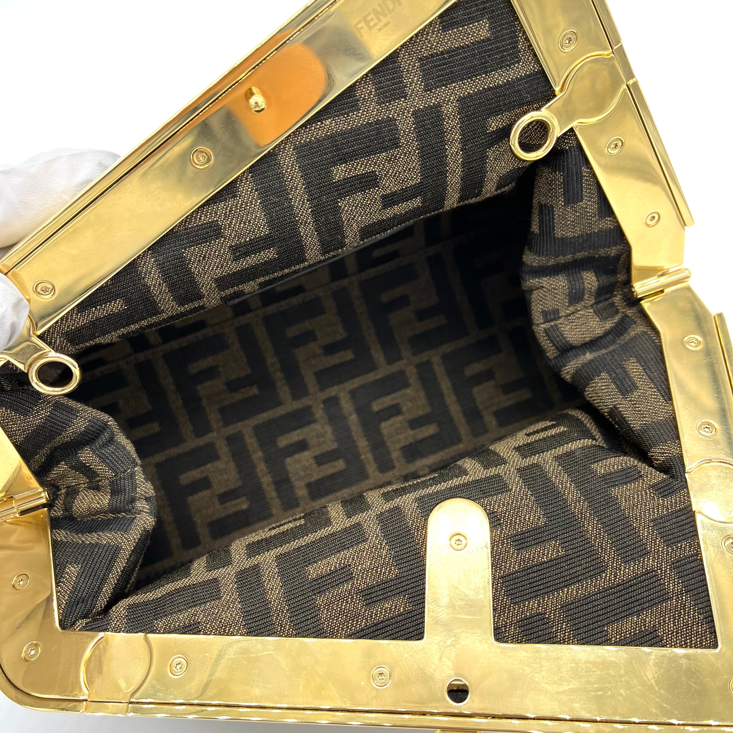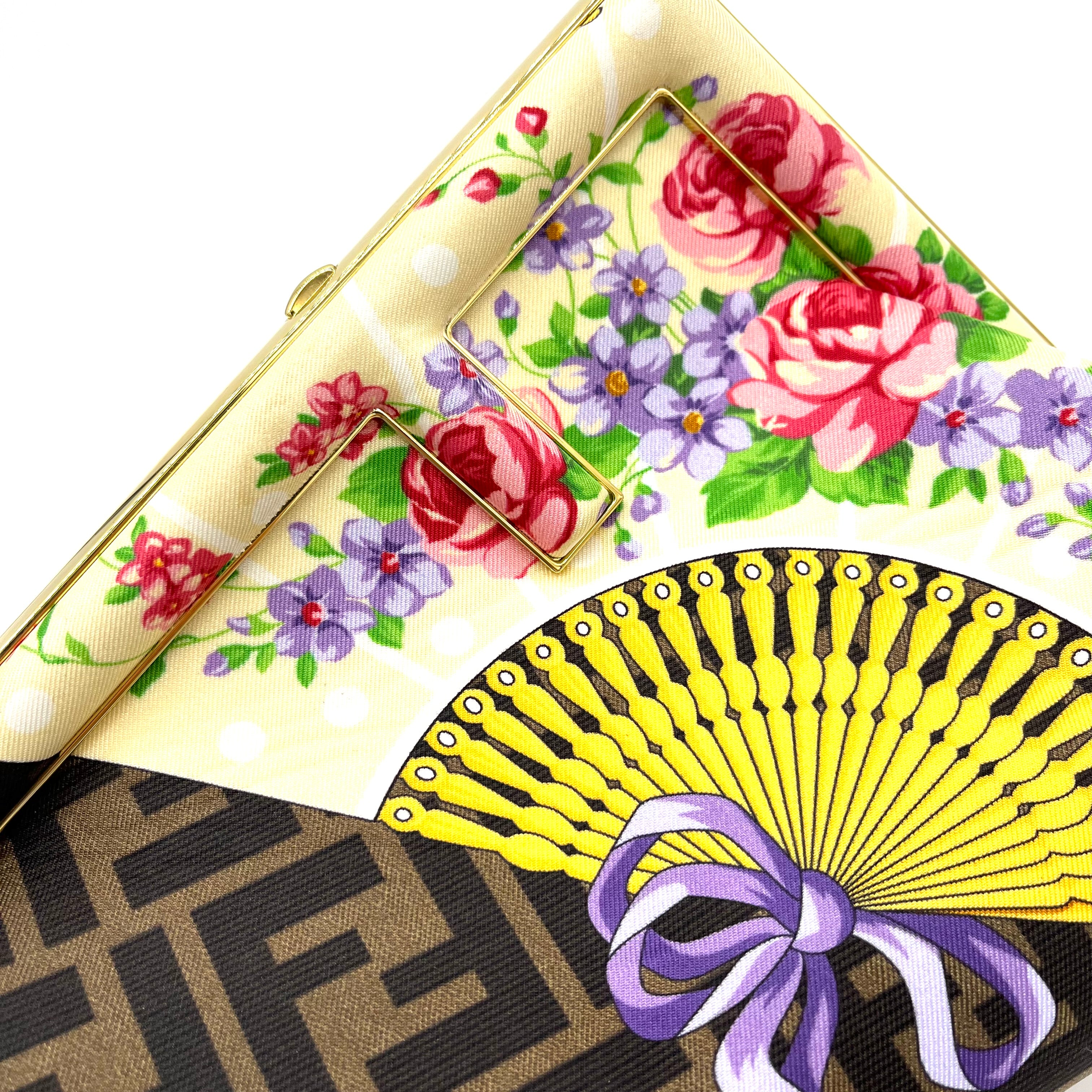 This is an authentic FENDI X VERSACE Silk Fendace FF Fans Small Fendi First in Tobacco, Moro, Black, and Multicolor. This chic bag is crafted of satin in a multicolor. The bag features a dark brown leather optional shoulder strap with polished gold-tone hardware. The top opens with a prominent hinged, gold-tone Fendi logo detail to a spacious interior. The bag is lined with the signature Fendi FF fabric jacquard motif.