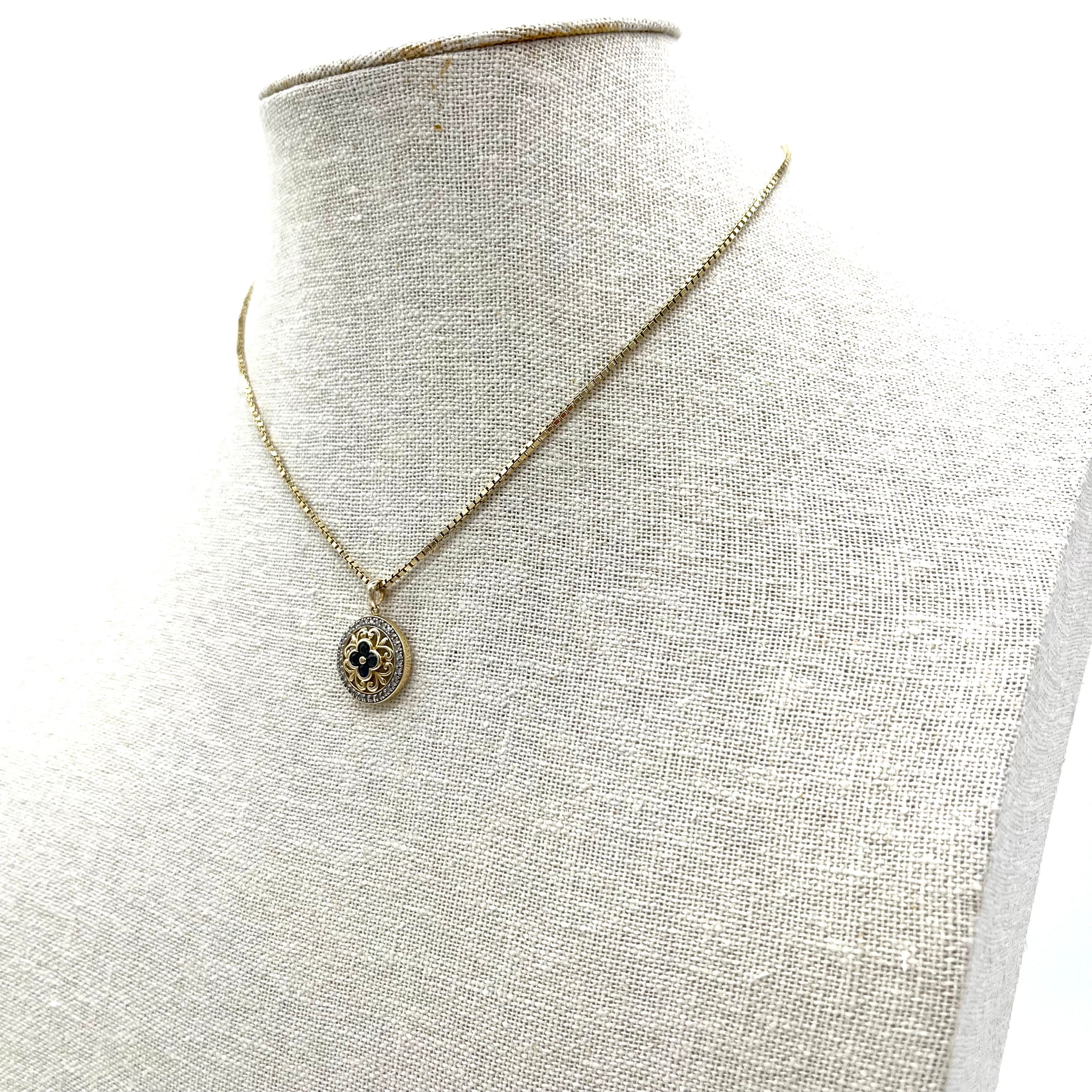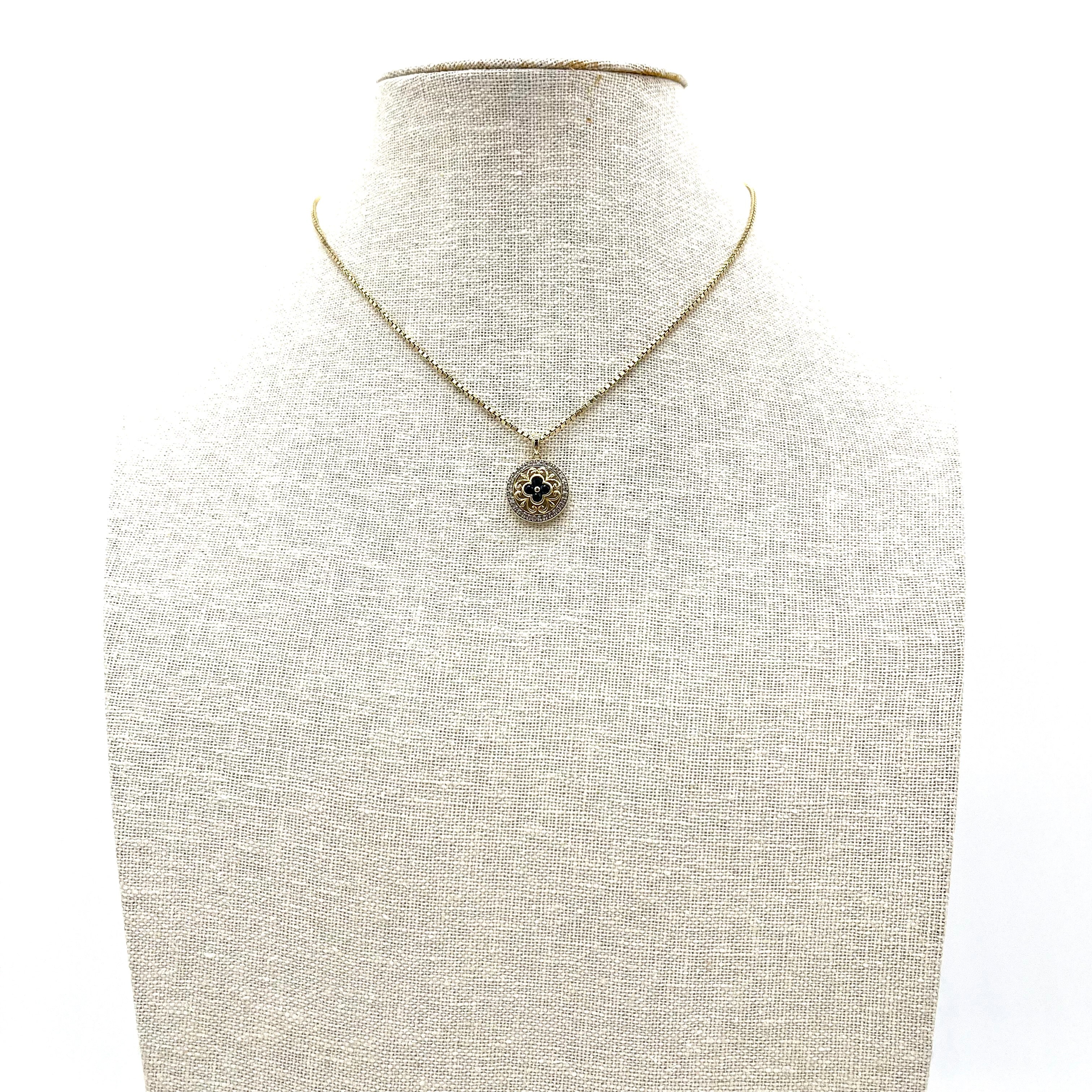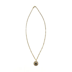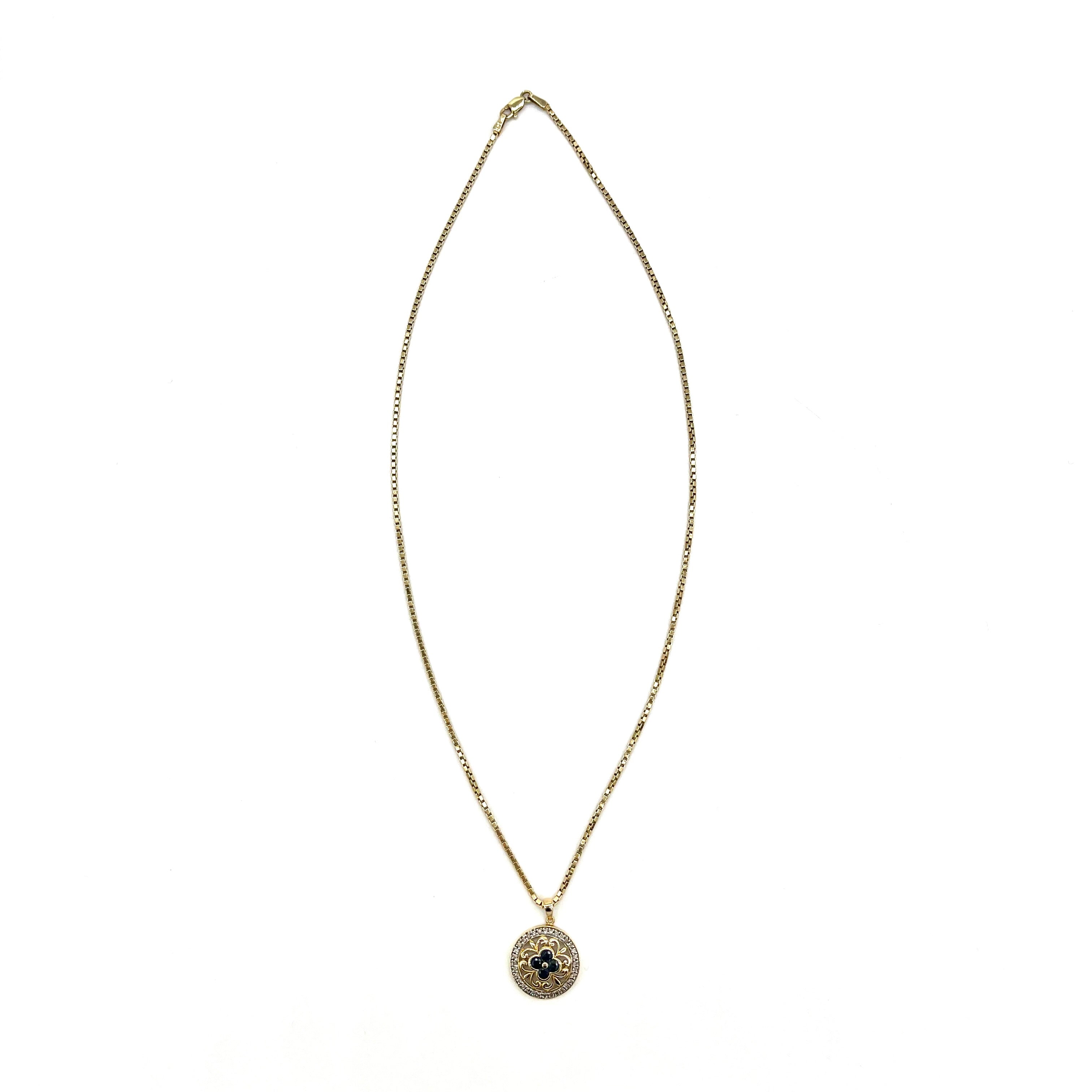 This is an Gemstone 14K Gold Necklace. The pendant shape is round. There is blue clover shaped crystal surrounded by flower designed. Outer diamond circle creates vintage and luxurious mood.