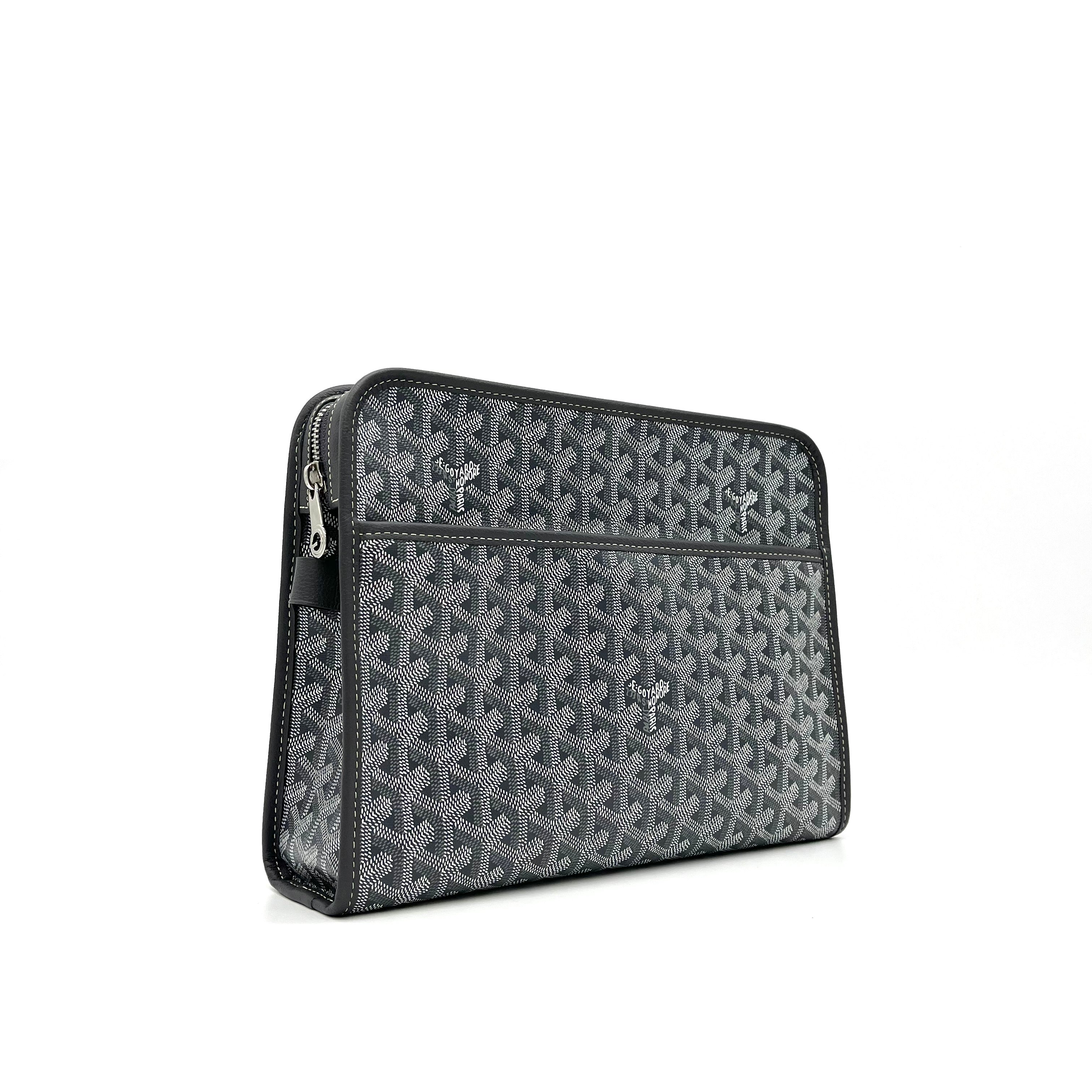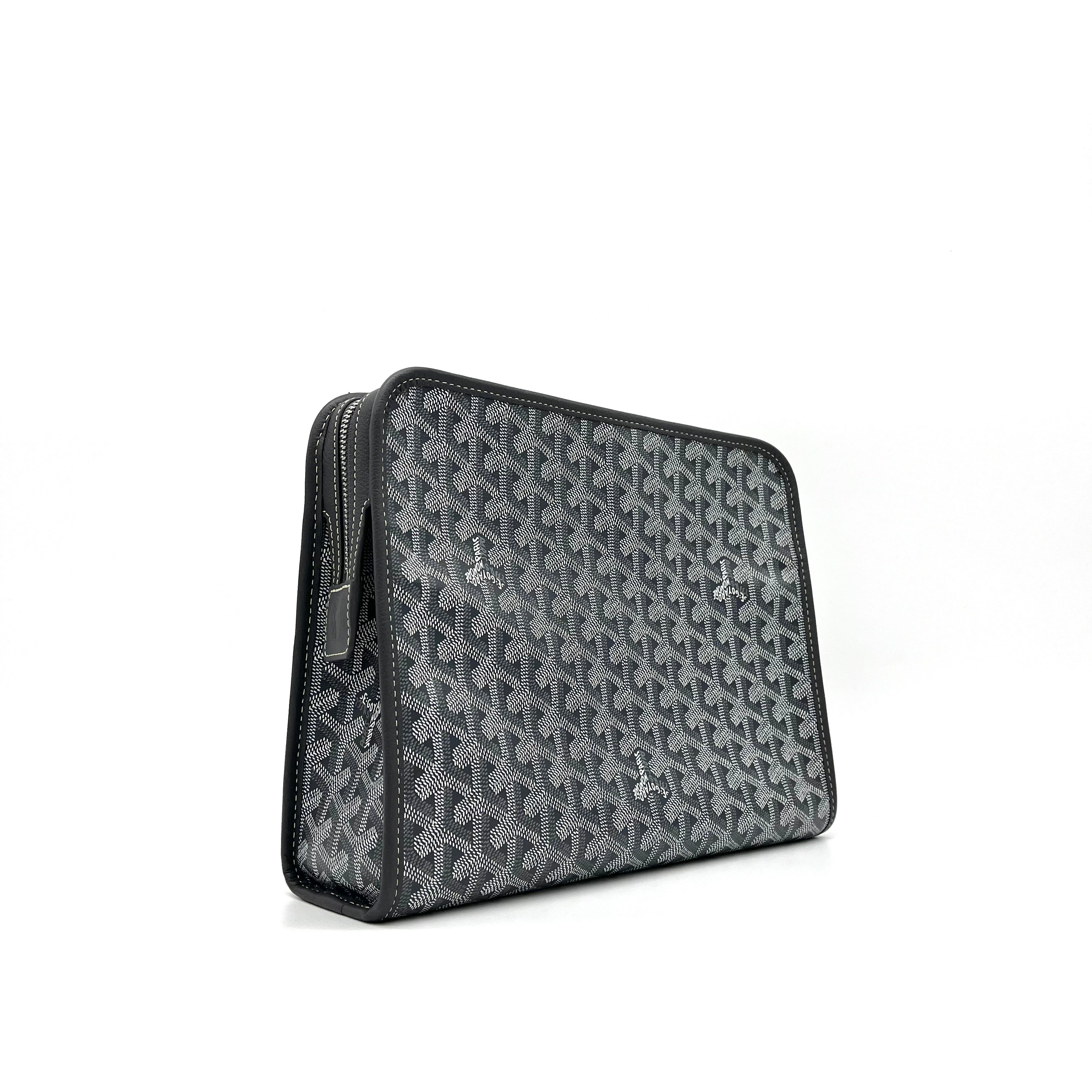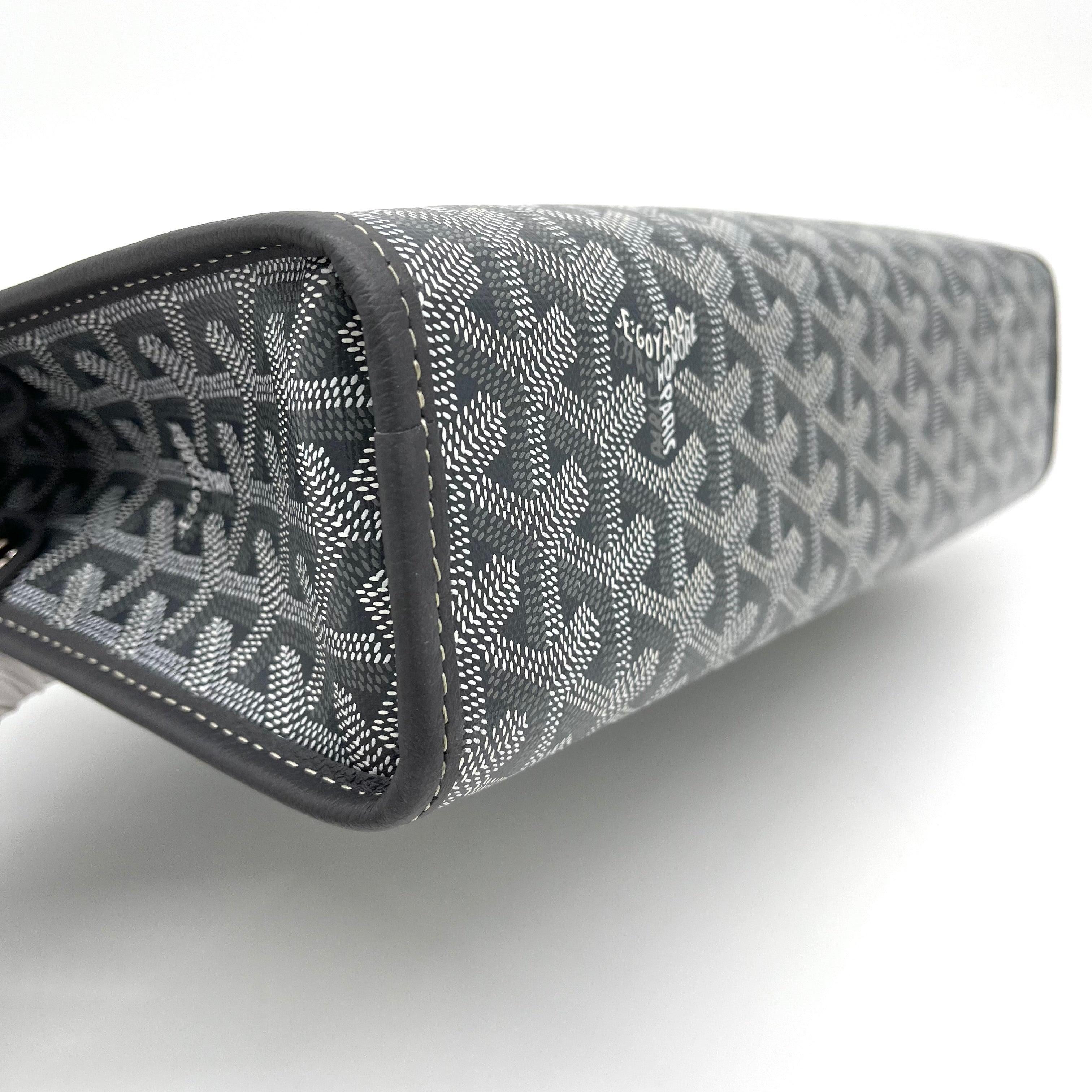 This is an authentic GOYARD Goyardine Jouvence Toiletry Pouch in Grey. This charming pochette is crafted of Goyard chevron monogram canvas in grey. The pouch features grey leather trim and has a front zipper compartment. The top zipper opens to a yellow fabric interior with a patch pocket.