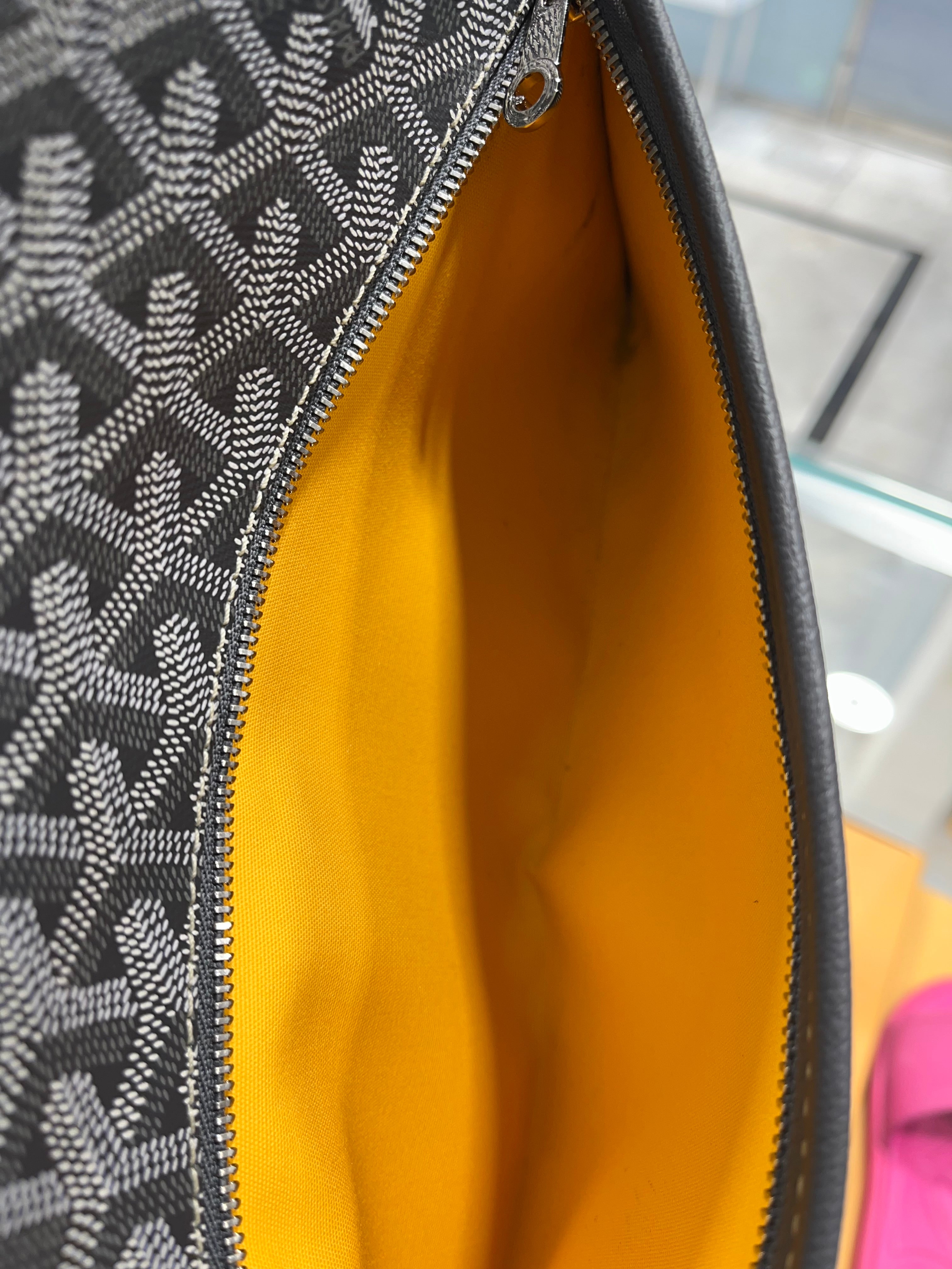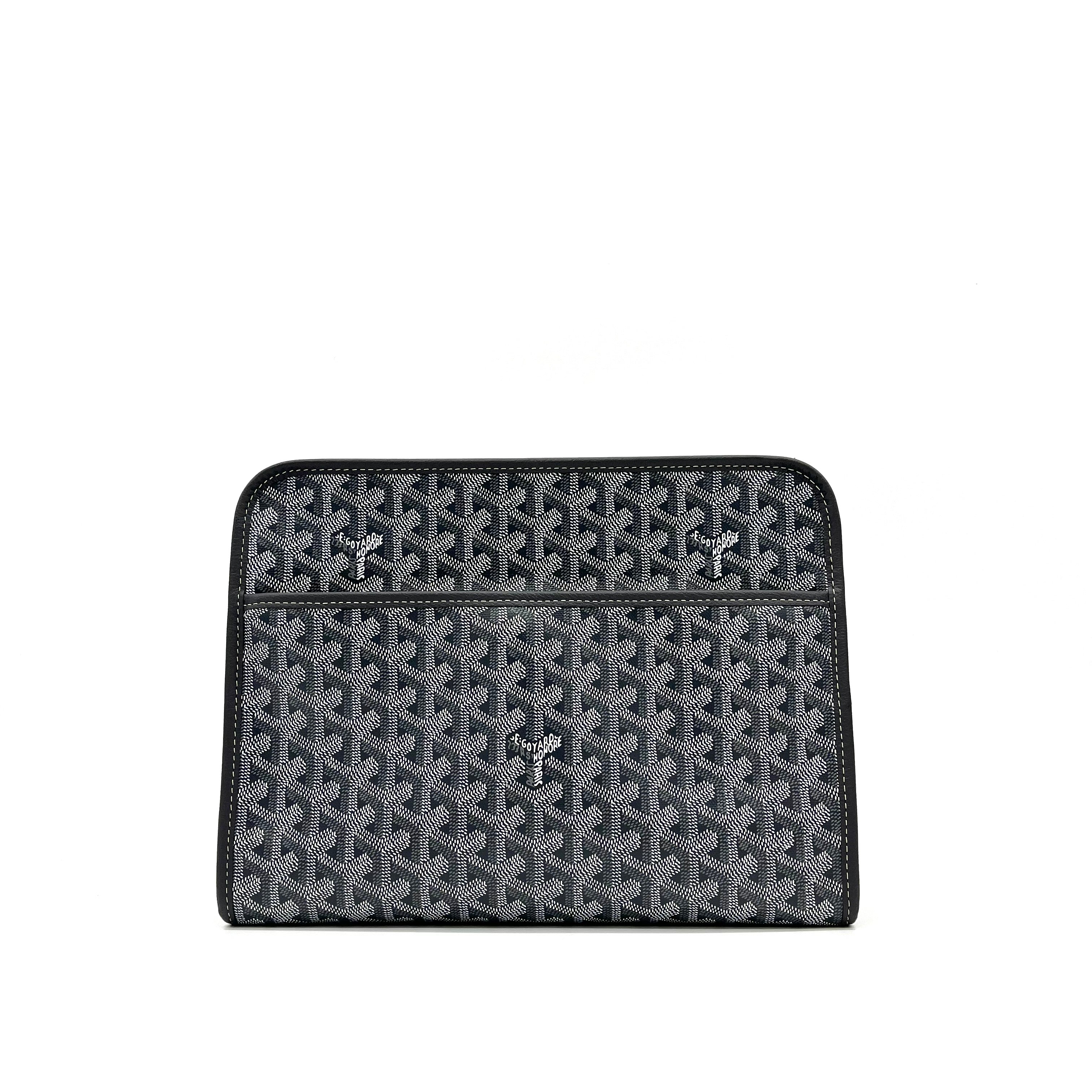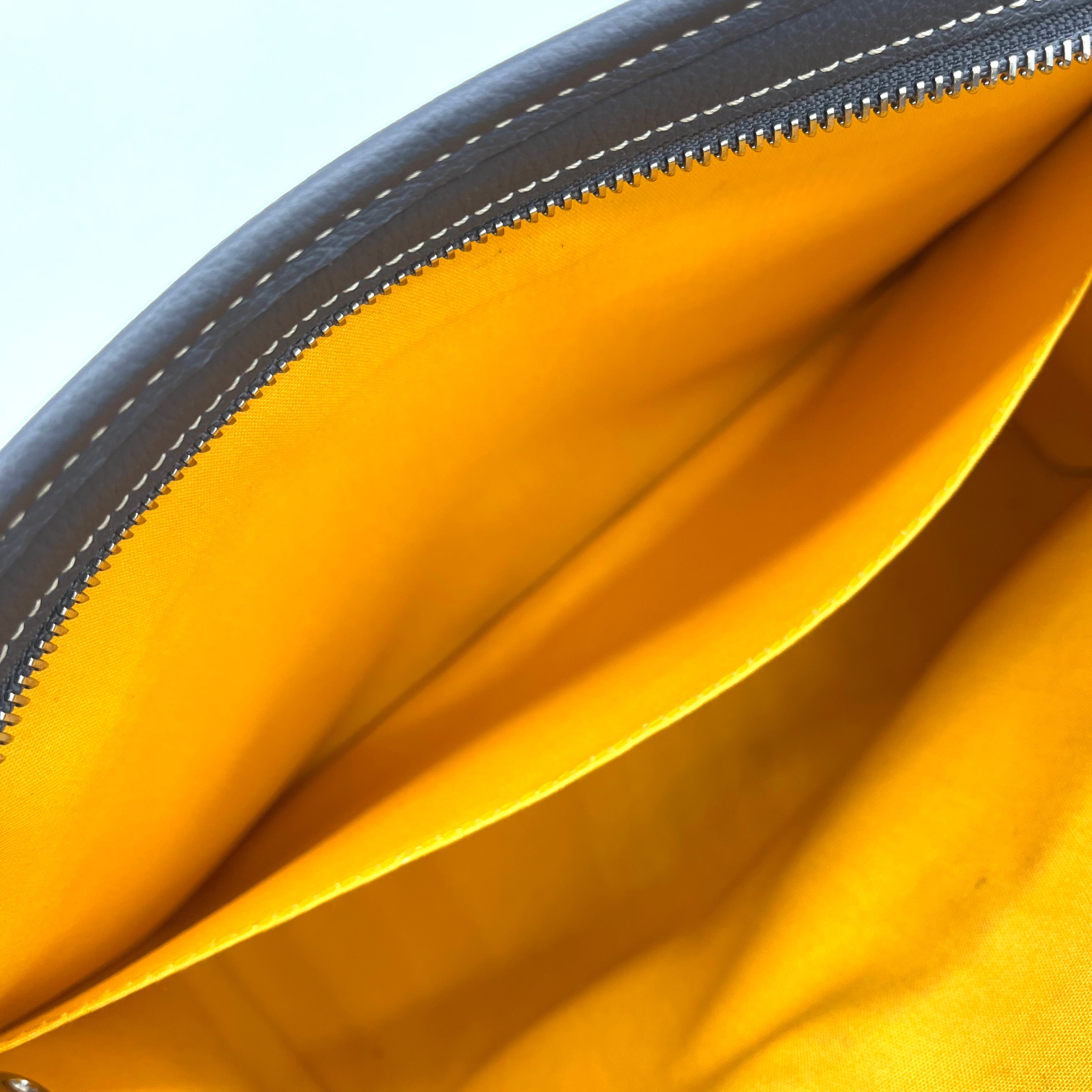 This is an authentic GOYARD Goyardine Jouvence Toiletry Pouch in Grey. This charming pochette is crafted of Goyard chevron monogram canvas in grey. The pouch features grey leather trim and has a front zipper compartment. The top zipper opens to a yellow fabric interior with a patch pocket.