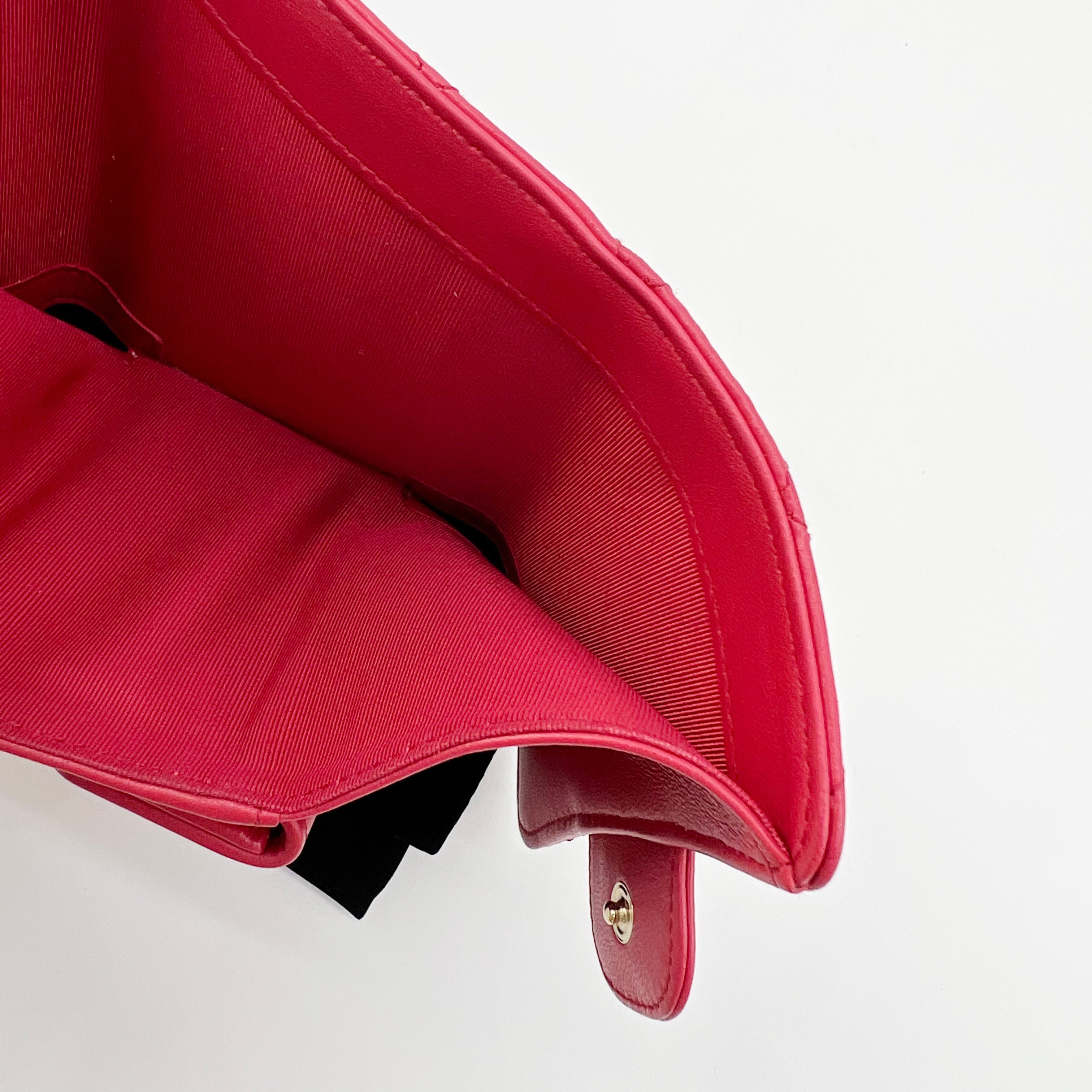 이 카드홀더는 푸시아 레드 컬러의 다이아몬드 퀼팅 가죽으로 제작되었습니다.