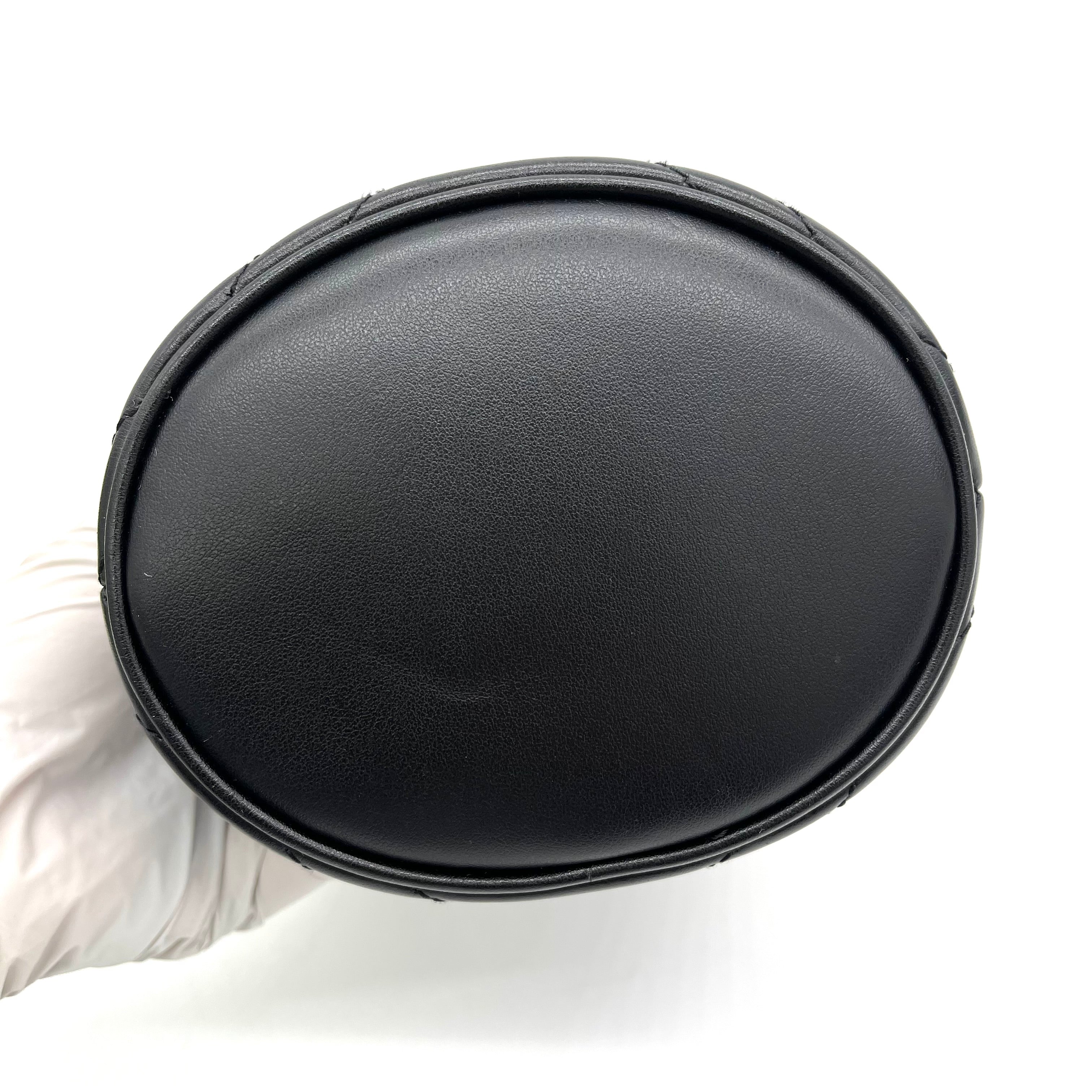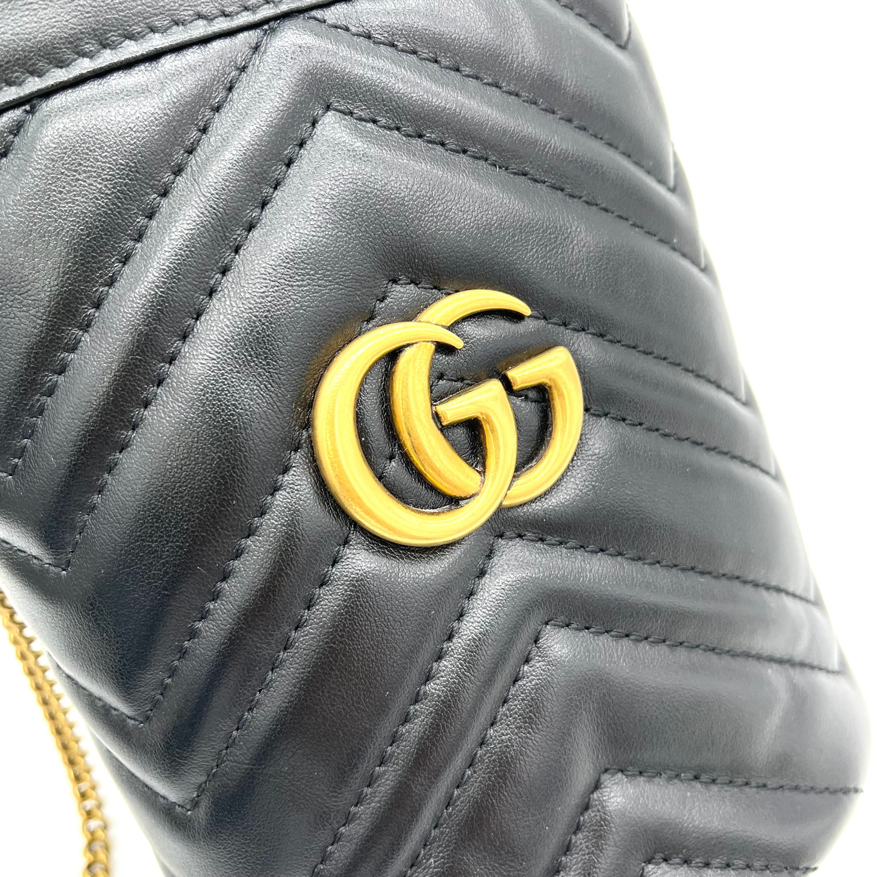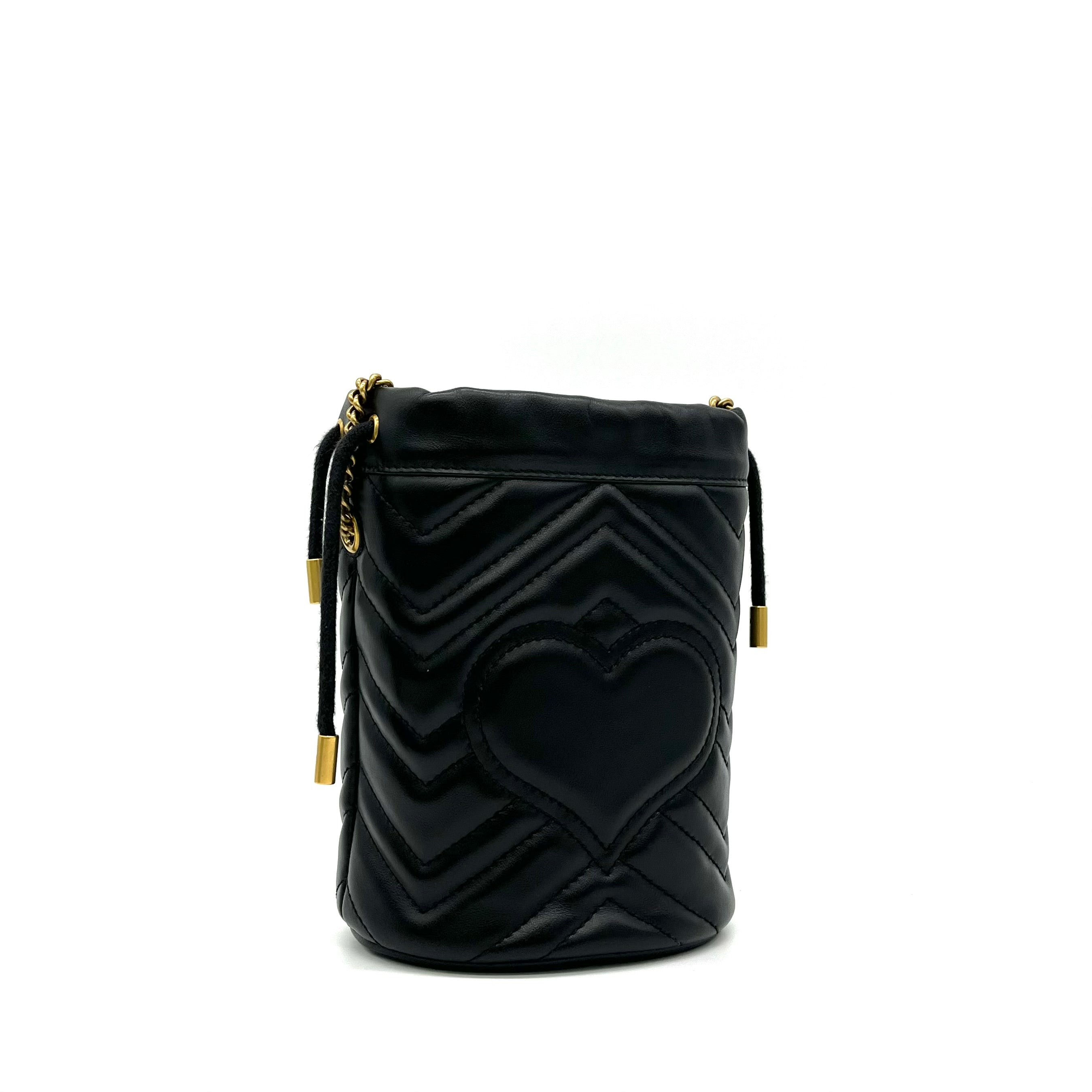 This is an authentic GUCCI Calfskin Matelasse Mini GG Marmont 2.0 Bucket Bag in Black. This structured bucket bag is crafted of soft chevron-quilted calfskin leather in black, with a heart stitched on the back. The bag features an optional aged gold chain shoulder strap, a top cinch cord, and an aged gold Gucci GG logo on the front. The top is open to a beige microfiber interior with leather card slots, and a removable key ring. This is a lovely shoulder bag, suitable for everyday use, from Gucci!