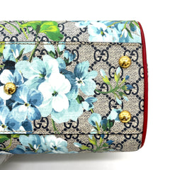 This is an authentic GUCCI GG Supreme Monogram Blooms Small Boston in Beige, Blue Navy, and Hibiscus Red. This stunning handbag is crafted of Gucci GG monogram coated canvas with a vibrant blue floral overlay. The bag features red leather trim, top handles, and an optional shoulder strap with brass hardware. The top zipper opens to a beige suede interior with zipper and patch pockets.
