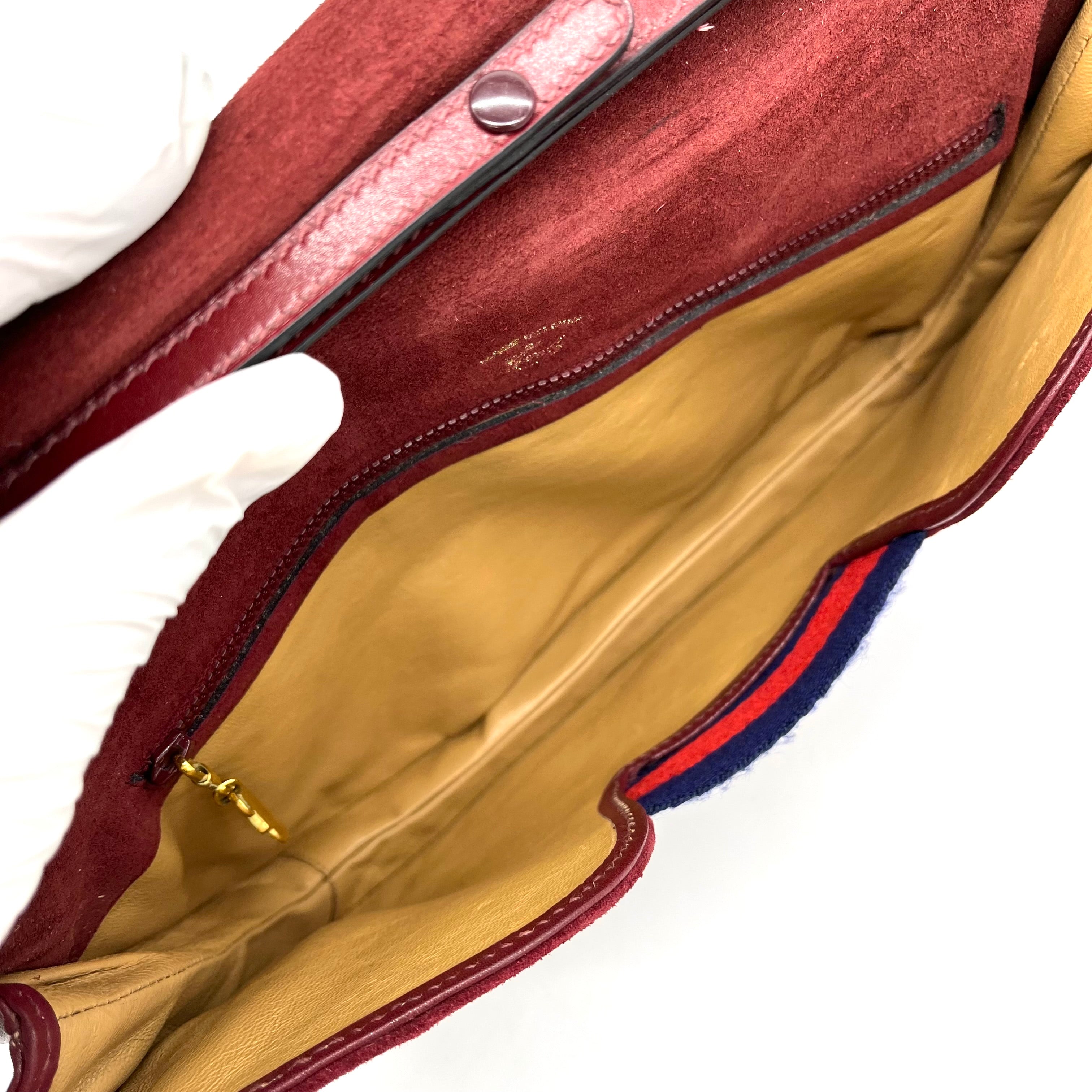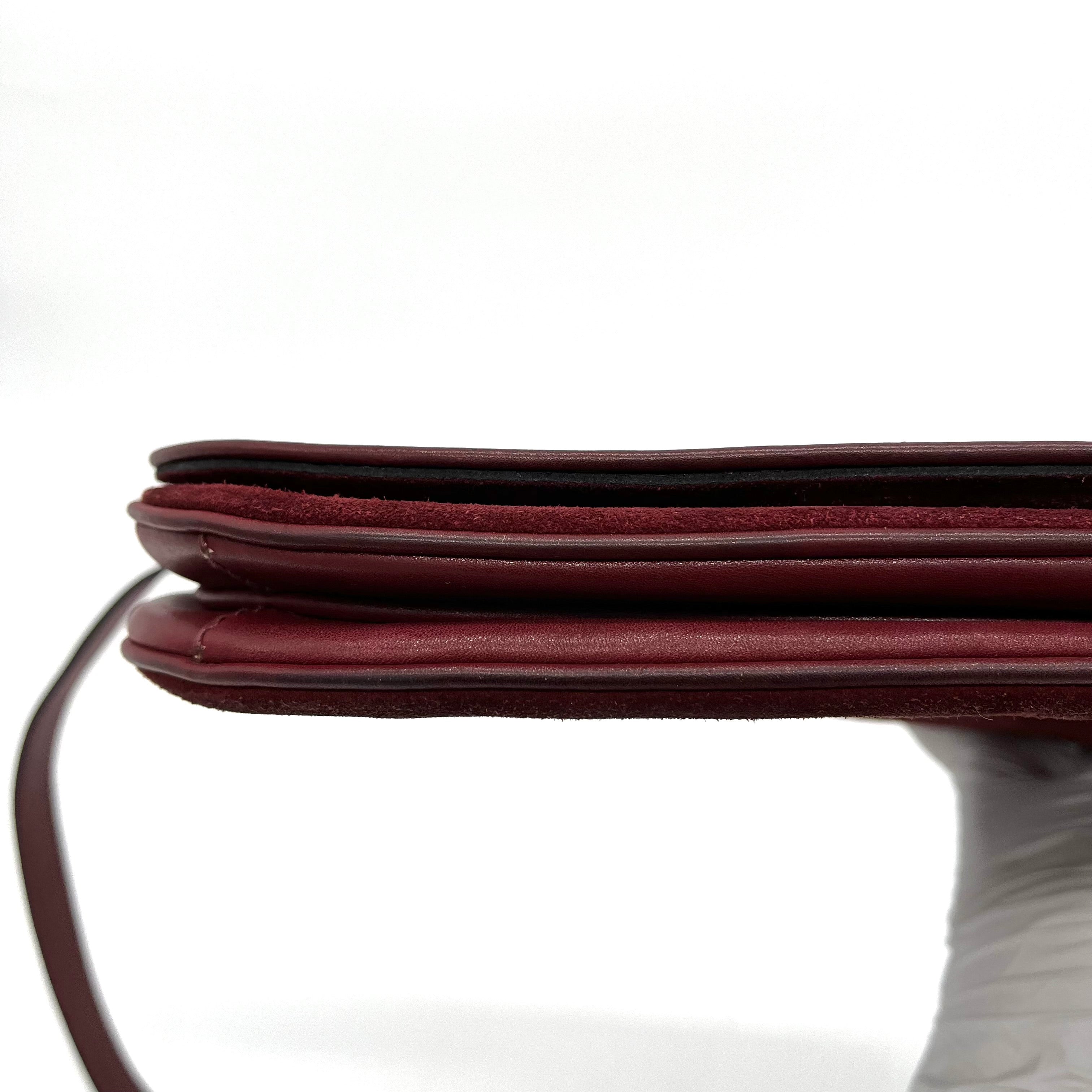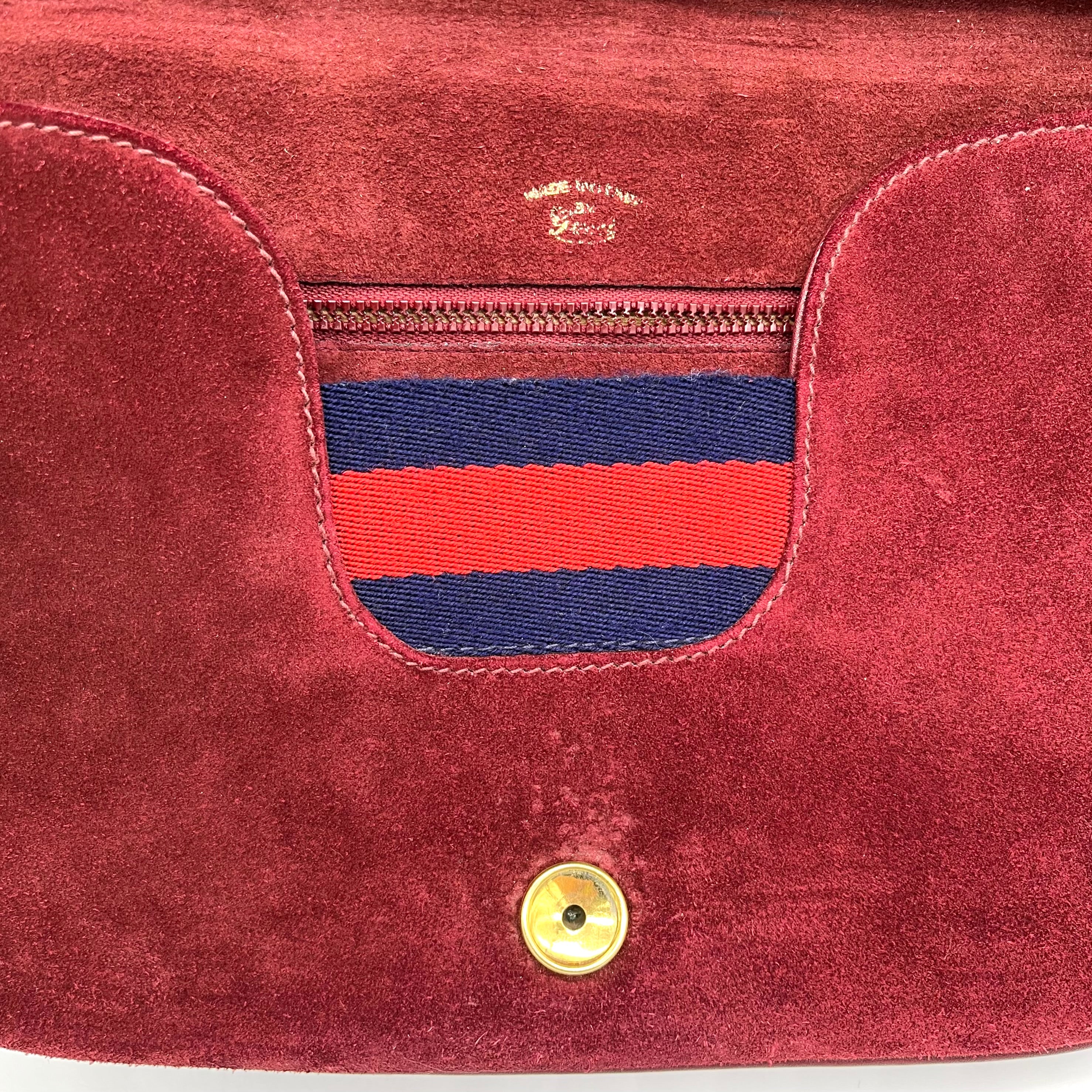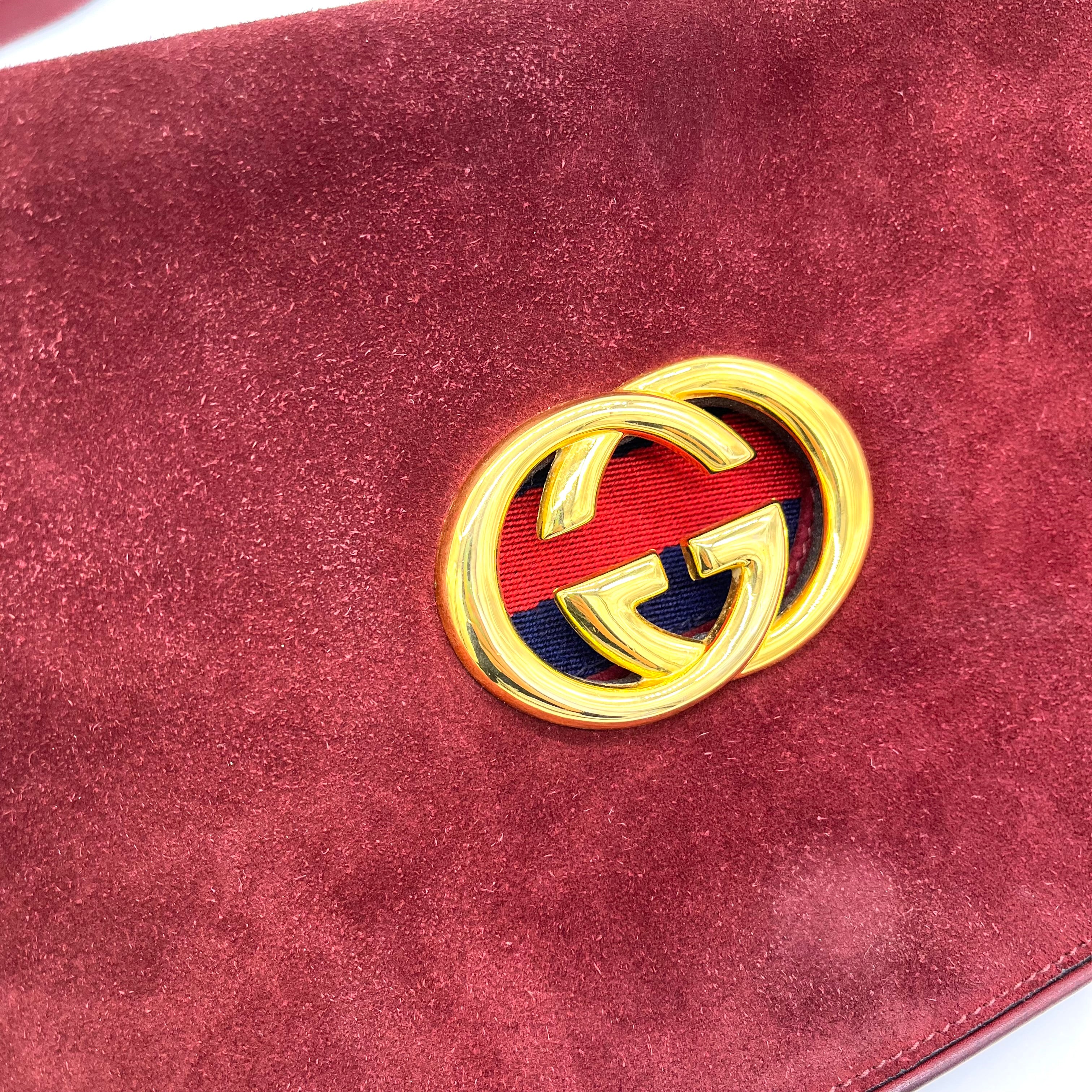 This is an authentic GUCCI Red GG Logo Shoulder Bag suede Vintage. This half moon structure bag is crafted with suede in burgundy. The hardware is gold with Gucci GG front and the trap is calfskin burgundy leather. The gold buckle opened with simple click with elegant GG gold hardware. This casual GUCCI Red GG Logo Shoulder Bag suede Vintage will bring you nostalgia mood!